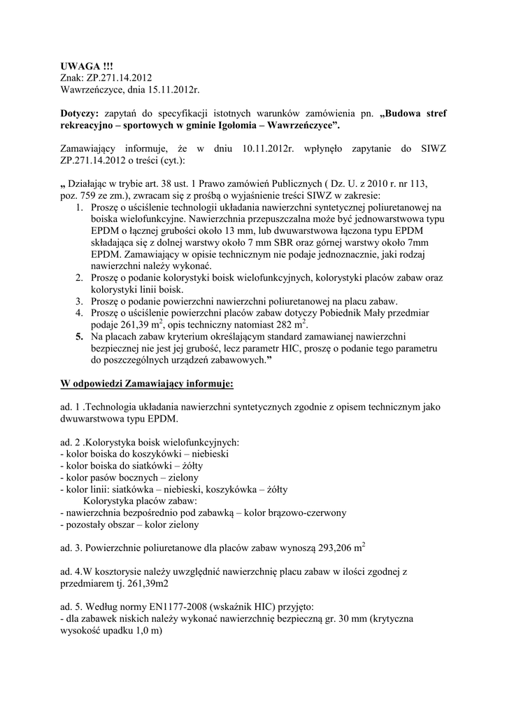 UWAGA !!! Znak: ZP.271.14.2012 Wawrzeńczyce, dnia 15.11.2012r. Dotyczy: zapytań do specyfikacji istotnych warunków zamówienia pn. „Budowa stref rekreacyjno – sportowych w gminie Igołomia – Wawrzeńczyce”. Zamawiający informuje, że w dniu 10.11.2012r. wpłynęło zapytanie do SIWZ ZP.271.14.2012 o treści (cyt.): „ Działając w trybie art. 38 ust. 1 Prawo zamówień Publicznych ( Dz. U. z 2010 r. nr 113, poz. 759 ze zm.), zwracam się z prośbą o wyjaśnienie treści SIWZ w zakresie: 1. Proszę o uściślenie technologii układania nawierzchni syntetycznej poliuretanowej na boiska wielofunkcyjne. Nawierzchnia przepuszczalna może być jednowarstwowa typu EPDM o łącznej grubości około 13 mm, lub dwuwarstwowa łączona typu EPDM składająca się z dolnej warstwy około 7 mm SBR oraz górnej warstwy około 7mm EPDM. Zamawiający w opisie technicznym nie podaje jednoznacznie, jaki rodzaj nawierzchni należy wykonać. 2. Proszę o podanie kolorystyki boisk wielofunkcyjnych, kolorystyki placów zabaw oraz kolorystyki linii boisk. 3. Proszę o podanie powierzchni nawierzchni poliuretanowej na placu zabaw. 4. Proszę o uściślenie powierzchni placów zabaw dotyczy Pobiednik Mały przedmiar podaje 261,39 m2, opis techniczny natomiast 282 m2. 5. Na placach zabaw kryterium określającym standard zamawianej nawierzchni bezpiecznej nie jest jej grubość, lecz parametr HIC, proszę o podanie tego parametru do poszczególnych urządzeń zabawowych.” W odpowiedzi Zamawiający informuje: ad. 1 .Technologia układania nawierzchni syntetycznych zgodnie z opisem technicznym jako dwuwarstwowa typu EPDM. ad. 2 .Kolorystyka boisk wielofunkcyjnych: - kolor boiska do koszykówki – niebieski - kolor boiska do siatkówki – żółty - kolor pasów bocznych – zielony - kolor linii: siatkówka – niebieski, koszykówka – żółty Kolorystyka placów zabaw: - nawierzchnia bezpośrednio pod zabawką – kolor brązowo-czerwony - pozostały obszar – kolor zielony ad. 3. Powierzchnie poliuretanowe dla placów zabaw wynoszą 293,206 m2 ad. 4.W kosztorysie należy uwzględnić nawierzchnię placu zabaw w ilości zgodnej z przedmiarem tj. 261,39m2 ad. 5. Według normy EN1177-2008 (wskaźnik HIC) przyjęto: - dla zabawek niskich należy wykonać nawierzchnię bezpieczną gr. 30 mm (krytyczna wysokość upadku 1,0 m) - dla zabawek wysokich należy wykonać nawierzchnię bezpieczną gr. 65 mm (krytyczna wysokość upadku 2,0m) Zamawiający informuje, że w dniu 12.11.2012r. wpłynęło zapytanie do SIWZ ZP.271.14.2012 o treści (cyt.): „ Przedmiar na zadanie: - budowa boiska koszykówki i siatkówki o nawierzchni syntetycznej, służącego rekreacji i budowa placu zabaw dla dzieci na działkach nr 309/5 i 310/3 obręb Rudno Górne; 1. roboty pomiarowe są podane tylko powierzchnia do wyłączenia z produkcji rolnej; 2. chodniki i place z kostki brukowej gr. 8cm. W ilości 282,2m2 nie istnieją w projekcie – czy mają być wykonane jeśli tak to w którym miejscu? 3. brak w pozycjach przedmiaru do wyceny wykonania koryt i podbudowy pod nawierzchnie boiska w ilości 510m2 4. brak pozycji obejmującej podbudowę pod chodniki placu zabaw 5. zgodnie z projektem inwestor wykazał powierzchnię placu zabaw 282,2m2 natomiast przedmiar wskazuje pow. 293,206m2, a biorąc pod uwagę wykaz zabawek z projektu (firma RODO) powierzchnia stref upadku dla w/w zabawek powinna wynosić 302,32m2 (minimalne powierzchnie stref bezpieczeństwa dla poszczególnych zabawek podane są na stronie producenta) 6. nie uwzględniono odwołania liniowego przed boiskiem , co może spowodować zalewanie boiska (teren na dużej skarpie wysokości ok. 4m). - budowa boiska do piłki nożnej o nawierzchni trawiastej, służące rekreacji na działce nr 365/5 obręb Dobranowice; 1. dlaczego roboty pomiarowe i usunięcie warstwy fumusu (10 cm) oraz wykopy na głębokość 20cm wynoszą 2700,71m2, jeżeli zakres projektowany wynosi 1904m2. - budowa boiska do piłki nożnej o nawierzchni trawiastej, służącego rekreacji, budowa placu zabaw dla dzieci i remont nawierzchni utwardzonej na części działki nr 11/3 obręb Pobiednik Mały 1. brak wykonania koryt dla chodników placu zabaw w ilości 69,14m2 2. brak podbudowy dla chodników placu zabaw w ilości 69,14m2 3. zgodnie z projektem inwestor wykazał powierzchnię placu zabaw 282,2m2 natomiast przedmiar wskazuje pow. 261,39m2, a biorąc pod uwagę wykaz zabawek z projektu (firma RODO) powierzchnia stref upadku dla w/w zabawek powinna wynosić 302,32m2 (minimalne powierzchnie stref bezpieczeństwa dla poszczególnych zabawek podane są na stronie producenta). Ilość i rodzaj montowanych zabawek iest identyczna jak w przypadku placu zabaw w Rudnie Górnym – z czego wynika różnica w przedmiarach? Opis w/w nawierzchni podaje sztuczną trawę a zgodnie z projektem wymagana jest nawierzchnia syntetyczna. 4. Brak wykonania podbudowy pod kostkę na plac o pow. 376,07m 5. błędne wyliczenie ilości humusu do usunięcia – winno być 6419,00m2minus 376,07m2 - budowa boiska do piłki nożnej o nawierzchni trawiastej, służącego rekreacji na działce nr 315/2 obręb Koźlica; 1. teren bardzo podmokły – roślinność terenu bardzo podmokłego, w związku z tym brak możliwości zdrenowania terenu (bezpośrednia bliskość rzeki Wisły). Wydaje się możliwe wykonanie boiska po podniesieniu terenu gruntem nasypowym o ok.0,5 do 1m 2. niezgodność sumowania pow. boiska i terenów przyległych – boisko trawa z rolki 874,31m2 a wysiew trawy powinien być 1274,04 minus 874,31 - budowa boiska do koszykówki i siatkówki o nawierzchni syntetycznej, służącego rekreacji na części działki nr 82/4 obręb Tropiszów. 1. w projekcie opis naw. boiska jest asfaltowy a ma być syntetyczny 2. brak wykonania koryt pod boisko wielofunkcyjne 3. brak wykonania koryt dla chodników – jest tylko na gł. 10cm. a podbudowa plus kostka wyniesie 36cm – jaka jest prawidłowa gł. wykonan