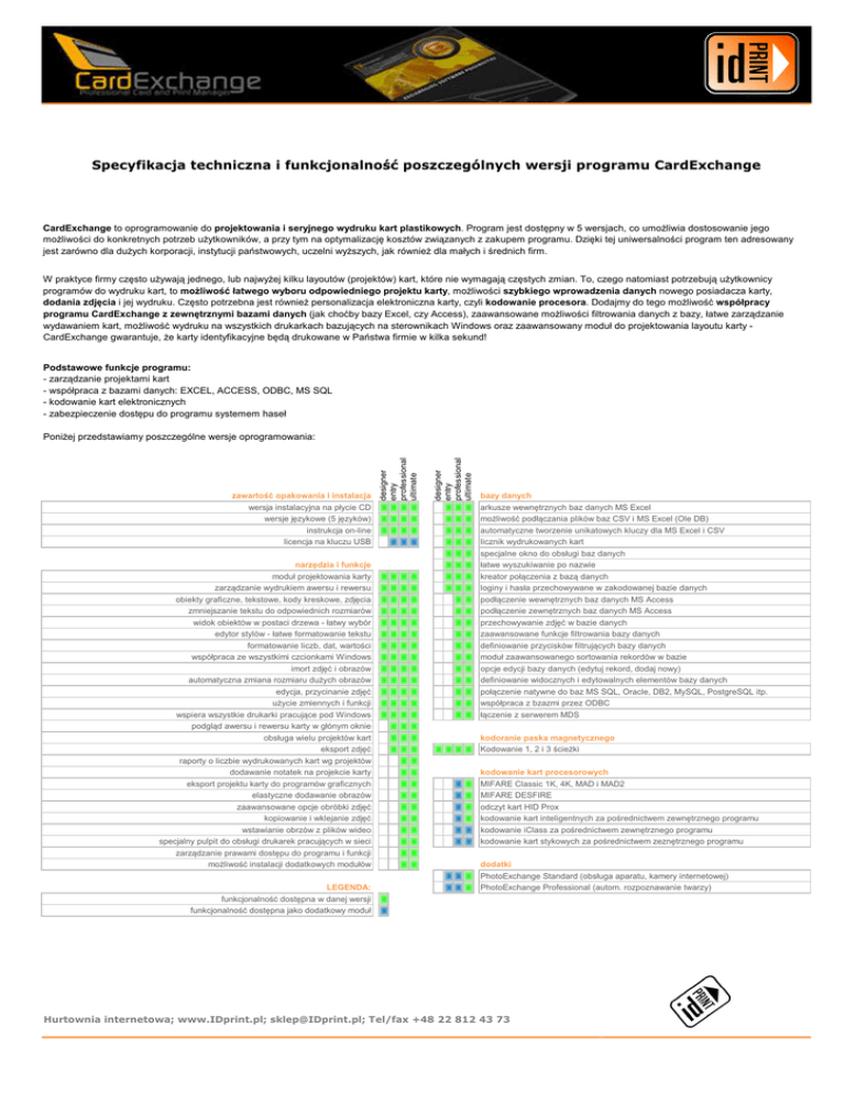 Specyfikacja techniczna i funkcjonalność poszczególnych wersji programu CardExchange CardExchange to oprogramowanie do projektowania i seryjnego wydruku kart plastikowych. Program jest dostępny w 5 wersjach, co umożliwia dostosowanie jego możliwości do konkretnych potrzeb użytkowników, a przy tym na optymalizację kosztów związanych z zakupem programu. Dzięki tej uniwersalności program ten adresowany jest zarówno dla dużych korporacji, instytucji państwowych, uczelni wyższych, jak również dla małych i średnich firm. W praktyce firmy często używają jednego, lub najwyżej kilku layoutów (projektów) kart, które nie wymagają częstych zmian. To, czego natomiast potrzebują użytkownicy programów do wydruku kart, to możliwość łatwego wyboru odpowiedniego projektu karty, możliwości szybkiego wprowadzenia danych nowego posiadacza karty, dodania zdjęcia i jej wydruku. Często potrzebna jest również personalizacja elektroniczna karty, czyli kodowanie procesora. Dodajmy do tego możliwość współpracy programu CardExchange z zewnętrznymi bazami danych (jak choćby bazy Excel, czy Access), zaawansowane możliwości filtrowania danych z bazy, łatwe zarządzanie wydawaniem kart, możliwość wydruku na wszystkich drukarkach bazujących na sterownikach Windows oraz zaawansowany moduł do projektowania layoutu karty CardExchange gwarantuje, że karty identyfikacyjne będą drukowane w Państwa firmie w kilka sekund! Podstawowe funkcje programu: - zarządzanie projektami kart - współpraca z bazami danych: EXCEL, ACCESS, ODBC, MS SQL - kodowanie kart elektronicznych - zabezpieczenie dostępu do programu systemem haseł narzędzia i funkcje moduł projektowania karty zarządzanie wydrukiem awersu i rewersu obiekty graficzne, tekstowe, kody kreskowe, zdjęcia zmniejszanie tekstu do odpowiednich rozmiarów widok obiektów w postaci drzewa - łatwy wybór edytor stylów - łatwe formatowanie tekstu formatowanie liczb, dat, wartości współpraca ze wszystkimi czcionkami Windows imort zdjęć i obrazów automatyczna zmiana rozmiaru dużych obrazów edycja, przycinanie zdjęć użycie zmiennych i funkcji wspiera wszystkie drukarki pracujące pod Windows podgląd awersu i rewersu karty w głónym oknie obsługa wielu projektów kart eksport zdjęć raporty o liczbie wydrukowanych kart wg projektów dodawanie notatek na projekcie karty eksport projektu karty do programów graficznych elastyczne dodawanie obrazów zaawansowane opcje obróbki zdjęć kopiowanie i wklejanie zdjęć wstawianie obrzów z plików wideo specjalny pulpit do obsługi drukarek pracujących w sieci zarządzanie prawami dostępu do programu i funkcji możliwość instalacji dodatkowych modułów LEGENDA: funkcjonalność dostępna w danej wersji funkcjonalność dostępna jako dodatkowy moduł designer entry professional ultimate zawartość opakowania i instalacja wersja instalacyjna na płycie CD wersje językowe (5 języków) instrukcja on-line licencja na kluczu USB designer entry professional ultimate Poniżej przedstawiamy poszczególne wersje oprogramowania: bazy danych arkusze wewnętrznych baz danych MS Excel możliwość podłączania plików baz CSV i MS Excel (Ole DB) automatyczne tworzenie unikatowych kluczy dla MS Excel i CSV licznik wydrukowanych kart specjalne okno do obsługi baz danych łatwe wyszukiwanie po nazwie kreator połączenia z bazą danych loginy i hasła przechowywane w zakodowanej bazie danych podłączenie wewnętrznych baz danych MS Access podłączenie zewnętrznych baz danych MS Access przechowywanie zdjęć w bazie danych zaawansowane funkcje filtrowania bazy danych definiowanie przycisków filtrujących bazy danych moduł zaawansowanego sortowania rekordów w bazie opcje edycji bazy danych (edytuj rekord, dodaj nowy) definiowanie widocznych i edytowalnych elementów bazy danych połączenie natywne do baz MS SQL, Oracle, DB2, MySQL, PostgreSQL itp. współpraca z bzazmi przez ODBC łączenie z serwerem MDS kodoranie paska magnetycznego Kodowanie 1, 2 i 3 ścieżki kodowanie kart procesorowych MIFARE Classic 1K, 4K, MAD i MAD2 MIFARE DESFIRE odczyt kart HID Prox kodowanie kart inteligentnych za pośrednictwem zewnętrznego programu kodowanie iClass za pośrednictwem zewnętrznego programu kodowanie kart stykowych za pośrednictwem zeznętrznego programu dodatki PhotoExchange Standard (obsługa aparatu, kamery internetowej) PhotoExchange Professional (autom. rozpoznawanie twarzy) Hurtownia internetowa; www.IDprint.pl; [email protected]; Tel/fax +48 22 812 43 73