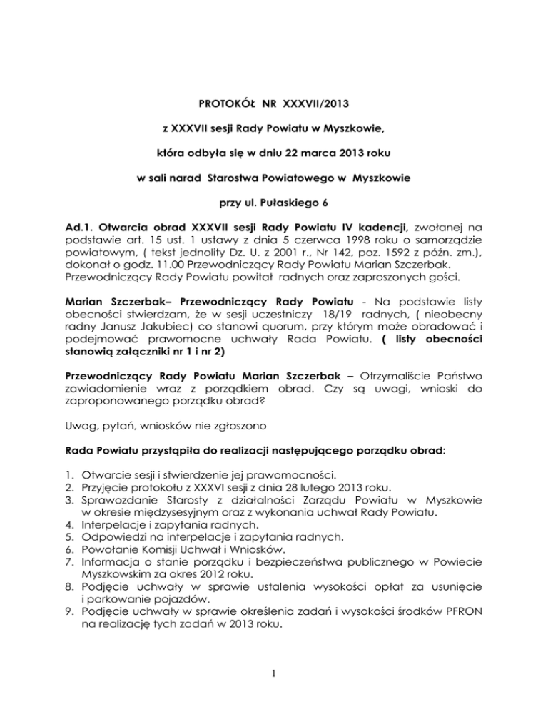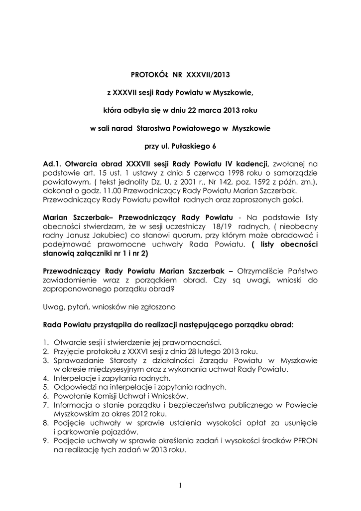 PROTOKÓŁ NR XXXVII/2013 z XXXVII sesji Rady Powiatu w Myszkowie, która odbyła się w dniu 22 marca 2013 roku w sali narad Starostwa Powiatowego w Myszkowie przy ul. Pułaskiego 6 Ad.1. Otwarcia obrad XXXVII sesji Rady Powiatu IV kadencji, zwołanej na podstawie art. 15 ust. 1 ustawy z dnia 5 czerwca 1998 roku o samorządzie powiatowym, ( tekst jednolity Dz. U. z 2001 r., Nr 142, poz. 1592 z późn. zm.), dokonał o godz. 11.00 Przewodniczący Rady Powiatu Marian Szczerbak. Przewodniczący Rady Powiatu powitał radnych oraz zaproszonych gości. Marian Szczerbak– Przewodniczący Rady Powiatu - Na podstawie listy obecności stwierdzam, że w sesji uczestniczy 18/19 radnych, ( nieobecny radny Janusz Jakubiec) co stanowi quorum, przy którym może obradować i podejmować prawomocne uchwały Rada Powiatu. ( listy obecności stanowią załączniki nr 1 i nr 2) Przewodniczący Rady Powiatu Marian Szczerbak – Otrzymaliście Państwo zawiadomienie wraz z porządkiem obrad. Czy są uwagi, wnioski do zaproponowanego porządku obrad? Uwag, pytań, wniosków nie zgłoszono Rada Powiatu przystąpiła do realizacji następującego porządku obrad: 1. Otwarcie sesji i stwierdzenie jej prawomocności. 2. Przyjęcie protokołu z XXXVI sesji z dnia 28 lutego 2013 roku. 3. Sprawozdanie Starosty z działalności Zarządu Powiatu w Myszkowie w okresie międzysesyjnym oraz z wykonania uchwał Rady Powiatu. 4. Interpelacje i zapytania radnych. 5. Odpowiedzi na interpelacje i zapytania radnych. 6. Powołanie Komisji Uchwał i Wniosków. 7. Informacja o stanie porządku i bezpieczeństwa publicznego w Powiecie Myszkowskim za okres 2012 roku. 8. Podjęcie uchwały w sprawie ustalenia wysokości opłat za usunięcie i parkowanie pojazdów. 9. Podjęcie uchwały w sprawie określenia zadań i wysokości środków PFRON na realizację tych zadań w 2013 roku. 1 10. Podjęcie uchwały w sprawie zwiększenia budżetu Powiatu Myszkowskiego na rok 2013. 11. Podjęcie uchwały w sprawie zmian w Wieloletniej Prognozie Finansowej Powiatu Myszkowskiego na lata 2013 – 2016. 12. Podjęcie uchwały w sprawie przyjęcia rezygnacji Pani Zofii Jastrzębskiej z funkcji Wiceprzewodniczącej Rady Powiatu w Myszkowie. 13. Wnioski i oświadczenia radnych. 14. Zamknięcie obrad sesji. Ad.2. Przyjęcie protokołu z XXXVI sesji z dnia 28 lutego 2013 roku. Przewodniczący Rady – Marian Szczerbak – Protokół z XXXVI sesji z dnia 28 lutego 2013 roku był do wglądu w Starostwie Powiatowym w Biurze Rady. Czy są uwagi do protokołu ? Uwag, pytań do ww. protokołu nie zgłoszono. W wyniku głosowania, protokół: z XXXVI sesji z dnia 28 lutego 2013 roku został przyjęty przy 18 głosach "za" (jednogłośnie). Ad. 3. Sprawozdanie Starosty z działalności Zarządu Powiatu w Myszkowie w okresie międzysesyjnym oraz z wykonania uchwał Rady Powiatu. Sprawozdanie z bieżącej działalności Zarządu Powiatu w okresie międzysesyjnym oraz sprawozdanie z wykonania uchwał Rady Powiatu przedstawił Starosta Myszkowski – Wojciech Picheta– ww. sprawozdania stanowią załączniki nr 5 i nr 6 do niniejszego protokołu. Uwag, pytań nie zgłoszono. Ww. sprawozdania zostały przez Radę Powiatu przyjęte jednogłośnie, przy 18 głosach „za”, jednogłośnie. Ad. 4. Interpelacje i zapytania radnych. Marian Szczerbak – Przewodniczący Rady Powiatu - Zgodnie z § 21 i 22 Statutu Powiatu Myszkowskiego, interpelacje mogą być składane w sprawach zasadniczych dla powiatu, natomiast zapytania w sprawach dotyczących bieżących problemów powiatu, w szczególności w celu uzyskania informacji o określonym stanie faktycznym. Radni mogą składać interpelacje na sesji lub w okresie międzysesyjnym. Czas interpelacji ustnej nie może wynosić więcej niż 5 minut, natomiast zapytania nie więcej niż 3 minuty. Proszę Panie i Panów radnych o zgłaszanie interpelacji i zapytań. 2 Rafał Kępski – Mam pytanie dot. działalności Warsztatów Terapii Zajęciowej w Wojsławicach, tam umowa się kończy z końcem maja br. Są obawy związane z funkcjonowaniem tego warsztatu, prosiłbym o przybliżenie tematu. Mariusz Trepka Wicestarosta Myszkowski – Mam pytanie do przewodniczącego Komisji Rozwoju i Rolnictwa – czy w kwietniu planuje pan komisję objazdową, aby zapoznać się ze stanem dróg powiatowych? Mariusz Morawiec – Przewodniczący Komisji Rozwoju i Rolnictwa – W planie pracy nie było zaplanowanej komisji objazdowej, ale jeżeli taka będzie wola radnych, to chętnie zrobimy objazd. Dariusz Lasecki – Mam pytanie do dyrektora Powiatowego Zarządu Drógmamy planowaną budowę dwóch chodników Poraj – Jastrząb i przy ul. Słowackiego w Myszkowie – czy po jednej stronie czy z dwóch stron ? Marian Szczerbak – Przewodniczący Rady Powiatu - Z tego co mi wiadomo na ulicy Słowackiego nie ma chodnika, ani po jednej ani po drugiej stronie. Jadwiga Skalec – Chciałabym zgłosić sprawę panu dyrektorowi Powiatowego Zarządu Dróg, wczoraj odbyła się sesja Rady Gminy w Niegowie, radni z gminy Niegowa wnieśli uwagi co do stanu nawierzchni dróg powiatowych w gminie. Dopiero na koniec kwietnia wypracujemy czy jest potrzeba tej komisji objazdowej. Sołtys z Gorzkowa Starego wniósł na sesji gminy o zamontowanie luster na krzyżówce w Gorzkowie Nowym, że tam zgłaszają mieszkańcy potrzebę zainstalowania luster w celu poprawy bezpieczeństwa w celu zapobiegania kolizjom. Mariusz Morawiec – Mam prośbę, żeby członkowie Komisji Rozwoju i pan dyrektor Pabian zostali na chwilę po sesji, ustalimy termin objazdu dróg. Dariusz Lasecki – Czy zarząd zatwierdził już te planowane inwestycje, chodniki do realizacji w 2013 roku ? Marian Szczerbak – Przewodniczący Rady – Sprawę trzeba omówić z dyrektorem PZD. Zima była długa, poza tym były duże różnice temperatur, dostaliśmy promesę 4,5 mln zł i gdzie byśmy to realizowali ? Ad. 5. Odpowiedzi na interpelacje i zapytania radnych. Wojciech Picheta – 