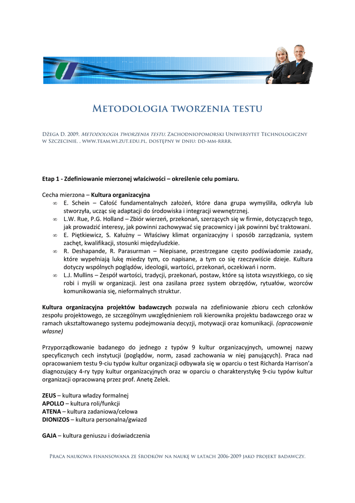 Metodologia tworzenia testu Dżega D. 2009, Metodologia tworzenia testu, testu Zachodniopomorski Uniwersytet Technologiczny w Szczecinie, , www.team.wi.zut.edu.pl, dostępny w dniu: dd-mm-rrrr. Etap 1 - Zdefiniowanie mierzonej właściwości – określenie celu pomiaru. Cecha mierzona – Kultura organizacyjna • E. Schein – Całość fundamentalnych założeń, które dana grupa wymyśliła, odkryła lub stworzyła, ucząc się adaptacji do środowiska i integracji wewnętrznej. • L.W. Rue, P.G. Holland – Zbiór wierzeń, przekonań, szerzących się w firmie, dotyczących tego, jak prowadzić owadzić interesy, jak powinni zachowywać się pracownicy i jak powinni być traktowani. • E. Piętkiewicz, S. Kałużny – Właściwy klimat organizacyjny i sposób zarządzania, system zachęt, kwalifikacji, stosunki międzyludzkie. • R. Deshapande, R. Parasurman – Niepisane, sane, przestrzegane często podświadomie zasady, które wypełniają lukę miedzy tym, co napisane, a tym co się rzeczywiście dzieje. Kultura dotyczy wspólnych poglądów, ideologii, wartości, przekonań, oczekiwań i norm. • L.J. Mullins – Zespół wartości, tradycji, przekonań, postaw, które są istota wszystkiego, co się robi i myśli w organizacji. Jest ona zasilana przez system obrzędów, rytuałów, wzorców komunikowania się, nieformalnych struktur. Kultura organizacyjna projektów badawczych pozwala na zdefiniowanie zbioru cech członków zespołu projektowego, ze szczególnym uwzględnieniem roli kierownika projektu badawczego oraz w ramach ukształtowanego systemu podejmowania decyzji, motywacji oraz komunikacji. (opracowanie własne) Przyporządkowanie wanie badanego do jednego z typów 9 kultur organizacyjnych, umownej nazwy specyficznych cech instytucji (poglądów, norm, zasad zachowania w niej panujących). Praca nad opracowaniem testu 9-ciu ciu typów kultur organizacji odbywała się w oparciu o test Richarda R Harrison’a diagnozujący 4-ry ry typy kultur organizacyjnych oraz w oparciu o charakterystykę 9-ciu 9 typów kultur organizacji opracowaną przez prof. Anetę A Zelek. ZEUS – kultura władzy formalnej APOLLO – kultura roli/funkcji ATENA – kultura zadaniowa/celowa DIONIZOS – kultura personalna/gwiazd GAJA – kultura geniuszu i doświadczenia Praca naukowa finansowana ze środków na naukę w latach 2006-2009 2006 2009 jako projekt badawczy. Metodologia tworzenia testu Dorota Dżega Zachodniopomorski Uniwersytet Technologiczny w Szczecinie Wydział Informatyki HEFAJSTOS – kultura rzemiosła TEMIDA – kultura sprawiedliwości i egalitaryzmu HERMES – kultura konkurencji ARES – kultura konfliktu Etap 2 - Określenie formatu bodźców i formatu odpowiedzi Przygotowanie projektu testu Celem przygotowania projektu testu sporządzono tabelę zawierająca obszary treści oraz obszary manifestacji – wskazanie, gdzie i w jaki sposób mogą przejawiać się określone obszary treści. Na potrzeby określenia kultury organizacji preferowanej przez kandydatów do zespołów projektowych wyznaczono obszary treści opisane obszarami manifestacji – tabela 1. Szczegółowy projekt testu zawiera zestawienie pt. „Cechy 9-ciu Kultur Organizacji” opracowanych przez Zespół w składzie: A. Dziurzańska, D. Dżega, A. Śmigielska-Kaczmarek, A. Worach. Określenie formatu pozycji testowych Na podstawie zdefiniowania mierzonej właściwości oraz szczegółowego projektu testu przyjęto stosowanie zamkniętego formatu pozycji testowych (ang. select-response format). Kolejny krok polegał na wyborze sposobu reprezentacji pozycji testowych: • pozycji alternatywnych (ang. alternate choise) – twierdzenia lub pytania zawierające dwie możliwości odpowiedzi typu: „Prawda” - „Fałsz” lub „Tak” - „Nie”. Pozycje alternatywne znajdują zastosowanie w testach umiejętności (testach właściwości poznawczych) oraz w testach osobowości (testach właściwości afektywnych). Przy konstrukcji pozycji testowych należy dołożyć szczególnej staranności do prostoty języka, unikania sformułowań w postaci przeczeń lub • pozycji punktowanych – przydzielanie punktów przez osobę badaną odzwierciedlające poglądy oraz odczucia badanego w ramach zdefiniowanej skali punktowej. Pozycje punktowane znalazły zastosowanie w teście autorstwa Rogera Harrisona „Diagnozowanie kultury organizacyjnej”, stanowiącym inspirację do opracowania testu badającego kultury organizacji w projektach badawczych. Na podstawie badań Zawadzkiego oraz Strelau (1997) jako rodzaj pytań wybrano pytania zamknięte z alternatywna opcją odpowiedzi „Tak” – „Nie”. Podobnie jak w wyżej wymienionej pracy badaniu kultury organizacyjnej zespołu projektowego poddawani będą członkowie zespołów projektów badawczych – osoby dorosłe w przedziale wieku 25 – 70. Ramy przedziału wiekowego zostały określone na podstawie obserwacji składów osobowych projektów badawczych. Charakter pracy członków zespołów projektów badawczych charakteryzuje dysponowanie przede wszystkim ograniczonym czasem. Strona | 2 Dżega D. 2009, Metodologia tworzenia testu, Zachodniopomorski Uniwersytet Technologiczny w Szczecinie, www.team.wi.zut.edu.pl, dostępny w dniu: dd-mm-rrrr. Metodologia tworzenia testu Dorota Dżega Zachodniopomorski Uniwersytet Technologiczny w Szczecinie Wydział Informatyki Tab. 1 Ogólny projekt testu na określenie kultury organizacyjnej zespołu projektowego Obszary treści Obszary manifestacji Cechy typowego Cechy osobiste Cechy ogólne kierownika zespołu Cechy typowego członka zespołu Cechy osobiste Najwyższy priorytet Priorytety członka zespołu własne Profil osoby odnoszącej sukces w Cechy osobiste zespole Podejście zespołu do Podmiotowo członka zespołu (osobowo) Sposób wywierania System wpływu na członków nadzoru zespołu Sposób kontrolowania rezultatów pracy Kontrola Stosunek do pracy zespołowej Priorytety zespołu Stosunek do zesp