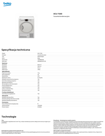 DCU 7330 Suszarka kondensacyjna Specyfikacja techniczna Model: DCU 7330 Produkt: Suszarka do ubrań Typ: Wolnostojąca Kolor: Biały Stock Code: 7187981200 EAN Code: 8690842347139 Wymiary Wysokość: 84,6 cm Szerokość: 59,5 cm Głębokość: 54 cm Waga netto: 36 kg Specyfikacja Pojemność wsadu : 7 kg Ilość programów: 16 Wyświetlacz: LCD Opóźnienie startu : 0-24 godz. Wskaźnik czasu do końca programu: Tak Kontrolki przebiegu programu: Tak Blokada przed dziećmi: Tak Obroty bębna w dóch kierunkach: Tak Program BabyProtect: Tak Sygnał dźwiękowy: Tak Łatwe w obsłudze filtry: Tak Oświetlenie bębna: Tak Funkcje dodatkowe Automatyczne wygładzanie: Tak Wskaźniki Wskaźnik wymiany filtra: Tak Wskaźnik pełnego zbiornika na wodę: Tak Wskaźnik blokady przed dziećmi: Tak Parametry Klasa efektywności energetycznej: B Zużycie energii : 3,92 kWh Poziom hałasu : 65 dB(A) Technologie 7 kg Suszarki Beko mają ładowność aż do 7 kg, co daje swobodę wysuszenia całego prania zaraz po wyjęciu go z pralki Beko. FlexySense - Automatyczny czujnik suszenia Suszarki Beko z automatycznym czujnikiem suszenia ułatwiają dostosowanie poziomu wilgoci oraz dobranie optymalnej temperatury. Dzięki czujnikowi FlexySense nie musisz zgadywać ile czasu zajmie suszenie wystarczy wybrać żądany stopień suszenia a suszarka zatrzyma się w momencie osiągnięcia wybranego poziomu. Czujnik wilgoci jest odpowiedzialny za to, aby pranie suszyło się równomiernie.Co wyróżnia FlexySense od innych czujników to jego wysoka jakość: podczas programu suszenia "Gotowe do prasowania" osiągany jest taki sam poziom dokładnego suszenia podczas każdego z cykli, niezależnie od załadunku czy stopnia twardości wody. Automatyczny system przeciw gnieceniu się Wszystkie suszarki Beko są wyposażone w specjalna funkcję zapobiegającą gnieceniu się rzeczy podczas suszenia dzięki delikatnym ruchom bębna. Obroty bębna w dwóch kierunkach Wszystkie suszarki Beko są wyposażone w bęben, który wykonuje obroty w obydwie strony. Zapewnia to jednolite suszenie oraz zapobiega gnieceniu się rzeczy. Duże drzwi 38 cm Szerokie na 38 cm drzwi zapewniają łatwy dostęp podczas ładowania oraz wyjmowania wysuszonych rzeczy, nawet tak dużych jak pościel czy koce. Sygnał dźwiękowy Dźwiękowy sygnał rozlega się w momencie zakończenia się suszenia. Można go wyłączyć w każdej chwili. Program do suszenia koszul Podczas suszenia koszul mogą one ulec zniszczeniu a ich kolor może wyblaknąć. Program Shirt został specjalnie stworzony aby uniknąć tych problemów. Jest to delikatny cykl suszenia koszul w niskiej temperaturze co zapobiega zniszczeniom tkaniny oraz zachowuje kolor. Dzięki temu możesz cieszyć się ubraniami przez długi czas. Specjalna ochrona delikatnych tkanin Suszarki Beko posiadają specjalny program do tkanin delikatnych, które można bezpiecznie suszyć w niskiej temperaturze i małych obrotach bębna. Program Jeans Standardowe cykle nie zawsze radzą sobie z suszeniem grubszych tkanin, zwłaszcza wzdłuż szwów, gdzie warstwa materiału jest zdecydowanie grubsza. W odpowiedzi na ten problem, Beko opracowało specjalny program Jeans, gwarantujący równomierne wysuszenie odzieży z grubszych tkanin, takich jak dżins i polar. Program Daily Wiemy, że Twój czas jest cenny i że cenisz osiąganie szybkich rezultatów, a Beko robi wszystko, aby zapewnić jak najbardziej efektywne i przyjazne w użytkowaniu produkty. W zgodzie z tą filozofią powstał program Daily, który umożliwia wysuszenie 4 kg prania w zaledwie godzinę. Łącznik pralki z suszarką Tę suszarkę - za pomocą specjalnego łącznika - z łatwością ustawisz na pralce (od 50 cm głębokości). Program BabyProtect: Dzięki czujnikom temperatury i wilgotności, specjalny program BabyProtect precyzyjnie kontroluje warunki panujące wewnątrz bębna, dobierając ustawienia optymalne do suszenia ubranek Twoich dzieci oraz bliskich