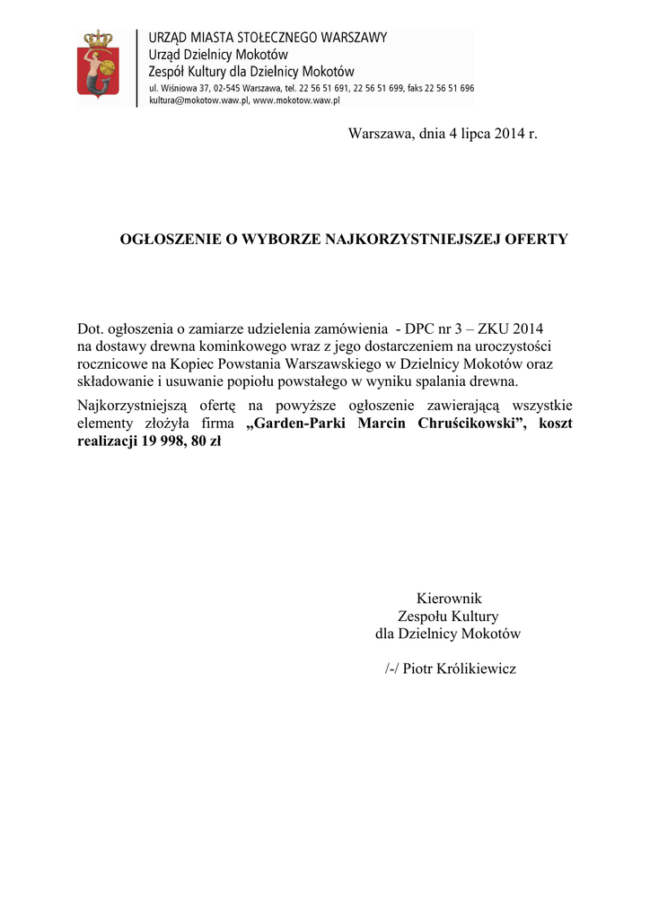Warszawa, dnia 4 lipca 2014 r. OGŁOSZENIE O WYBORZE NAJKORZYSTNIEJSZEJ OFERTY Dot. ogłoszenia o zamiarze udzielenia zamówienia - DPC nr 3 – ZKU 2014 na dostawy drewna kominkowego wraz z jego dostarczeniem na uroczystości rocznicowe na Kopiec Powstania Warszawskiego w Dzielnicy Mokotów oraz składowanie i usuwanie popiołu powstałego w wyniku spalania drewna. Najkorzystniejszą ofertę na powyższe ogłoszenie zawierającą wszystkie elementy złożyła firma „Garden-Parki Marcin Chruścikowski”, koszt realizacji 19 998, 80 zł Kierownik Zespołu Kultury dla Dzielnicy Mokotów /-/ Piotr Królikiewicz