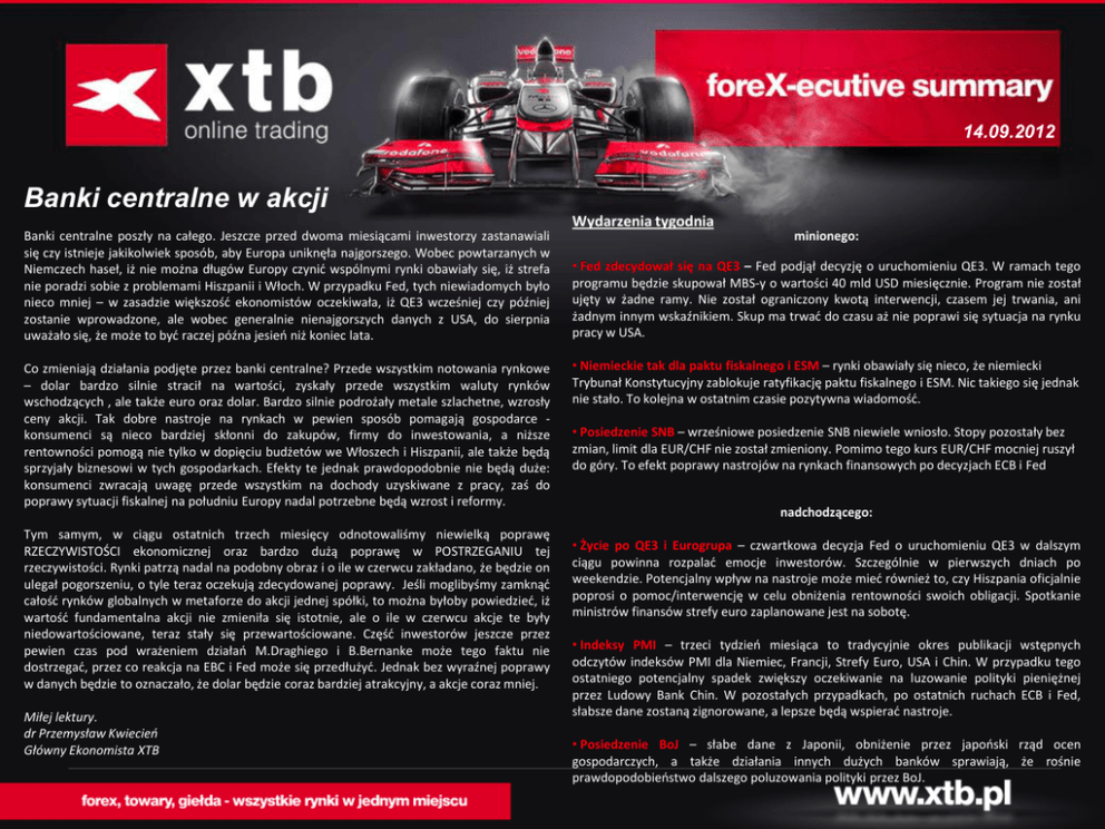 14.09.2012 Banki centralne w akcji Banki centralne poszły na całego. Jeszcze przed dwoma miesiącami inwestorzy zastanawiali się czy istnieje jakikolwiek sposób, aby Europa uniknęła najgorszego. Wobec powtarzanych w Niemczech haseł, iż nie można długów Europy czynić wspólnymi rynki obawiały się, iż strefa nie poradzi sobie z problemami Hiszpanii i Włoch. W przypadku Fed, tych niewiadomych było nieco mniej – w zasadzie większość ekonomistów oczekiwała, iż QE3 wcześniej czy później zostanie wprowadzone, ale wobec generalnie nienajgorszych danych z USA, do sierpnia uważało się, że może to być raczej późna jesień niż koniec lata. Co zmieniają działania podjęte przez banki centralne? Przede wszystkim notowania rynkowe – dolar bardzo silnie stracił na wartości, zyskały przede wszystkim waluty rynków wschodzących , ale także euro oraz dolar. Bardzo silnie podrożały metale szlachetne, wzrosły ceny akcji. Tak dobre nastroje na rynkach w pewien sposób pomagają gospodarce konsumenci są nieco bardziej skłonni do zakupów, firmy do inwestowania, a niższe rentowności pomogą nie tylko w dopięciu budżetów we Włoszech i Hiszpanii, ale także będą sprzyjały biznesowi w tych gospodarkach. Efekty te jednak prawdopodobnie nie będą duże: konsumenci zwracają uwagę przede wszystkim na dochody uzyskiwane z pracy, zaś do poprawy sytuacji fiskalnej na południu Europy nadal potrzebne będą wzrost i reformy. Tym samym, w ciągu ostatnich trzech miesięcy odnotowaliśmy niewielką poprawę RZECZYWISTOŚCI ekonomicznej oraz bardzo dużą poprawę w POSTRZEGANIU tej rzeczywistości. Rynki patrzą nadal na podobny obraz i o ile w czerwcu zakładano, że będzie on ulegał pogorszeniu, o tyle teraz oczekują zdecydowanej poprawy. Jeśli moglibyśmy zamknąć całość rynków globalnych w metaforze do akcji jednej spółki, to można byłoby powiedzieć, iż wartość fundamentalna akcji nie zmieniła się istotnie, ale o ile w czerwcu akcje te były niedowartościowane, teraz stały się przewartościowane. Część inwestorów jeszcze przez pewien czas pod wrażeniem działań M.Draghiego i B.Bernanke może tego faktu nie dostrzegać, przez co reakcja na EBC i Fed może się przedłużyć. Jednak bez wyraźnej poprawy w danych będzie to oznaczało, że dolar będzie coraz bardziej atrakcyjny, a akcje coraz mniej. Miłej lektury. dr Przemysław Kwiecień Główny Ekonomista XTB Wydarzenia tygodnia minionego: • Fed zdecydował się na QE3 – Fed podjął decyzję o uruchomieniu QE3. W ramach tego programu będzie skupował MBS-y o wartości 40 mld USD miesięcznie. Program nie został ujęty w żadne ramy. Nie został ograniczony kwotą interwencji, czasem jej trwania, ani żadnym innym wskaźnikiem. Skup ma trwać do czasu aż nie poprawi się sytuacja na rynku pracy w USA. • Niemieckie tak dla paktu fiskalnego i ESM – rynki obawiały się nieco, że niemiecki Trybunał Konstytucyjny zablokuje ratyfikację paktu fiskalnego i ESM. Nic takiego się jednak nie stało. To kolejna w ostatnim czasie pozytywna wiadomość. • Posiedzenie SNB – wrześniowe posiedzenie SNB niewiele wniosło. Stopy pozostały bez zmian, limit dla EUR/CHF nie został zmieniony. Pomimo tego kurs EUR/CHF mocniej ruszył do góry. To efekt poprawy nastrojów na rynkach finansowych po decyzjach ECB i Fed nadchodzącego: • Życie po QE3 i Eurogrupa – czwartkowa decyzja Fed o uruchomieniu QE3 w dalszym ciągu powinna rozpalać emocje inwestorów. Szczególnie w pierwszych dniach po weekendzie. Potencjalny wpływ na nastroje może mieć również to, czy Hiszpania oficjalnie poprosi o pomoc/interwencję w celu obniżenia rentowności swoich obligacji. Spotkanie ministrów finansów strefy euro zaplanowane jest na sobotę. • Indeksy PMI – trzeci tydzień miesiąca to tradycyjnie okres publikacji wstępnych odczytów indeksów PMI dla Niemiec, Francji, Strefy Euro, USA i Chin. W przypadku tego ostatniego potencjalny spadek zwiększy oczekiwanie na luzowanie polityki pieniężnej przez Ludowy Bank Chin. W pozostałych przypadkach, po ostatnich ruchach ECB i Fed, słabsze dane zostaną zignorowane, a lepsze będą wspierać nastroje. • Posiedzenie BoJ – słabe dane z Japonii, obniżenie przez japoński rząd ocen gospodarczych, a także działania innych dużych banków sprawiają, że rośnie prawdopodobieństwo dalszego poluzowania polityki przez BoJ. Temat tygodnia: co wypełni rynkową pustkę? Od dobrych trzech miesięcy rynki żyły tematem pomocy ze strony banków centralnych. Banki nie zawiodły rynkowych optymistów i zrobiły nawet więcej niż w ich mocy, aby tylko podtrzymać poprawę nastrojów. Teraz jednak wszystko jest już na stole. Fed może oczywiście mówić, iż w razie czego będzie kupować więcej i szybciej, ale jasnym jest, iż najcięższe działa zostały już wytoczone. Rynki mogą być pod wrażeniem tych poczynań jeszcze przez kilka dni, ale trudno zakładać, iż będą się nimi emocjonować na dłużej – te tematy ewidentnie się kończą. Rynek jednak nie znosi nudy i będzie potrzebował nowego wątku. Problem w tym, że nie ma oczywistego kandydata. Przedstawiamy pięć tematów, w których może być głośniej jeszcze tej jesieni: 1. Grecja – jeszcze w wakacje pisaliśmy o tym, że przed Grecją stoi perspektywa otrzymania dwóch transz na kwotę ponad 60 mld EUR; w czerwcu nie brakowało głosów, iż lepiej pozwolić Grecji zbankrutować, niż angażować po raz kolejny duże kwoty, których można nie odzyskać; teraz te głosy przycichły – czekamy na raport Trojki, miał być we wrześniu, teraz mówi się o październiku; mówi się też o tym, że Grecy mogliby dostać nieco więcej czasu na wprowadzenie niektórych reform, ale więcej pieniędzy już nie; MFW przewiduje nadal, iż Grecja będzie potrzebowała trzeciego pakietu ratunkowego, ale Fundusz nie będzie już w nim uczestniczyć; powrót tematu Grec