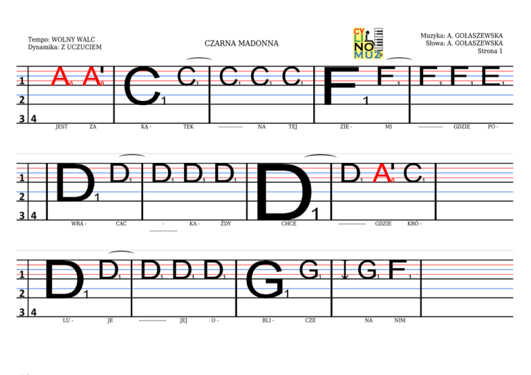 Tempo: WOLNY WALC Dynamika: Z UCZUCIEM JEST ZA KĄ - WRA - LU - Muzyka: A. GOŁASZEWSKA Słowa: A. GOŁASZEWSKA Strona 1 CZARNA MADONNA CAĆ JE TEK ----------------- ----------------- --------------- KA - JEJ NA ŻDY O- TEJ ZIE - CHCE BLI - MI ----------------- CZE NA --------------- GDZIE KRÓ - NIM GDZIE PO - Tempo: WOLNY WALC Dynamika: Z UCZUCIEM Muzyka: A. GOŁASZEWSKA Słowa: A. GOŁASZEWSKA Strona 2 CZARNA MADONNA CIĘ - TE - ----------------- RY - SY SMU - TNY ----------------- ZA - TRO - CHCIA - ŁA ----------------- PRO - SIĆ DWIE SKA - CIĘ ----------------- NY WZROK ------------------ --------------- JAK - BYŚ MA BY W MAT- Tempo: WOLNY WALC Dynamika: Z UCZUCIEM CZY - SIĘ Muzyka: A. GOŁASZEWSKA Słowa: A. GOŁASZEWSKA Strona 3 CZARNA MADONNA NĄ ----------------- JEJ ---------------------------------- O- PIE - ---------------------------------- KĘ ------------------- ------------------------------- MA - O- DDAŁ