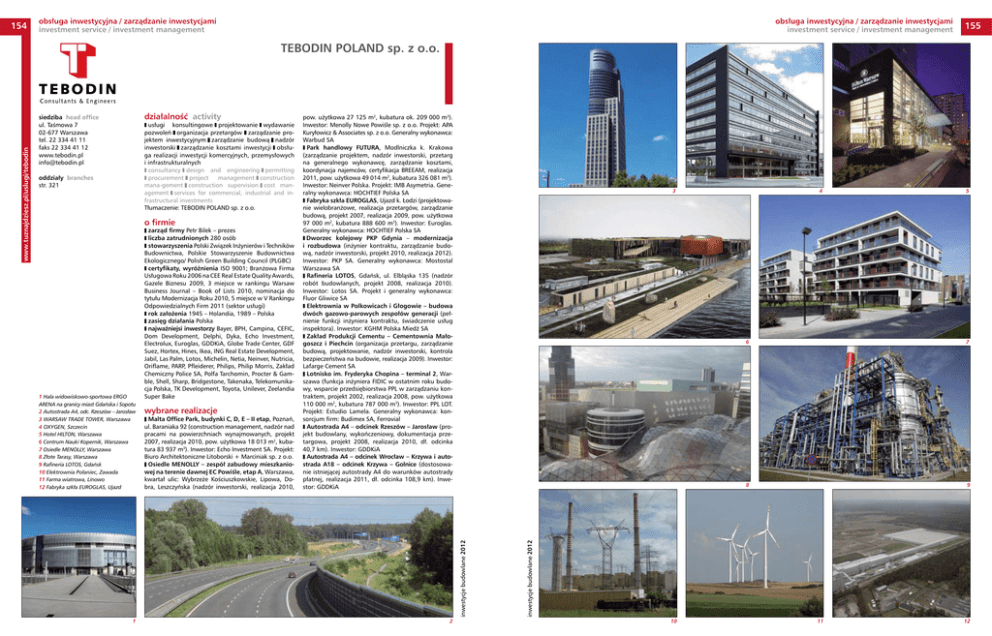 154 obsługa inwestycyjna / zarządzanie inwestycjami investment service / investment management obsługa inwestycyjna / zarządzanie inwestycjami investment service / investment management 155 usługi konsultingowe projektowanie wydawanie pozwoleń organizacja przetargów zarządzanie projektem inwestycyjnym zarządzanie budową nadzór inwestorski zarządzanie kosztami inwestycji obsługa realizacji inwestycji komercyjnych, przemysłowych i infrastrukturalnych consultancy design and engineering permitting procurement project management construction mana-gement construction supervision cost management services for commercial, industrial and infrastructural investments Tłumaczenie: Tebodin Poland sp. z o.o. oddziały branches str. 321 o firmie 1 Hala widowiskowo-sportowa ERGO ARENA na granicy miast Gdańska i Sopotu 2 Autostrada A4, odc. Rzeszów – Jarosław 3 Warsaw Trade Tower, Warszawa 4 Oxygen, Szczecin 5 Hotel HILTON, Warszawa 6 Centrum Nauki Kopernik, Warszawa 7 Osiedle MENOLLY, Warszawa 8 Złote Tarasy, Warszawa 9 Rafineria LOTOS, Gdańsk 10 Elektrownia Połaniec, Zawada 11 Farma wiatrowa, Linowo 12 Fabryka szkła Euroglas, Ujazd zarząd firmy Petr Bilek – prezes liczba zatrudnionych 280 osób stowarzyszenia Polski Związek Inżynierów i Techników Budownictwa, Polskie Stowarzyszenie Budownictwa Ekologicznego/ Polish Green Building Council (PLGBC) certyfikaty, wyróżnienia ISO 9001; Branżowa Firma Usługowa Roku 2006 na CEE Real Estate Quality Awards, Gazele Biznesu 2009, 3 miejsce w rankingu Warsaw Business Journal – Book of Lists 2010, nominacja do tytułu Modernizacja Roku 2010, 5 miejsce w V Rankingu Odpowiedzialnych Firm 2011 (sektor usługi) rok założenia 1945 – Holandia, 1989 – Polska zasięg działania Polska najważniejsi inwestorzy Bayer, BPH, Campina, CEFIC, Dom Development, Delphi, Dyka, Echo Investment, Electrolux, Euroglas, GDDKiA, Globe Trade Center, GDF Suez, Hortex, Hines, Ikea, ING Real Estate Development, Jabil, Las Palm, Lotos, Michelin, Netia, Neinver, Nutricia, Oriflame, PARP, Pfleiderer, Philips, Philip Morris, Zakład Chemiczny Police SA, Polfa Tarchomin, Procter & Gamble, Shell, Sharp, Bridgestone, Takenaka, Telekomunikacja Polska, TK Development, Toyota, Unilever, Zeelandia Super Bake wybrane realizacje Malta Office Park, budynki C, D, E – II etap, Poznań, ul. Baraniaka 92 (construction management, nadzór nad pracami na powierzchniach wynajmowanych, projekt 2007, realizacja 2010, pow. użytkowa 18 013 m2, kubatura 83 937 m3). Inwestor: Echo Investment SA. Projekt: Biuro Architektoniczne Litoborski + Marciniak sp. z o.o. Osiedle Menolly – zespół zabudowy mieszkaniowej na terenie dawnej EC Powiśle, etap A, Warszawa, kwartał ulic: Wybrzeże Kościuszkowskie, Lipowa, Dobra, Leszczyńska (nadzór inwestorski, realizacja 2010, pow. użytkowa 27 125 m2, kubatura ok. 209 000 m3). Inwestor: Menolly Nowe Powiśle sp. z o.o. Projekt: APA Kuryłowicz & Associates sp. z o.o. Generalny wykonawca: Warbud SA Park handlowy Futura, Modlniczka k. Krakowa (zarządzanie projektem, nadzór inwestorski, przetarg na generalnego wykonawcę, zarządzanie kosztami, koordynacja najemców, certyfikacja BREEAM, realizacja 2011, pow. użytkowa 49 014 m2, kubatura 326 081 m3). Inwestor: Neinver Polska. Projekt: IMB Asymetria. Generalny wykonawca: HOCHTIEF Polska SA Fabryka szkła EuroglaS, Ujazd k. Łodzi (projektowanie wielobranżowe, realizacja przetargów, zarządzanie budową, projekt 2007, realizacja 2009, pow. użytkowa 97 000 m2, kubatura 888 600 m3). Inwestor: Euroglas. Generalny wykonawca: Hochtief Polska SA Dworzec kolejowy PKP Gdynia – modernizacja i rozbudowa (inżynier kontraktu, zarządzanie budową, nadzór inwestorski, projekt 2010, realizacja 2012). Inwestor: PKP SA. Generalny wykonawca: Mostostal Warszawa SA Rafineria LOTOS, Gdańsk, ul. Elbląska 135 (nadzór robót budowlanych, projekt 2008, realizacja 2010). Inwestor: Lotos SA. Projekt i generalny wykonawca: Fluor Gliwice SA Elektrownia w Polkowicach i Głogowie – budowa dwóch gazowo-parowych zespołów generacji (pełnienie funkcji inżyniera kontraktu, świadczenie usług inspektora). Inwestor: KGHM Polska Miedź SA Zakład Produkcji Cementu – Cementownia Małogoszcz i Piechcin (organizacja przetargu, zarządzanie budową, projektowanie, nadzór inwestorski, kontrola bezpieczeństwa na budowie, realizacja 2009). Inwestor: Lafarge Cement SA Lotnisko im. Fryderyka Chopina – terminal 2, Warszawa (funkcja inżyniera FIDIC w ostatnim roku budowy, wsparcie przedsiębiorstwa PPL w zarządzaniu kontraktem, projekt 2002, realizacja 2008, pow. użytkowa 110 000 m2, kubatura 787 000 m3). Inwestor: PPL LOT. Projekt: Estudio Lamela. Generalny wykonawca: konsorcjum firm: Budimex SA, Ferrovial Autostrada A4 – odcinek Rzeszów – Jarosław (projekt budowlany, wykończeniowy, dokumentacja przetargowa, projekt 2008, realizacja 2010, dł. odcinka 40,7 km). Inwestor: GDDKiA Autostrada A4 – odcinek Wrocław – Krzywa i autostrada A18 – odcinek Krzywa – Golnice (dostosowanie istniejącej autostrady A4 do warunków autostrady płatnej, realizacja 2011, dł. odcinka 108,9 km). Inwestor: GDDKiA 1 2 4 3 5 6 7 8 9 inwestycje budowlane 2012 działalność activity siedziba head office ul. Taśmowa 7 02-677 Warszawa tel. 22 334 41 11 faks 22 334 41 12 www.tebodin.pl [email protected] inwestycje budowlane 2012 www.tuznajdziesz.pl/uslugi/tebodin Tebodin Poland sp. z o.o. 10 11 12