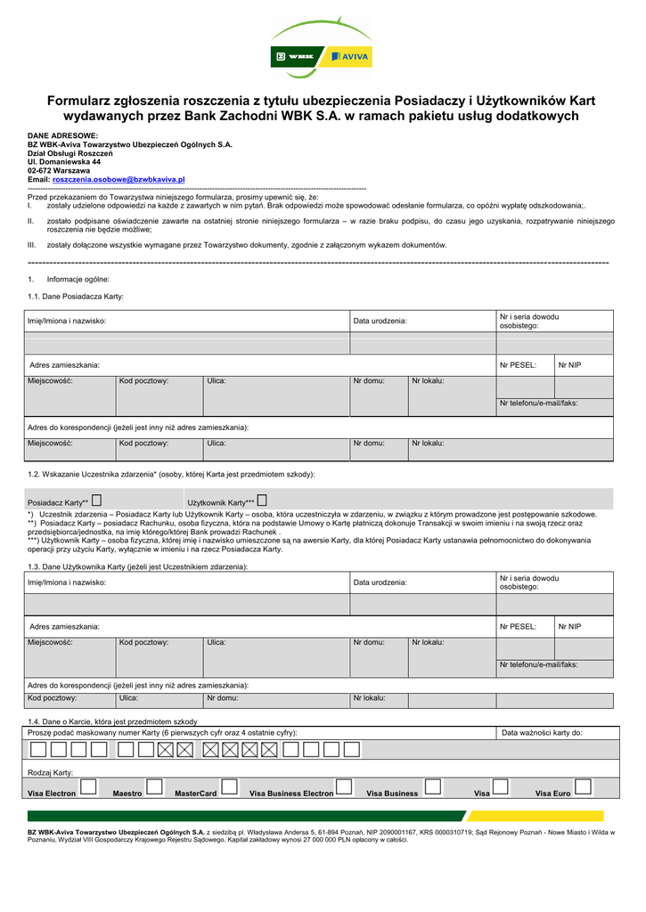 Formularz zgłoszenia roszczenia z tytułu ubezpieczenia Posiadaczy i Użytkowników Kart wydawanych przez Bank Zachodni WBK S.A. w ramach pakietu usług dodatkowych DANE ADRESOWE: BZ WBK-Aviva Towarzystwo Ubezpieczeń Ogólnych S.A. Dział Obsługi Roszczeń Ul. Domaniewska 44 02-672 Warszawa Email: [email protected] -------------------------------------------------------------------------------------------------------------------------------------Przed przekazaniem do Towarzystwa niniejszego formularza, prosimy upewnić się, że: I. zostały udzielone odpowiedzi na każde z zawartych w nim pytań. Brak odpowiedzi może spowodować odesłanie formularza, co opóźni wypłatę odszkodowania;. II. zostało podpisane oświadczenie zawarte na ostatniej stronie niniejszego formularza – w razie braku podpisu, do czasu jego uzyskania, rozpatrywanie niniejszego roszczenia nie będzie możliwe; III. zostały dołączone wszystkie wymagane przez Towarzystwo dokumenty, zgodnie z załączonym wykazem dokumentów. ----------------------------------------------------------------------------------------------------------------------------------------------------------------1. Informacje ogólne: 1.1. Dane Posiadacza Karty: Imię/Imiona i nazwisko: Nr i seria dowodu osobistego: Data urodzenia: Adres zamieszkania: Miejscowość: Nr PESEL: Kod pocztowy: Ulica: Nr domu: Nr NIP Nr lokalu: Nr telefonu/e-mail/faks: Adres do korespondencji (jeżeli jest inny niż adres zamieszkania): Miejscowość: Kod pocztowy: Ulica: Nr domu: Nr lokalu: 1.2. Wskazanie Uczestnika zdarzenia* (osoby, której Karta jest przedmiotem szkody): Użytkownik Karty*** Posiadacz Karty** *) Uczestnik zdarzenia – Posiadacz Karty lub Użytkownik Karty – osoba, która uczestniczyła w zdarzeniu, w związku z którym prowadzone jest postępowanie szkodowe. **) Posiadacz Karty – posiadacz Rachunku, osoba fizyczna, która na podstawie Umowy o Kartę płatniczą dokonuje Transakcji w swoim imieniu i na swoją rzecz oraz przedsiębiorca/jednostka, na imię którego/której Bank prowadzi Rachunek . ***) Użytkownik Karty – osoba fizyczna, której imię i nazwisko umieszczone są na awersie Karty, dla której Posiadacz Karty ustanawia pełnomocnictwo do dokonywania operacji przy użyciu Karty, wyłącznie w imieniu i na rzecz Posiadacza Karty. 1.3. Dane Użytkownika Karty (jeżeli jest Uczestnikiem zdarzenia): Imię/Imiona i nazwisko: Nr i seria dowodu osobistego: Data urodzenia: Adres zamieszkania: Miejscowość: Nr PESEL: Kod pocztowy: Ulica: Nr domu: Nr NIP Nr lokalu: Nr telefonu/e-mail/faks: Adres do korespondencji (jeżeli jest inny niż adres zamieszkania): Kod pocztowy: Ulica: Nr domu: Nr lokalu: 1.4. Dane o Karcie, która jest przedmiotem szkody Proszę podać maskowany numer Karty (6 pierwszych cyfr oraz 4 ostatnie cyfry): Data ważności karty do: Rodzaj Karty: Visa Electron Maestro MasterCard Visa Business Electron Visa Business Visa Visa Euro BZ WBK-Aviva Towarzystwo Ubezpieczeń Ogólnych S.A. z siedzibą pl. Władysława Andersa 5, 61-894 Poznań, NIP 2090001167, KRS 0000310719; Sąd Rejonowy Poznań - Nowe Miasto i Wilda w Poznaniu, Wydział VIII Gospodarczy Krajowego Rejestru Sądowego. Kapitał zakładowy wynosi 27 000 000 PLN opłacony w całości. 2. Rodzaj zdarzenia 2.1. Nieuprawniona Transakcja dokonana przy użyciu Karty utraconej przez Posiadacza Karty lub Użytkownika Karty w następstwie Kradzieży, Rozboju lub zagubienia, wydanej przez Bank Zachodni WBK S.A. 2.2. Utrata, wskutek Rabunku, gotówki będącej w dyspozycji Posiadacza Karty lub Użytkownika Karty, pobranej przez niego z bankomatu przy użyciu Karty wydanej przez Bank Zachodni WBK S.A. 2.3. Uszkodzenie, Trwałe zniszczenie, utrata wskutek Rozboju lub Kradzieży towaru nabytego przy użyciu Karty wydanej przez Bank Zachodni WBK S.A 2.4. Utrata Karty lub Dokumentów wskutek Rozboju, znajdujących się w posiadaniu Ubezpieczonego i będących pod jego bezpośrednią opieką 2.5. „Gwarancja najniższej ceny” - różnica pomiędzy ceną jednostki towaru nabytego przez Ubezpieczonego przy użyciu Karty a ceną, po której oferowana była sprzedaż jednostki takiego samego towaru 3. Dane o zdarzeniu Data zdarzenia 4. Wysokość szkody Miejsce zdarzenia Opis okoliczności i przebiegu zdarzenia Czy w chwili zdarzenia Ubezpieczony był w Stanie po użyciu alkoholu: tak nie Czy w chwili zdarzenia Ubezpieczony był w Stanie po użyciu środka odurzającego, substancji psychotropowej lub środka odurzającego: 5. Dane do wypłaty odszkodowania: tak nie Nr konta karty Ubezpieczonego, na które należy wpłacić kwotę odszkodowania: 6. Oświadczenie Posiadacza Karty lub Użytkownika Karty (jeżeli jest Uczestnikiem zdarzenia) 6.1. Oświadczam, że informacje podane przeze mnie w niniejszym formularzu zgłoszenia roszczenia są kompletne i prawdziwe. 6.2. Upoważniam Bank Zachodni WBK S.A. z siedzibą we Wrocławiu do przekazania BZ WBK-Aviva Towarzystwu Ubezpieczeń Ogólnych S.A. z siedzibą w Poznaniu oraz Aviva Sp. z o.o. z siedzibą w Warszawie następujących informacji objętych tajemnicą bankową, niezbędnych dla potrzeb realizacji niniejszego procesu roszczeniowego: • imię i nazwisko Posiadacza Karty i Użytkownika karty, • status osoby zgłaszającej roszczenie, • fakt obejmowania Ubezpieczonego ochroną ubezpieczeniową w chwili zdarzenia ubezpieczeniowego, • fakt i data zastrzeżenia karty przez Ubezpieczonego, • data początku okresu ubezpieczenia, • termin ważności Karty na dzień zajścia zdarzenia ubezpieczeniowego, ponadto w przypadku zdarzeń wskazanych w pkt. 2.1. do 2.3. i 2.5: • daty transakcji związanych z zajściem zdarzenia ubezpieczeniowego i ich rozliczenia na rachunku Posiadacza Karty, • sposób autoryzacji transakcji związanych z zajściem zdarzenia ubezpieczeniowego (przy użyciu PIN-u albo bez). 6.3. Upoważniam BZ WBK-Aviva Towarzystwo Ubezpieczeń Ogólnych S.A. w Poznaniu oraz Aviva Sp. z o.o. w Warszawie