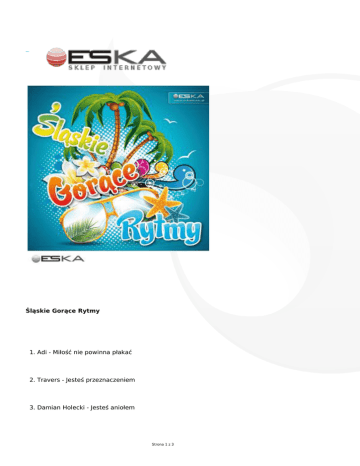 Śląskie Gorące Rytmy 1. Adi - Miłość nie powinna płakać 2. Travers - Jesteś przeznaczeniem 3. Damian Holecki - Jesteś aniołem Strona 1 z 3 4. Jacek Silski - Romantica 5. Paradise - Nareszcie lato 6. Golden Mix - Moja piosenka 7. Dominika i Janusz Żyłka - Ty i ja 8. Karpowicz Family - Kolorowe plaże 9. Mr. Maniac - Andżelina 10. Blue Fantastic - Zgrana paka 11. Renata i Damian - Blue Bayou 12. Brygoda i Robert Łukowski - Prośba o miłość 13. Christof - Nie chcę ranić Cię kochanie 14. Bogdan Traliszewski - Czerwone róże 15. Tobi King - Indie 16. Teresa Werner - Pokochałam Angela 17. Mariusz Kalaga - Spoglądam w Twoje okno Strona 2 z 3 18. Martyna - Bo ja to lubię 19. Claudia i Kasia Chwołka - Wyspa marzeń 20. Jula i Kola - Nocą na plaży Strona 3 z 3