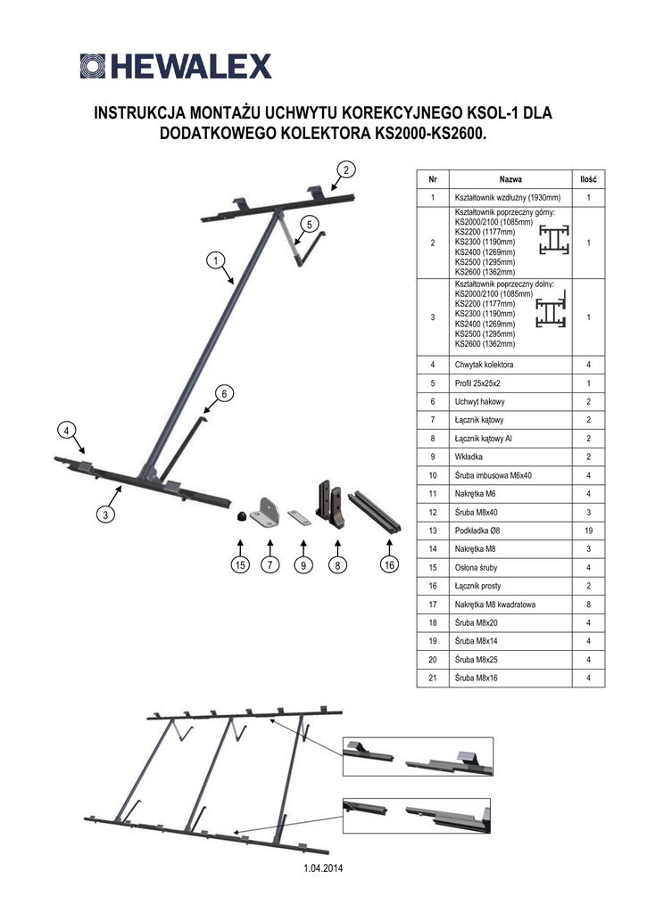 INSTRUKCJA MONTAŻU UCHWYTU KOREKCYJNEGO KSOL-1 DLA DODATKOWEGO KOLEKTORA KS2000-KS2600. 2 Nr 1 5 2 1 3 6 4 3 15 7 9 8 1.04.2014 16 Nazwa Kształtownik wzdłużny (1930mm) Kształtownik poprzeczny górny: KS2000/2100 (1085mm) KS2200 (1177mm) KS2300 (1190mm) KS2400 (1269mm) KS2500 (1295mm) KS2600 (1362mm) Kształtownik poprzeczny dolny: KS2000/2100 (1085mm) KS2200 (1177mm) KS2300 (1190mm) KS2400 (1269mm) KS2500 (1295mm) KS2600 (1362mm) Ilość 1 1 1 4 Chwytak kolektora 4 5 Profil 25x25x2 1 6 Uchwyt hakowy 2 7 Łącznik kątowy 2 8 Łącznik kątowy Al 2 9 Wkładka 2 10 Śruba imbusowa M6x40 4 11 Nakrętka M6 4 12 Śruba M8x40 3 13 Podkładka Ø8 19 14 Nakrętka M8 3 15 Osłona śruby 4 16 Łącznik prosty 2 17 Nakrętka M8 kwadratowa 8 18 Śruba M8x20 4 19 Śruba M8x14 4 20 Śruba M8x25 4 21 Śruba M8x16 4 Montaż uchwytu korekcyjnego KSOL-1 dla dodatkowego kolektora należy przeprowadzić analogicznie do montażu uchwytu korekcyjnego KSOL-2 dla dwóch kolektorów KS2000-KS2600 Uchwyt korekcyjny KSOL-1 służy do zamocowania dodatkowego kolektora KS2000-2600 na bazie uchwytu korekcyjnego KSOL-2. Kolejne czynności montażu. 1. Po usunięciu wybranych dachówek, przy pomocy wkrętów zamocować do łat uchwyty hakowe (6) w odległości około 1085mm – KS2000/2100, 1190mm – KS2300, 1290mm – KS2500, 1360mm – KS2600 od uchwytów hakowych uchwytu korekcyjnego KSOL-2. 2. Zamocować kształtownik wzdłużny (1) dopasowując rozstaw do założonych uprzednio dolnych uchwytów hakowych. Przy pomocy wkrętów zamocować górny uchwyt hakowy do łat. Dokręcić mocno nakrętki mocujące profil do dolnego uchwytu. 3. Wsunąć łączniki Al. (8) i zamocować górny kształtownik poprzeczny (2), oraz dolny (3) do kształtowników wzdłużnych (1). 4. Połączyć kształtowniki poprzeczne (2 i 3) ze stelażem uchwytu korekcyjnego KSOL-2 używając do tego celu łączników (7), śrub (12) 5. Podczas montażu kolektora na stelażu poluzować górne chwytaki (4). Kolektory słoneczne umieścić na platformie stelaża z zachowaniem dystansu pomiędzy nimi 85mm. Przykręcić górne chwytaki kolektora (4). 6. Przykręcić śrubami M8x16 (22) kolektor do dolnych chwytaków (wykorzystując nitonakrętki zamocowane w kolektorze). 7. Przykręcić śrubami M8x16 (22) kolektor do górnych chwytaków (wykorzystując nitonakrętki zamocowane w kolektorze). 8. Dosunąć kolektor do półki listwy (3) i dokręcić dolne chwytaki kolektora, dokręcić górne chwytaki (4) oraz nałożyć osłony śrub (15). Uwagi: W przypadku montażu na dachu pokrytym blacho-dachówką lub pokryciem bitumicznym należy dodatkowo zmodyfikować uchwyty hakowe (6) poprzez odcięcie ich zaczepów. 1.04.2014