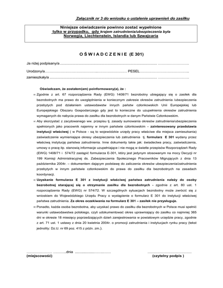 Załącznik nr 3 do wniosku o ustalenie uprawnień do zasiłku Niniejsze oświadczenie powinno zostać wypełnione tylko w przypadku, gdy krajem zatrudnienia/ubezpieczenia była Norwegia, Liechtenstein, Islandia lub Szwajcaria O Ś W I A D C Z E N I E (E 301) Ja niŜej podpisany/a .............................................................................................. ……………………. Urodzony/a……………………………………..…………………… PESEL………………………………….. zamieszkały/a ........................................................................................................ ……………………. Oświadczam, Ŝe zostałem(am) poinformowany(a), Ŝe : • Zgodnie z art. 67 rozporządzenia Rady (EWG) 1408/71 bezrobotny ubiegający się o zasiłek dla bezrobotnych ma prawo do uwzględnienia w koniecznym zakresie okresów zatrudnienia /ubezpieczenia przebytych pod działaniem ustawodawstw innych państw członkowskich Unii Europejskiej lub Europejskiego Obszaru Gospodarczego gdy jest to konieczne do uzupełnienia okresów zatrudnienia wymaganych do nabycia prawa do zasiłku dla bezrobotnych w danym Państwie Członkowskim. • Aby skorzystać z zacytowanego ww. przepisu tj. zasady sumowania okresów zatrudnienia/ubezpieczenia spełnionych jako pracownik najemny w innym państwie członkowskim – zainteresowany przedstawia instytucji właściwej ( w Polsce - są to wojewódzkie urzędy pracy właściwe dla miejsca zamieszkania) zaświadczenie wymieniające okresy ubezpieczenia lub zatrudnienia tj. formularz E 301 wydany przez właściwą instytucję państwa zatrudnienia. Inne dokumenty takie jak: świadectwa pracy, zaświadczenia, umowy o pracę itp. stanowią informacje uzupełniające i nie mogą w świetle przepisów Rozporządzeń Rady (EWG) 1408/71 i 574/72 zastąpić formularza E-301, który jest jedynym stosowanym na mocy Decyzji nr 199 Komisji Administracyjnej ds. Zabezpieczenia Społecznego Pracowników Migrujących z dnia 13 października 2004r. – dokumentem dającym podstawę do zaliczenia okresów ubezpieczenia/zatrudnienia przebytych w innym państwie członkowskim do prawa do zasiłku dla bezrobotnych na zasadach koordynacji. • Uzyskanie formularza E 301 z instytucji właściwej państwa zatrudnienia naleŜy do osoby bezrobotnej starającej się o otrzymanie zasiłku dla bezrobotnych - zgodnie z art. 80 ust. 1 rozporządzenia Rady (EWG) nr 574/72. W szczególnych sytuacjach bezrobotny moŜe zwrócić się z wnioskiem do Wojewódzkiego Urzędu Pracy o wystąpienie o formularz E 301 do instytucji właściwej państwa zatrudnienia. Za okres oczekiwania na formularz E 301 – zasiłek nie przysługuje. • Ponadto, kaŜda osoba bezrobotna, aby uzyskać prawo do zasiłku dla bezrobotnych w Polsce musi spełnić warunki ustawodawstwa polskiego, czyli udokumentować okres uprawniający do zasiłku co najmniej 365 dni w okresie 18 miesięcy poprzedzających dzień zarejestrowania w powiatowym urzędzie pracy, zgodnie z art. 71 ust. 1 ustawy z dnia 20 kwietnia 2004r. o promocji zatrudnienia i instytucjach rynku pracy (tekst jednolity: Dz.U. nr 69 poz. 415 z późn. zm.). ………………… ………..dnia ....................……..…… (miejscowość) ……………………………… (czytelny podpis )