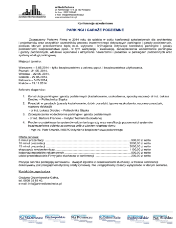 ArtMediaTechnics ul. Kamińskiego 14/ 9, 03-130 Warszawa tel. kom.: 0600 35-88-40 e-mail: [email protected] www.artmediatechnics.pl Konferencje szkoleniowe PARKINGI i GARAŻE PODZIEMNE Zapraszamy Państwa Firmę w 2014 roku do udziału w cyklu konferencji szkoleniowych dla architektów i projektantów oraz wszystkich uczestników procesu inwestycyjnego dotyczących parkingów i garaży podziemnych, podczas których przedstawione będą m.in. wytyczne i wymagania dotyczące konstrukcji parkingów i garaży podziemnych; bezpieczeństwo ppoż., w tym wentylację i ewakuację, zabezpieczenia wodochronne parkingów i garaży podziemnych, właściwe wykonanie i utrzymanie nawierzchni i posadzek w parkingach podziemnych oraz systemy obsługi parkingowej. Miejsca i terminy: Warszawa – 8.05.2014 – tylko bezpieczeństwo z zakresu ppoż. i bezpieczeństwa użytkowania. Poznań - 21.05. 2014, Wrocław – 22.05. 2014, Gdańsk – 27.05.2014, Katowice – 5.05.2014, Kraków – 19.11.2014 Referaty ekspertów: 1. Konstrukcje parkingów i garaży podziemnych (kształtowanie, uszkodzenia, sposoby napraw)- dr inż. Łukasz Drobiec – Politechnika Śląska 2. Posadzki w garażach (zasady kształtowanie, dobór posadzki, typowe uszkodzenia, naprawy posadzek, naprawy dylatacji) - dr inż. Łukasz Drobiec – Politechnika Śląska 3. Zabezpieczenia wodochronne parkingów i garaży podziemnych - dr inż. Barbara Francke – Instytut Techniki Budowlanej 4. Problemy projektowania systemów oddymiania garaży oraz weryfikacja poprawności systemów bezpieczeństwa obiektu za pomocą prób z użyciem ciepłego dymu - mgr inż. Piotr Smardz, INBEPO inżynieria bezpieczeństwa pożarowego Oferta cenowa: 5 minut prezentacji ......................................................................................................... 900,00 zł netto 10 minut prezentacji ...................................................................................................... 2000,00 zł netto 15 minut prezentacji ...................................................................................................... 3000,00 zł netto ekspozycja wystawiennicza .......................................................................................... 1100,00 zł netto kolportaż materiałów reklamowych ................................................................................. 500,00 zł netto udział przedstawiciela Firmy jako słuchacza w konferencji ........................................... 200,00 zł netto Pozycje cennika podlegają sumowaniu. Uwaga! Zgodnie z oczekiwaniami słuchaczy, w trakcie konferencji dokonywany jest przegląd tematycznej oferty rynkowej. Nie uwzględniamy zasady wyłączności w danym sektorze. Kontakt do organizatora: Grażyna Grzymkowska-Gałka, tel. 0600 35 88 40, e-mail: [email protected]