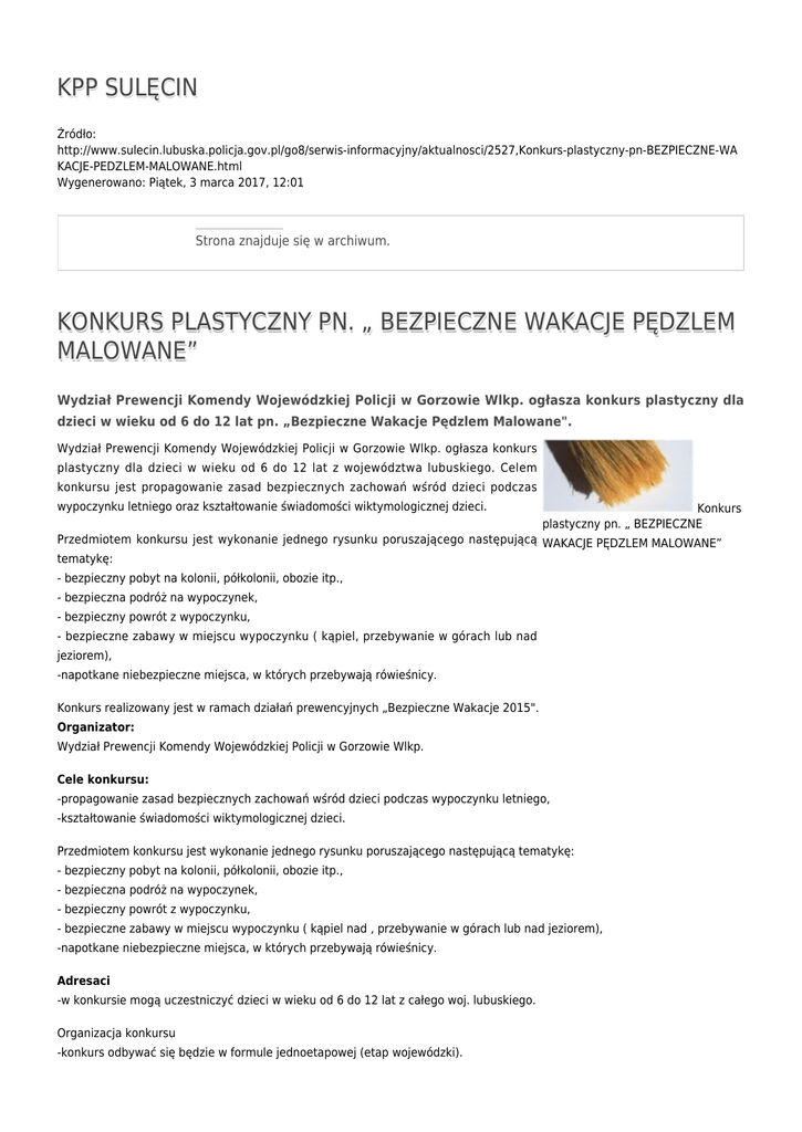 KPP SULĘCIN Źródło: http://www.sulecin.lubuska.policja.gov.pl/go8/serwis-informacyjny/aktualnosci/2527,Konkurs-plastyczny-pn-BEZPIECZNE-WA KACJE-PEDZLEM-MALOWANE.html Wygenerowano: Piątek, 3 marca 2017, 12:01 Strona znajduje się w archiwum. KONKURS PLASTYCZNY PN. „ BEZPIECZNE WAKACJE PĘDZLEM MALOWANE” Wydział Prewencji Komendy Wojewódzkiej Policji w Gorzowie Wlkp. ogłasza konkurs plastyczny dla dzieci w wieku od 6 do 12 lat pn. „Bezpieczne Wakacje Pędzlem Malowane". Wydział Prewencji Komendy Wojewódzkiej Policji w Gorzowie Wlkp. ogłasza konkurs plastyczny dla dzieci w wieku od 6 do 12 lat z województwa lubuskiego. Celem konkursu jest propagowanie zasad bezpiecznych zachowań wśród dzieci podczas wypoczynku letniego oraz kształtowanie świadomości wiktymologicznej dzieci. Konkurs plastyczny pn. „ BEZPIECZNE Przedmiotem konkursu jest wykonanie jednego rysunku poruszającego następującą WAKACJE PĘDZLEM MALOWANE” tematykę: - bezpieczny pobyt na kolonii, półkolonii, obozie itp., - bezpieczna podróż na wypoczynek, - bezpieczny powrót z wypoczynku, - bezpieczne zabawy w miejscu wypoczynku ( kąpiel, przebywanie w górach lub nad jeziorem), -napotkane niebezpieczne miejsca, w których przebywają rówieśnicy. Konkurs realizowany jest w ramach działań prewencyjnych „Bezpieczne Wakacje 2015". Organizator: Wydział Prewencji Komendy Wojewódzkiej Policji w Gorzowie Wlkp. Cele konkursu: -propagowanie zasad bezpiecznych zachowań wśród dzieci podczas wypoczynku letniego, -kształtowanie świadomości wiktymologicznej dzieci. Przedmiotem konkursu jest wykonanie jednego rysunku poruszającego następującą tematykę: - bezpieczny pobyt na kolonii, półkolonii, obozie itp., - bezpieczna podróż na wypoczynek, - bezpieczny powrót z wypoczynku, - bezpieczne zabawy w miejscu wypoczynku ( kąpiel nad , przebywanie w górach lub nad jeziorem), -napotkane niebezpieczne miejsca, w których przebywają rówieśnicy. Adresaci -w konkursie mogą uczestniczyć dzieci w wieku od 6 do 12 lat z całego woj. lubuskiego. Organizacja konkursu -konkurs odbywać się będzie w formule jednoetapowej (etap wojewódzki). -dzieci za pośrednictwem szkół oraz placówek przedszkolnych, powinny przesłać prace plastyczne wraz z kartą zgłoszeniową do 14 września 2015r.(brana będzie pod uwagę data stempla pocztowego), -rysunek należy wykonać na kartce papieru A-3, dowolną techniką plastyczną. Do rysunku należy dołączyć kartę zgłoszeniową: imię i nazwisko, adres szkoły, wiek i tytuł pracy. Prace należy przesłać na adres: Wydział Prewencji Komendy Wojewódzkiej Policji w Gorzowie Wlkp., ul. Kwiatowa 10, 66-400 Gorzów Wlkp. z dopiskiem: konkurs plastyczny „Bezpieczne wakacje pędzlem malowane". -rozstrzygnięcie konkursu nastąpi do dnia 18 września 2015r. -Komisja Konkursowa przyzna za prace: I, II, III miejsce. Kryteria oceny: Członkowie Komisji Konkursowej oceniającej prace wezmą pod uwagę: -zgodność tematu pracy z tematyką konkursową, -wartość artystyczną i techniczną wykonania pracy (kompozycja, zagospodarowanie kartki), -oryginalność podejścia do tematu, -wartość merytoryczna i walory edukacyjne pracy. Skład komisji konkursowej: Przewodniczący: Naczelnik Wydziału Prewencji Komendy Wojewódzkiej Policji w Gorzowie Wlkp., mł. insp. Zbigniew Pytka. Członkowie Komisji – przedstawiciele: -Kuratorium Oświaty w Gorzowie Wlkp., -Wojewódzkiego Ośrodka Metodycznego w Gorzowie Wlkp., -Fundacji „Contra Crimen" w Gorzowie Wlkp. Nagrody: Autorzy prac, które zajmą I, II, III miejsce otrzymają dyplomy i nagrody rzeczowe ufundowane przez Wydział Prewencji KWP w Gorzowie Wlkp. oraz Fundację „Contra Crimen" w Gorzowie Wlkp. Postanowienia końcowe: -Wydział Prewencji KWP w Gorzowie Wlkp. zastrzega sobie prawo do wykorzystania prac w drukowanych materiałach prewencyjnych, -prace nadesłane po terminie oraz niespełniające wymogów regulaminowych zostaną zdyskwalifikowane, -kwestie sporne wynikające z niniejszego regulaminu rozstrzyga Naczelnik Wydziału Prewencji KWP w Gorzowie Wlkp., -wszelkie wątpliwości dotyczące organizacji konkursu należy zgłaszać do 18 września 2015r. do Wydziału Prewencji KWP w Gorzowie Wlkp., tel.95 738 15 70. Szczegółowych informacji udziela: Justyna Ławreszuk tel. 95 738 15 75, kom. Piotr Wiśniewski tel. 95 738 15 74 Wydział Prewencji Komendy Wojewódzkiej Policji w Gorzowie Wlkp., ul. Kwiatowa 10, 66 – 400 Gorzów Wlkp. telefon kontaktowy: 95 738 15 70 Ocena: 0/5 (0) Tweetnij