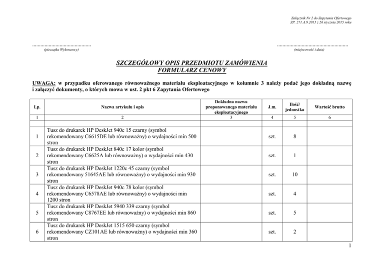 Załącznik Nr 2 do Zapytania Ofertowego ZP. 271.A.9.2015 z 26 stycznia 2015 roku ........................................... .................................................... (pieczątka Wykonawcy) (miejscowość i data) SZCZEGÓŁOWY OPIS PRZEDMIOTU ZAMÓWIENIA FORMULARZ CENOWY UWAGA: w przypadku oferowanego równowaŜnego materiału eksploatacyjnego w kolumnie 3 naleŜy podać jego dokładną nazwę i załączyć dokumenty, o których mowa w ust. 2 pkt 6 Zapytania Ofertowego Lp. Nazwa artykułu i opis 1 2 1 2 3 4 5 6 Tusz do drukarek HP DeskJet 940c 15 czarny (symbol rekomendowany C6615DE lub równowaŜny) o wydajności min 500 stron Tusz do drukarek HP DeskJet 840c 17 kolor (symbol rekomendowany C6625A lub równowaŜny) o wydajności min 430 stron Tusz do drukarek HP DeskJet 1220c 45 czarny (symbol rekomendowany 51645AE lub równowaŜny) o wydajności min 930 stron Tusz do drukarek HP DeskJet 940c 78 kolor (symbol rekomendowany C6578AE lub równowaŜny) o wydajności min 1200 stron Tusz do drukarek HP DeskJet 5940 339 czarny (symbol rekomendowany C8767EE lub równowaŜny) o wydajności min 860 stron Tusz do drukarek HP DeskJet 1515 650 czarny (symbol rekomendowany CZ101AE lub równowaŜny) o wydajności min 360 stron Dokładna nazwa proponowanego materiału eksploatacyjnego 3 J.m. Ilość/ jednostka Wartość brutto 4 5 6 szt. 8 szt. 1 szt. 10 szt. 4 szt. 5 szt. 2 1 Załącznik Nr 2 do Zapytania Ofertowego ZP. 271.A.9.2015 z 26 stycznia 2015 roku 7 8 9 10 11 12 13 14 15 16 17 Tusz do drukarek HP DeskJet 1515 650 kolor (symbol rekomendowany CZ102AE lub równowaŜny) o wydajności min 200 stron Tusz do drukarek HP Photosmart C3180 336 czarny (symbol rekomendowany C9362EE lub równowaŜny) o wydajności min 210 stron Tusz do drukarek HP Photosmart C3180 342 kolor (symbol rekomendowany C9361EE lub równowaŜny) o wydajności min 175 stron Toner do drukarek Kyocera FS-1061 czarny (symbol rekomendowany TK-1125 lub równowaŜny) o wydajności min 2100 stron Toner do urządzenia wielofunkcyjnego HP LaserJet M1522nf 36A czarny (symbol rekomendowany CB436A lub równowaŜny) o wydajności min 2000 stron Toner do drukarek Samsung CLP-320 czarny (symbol rekomendowany CLT-K4072 lub równowaŜny) o wydajności min 1500 stron Toner do drukarek Samsung CLP-320 błękitny (symbol rekomendowany CLT-C4072 lub równowaŜny) o wydajności min 1000 stron Toner do drukarek Samsung CLP-320 purpurowy (symbol rekomendowany CLT-M4072 lub równowaŜny) o wydajności min 1000 stron Toner do drukarek Samsung CLP-320 Ŝółty (symbol rekomendowany CLT-Y4072 lub równowaŜny) o wydajności min 1000 stron Bęben do drukarek Samsung CLP-320 (symbol rekomendowany CLT-R407 lub równowaŜny) o wydajności min 24 000 stron Toner do drukarek HP LaserJet 1010 12A czarny (symbol rekomendowany Q2612A lub równowaŜny) o wydajności min 2000 stron szt. 2 szt. 5 szt. 5 szt. 20 szt. 60 szt. 7 szt. 7 szt. 7 szt. 7 szt. 1 szt. 90 2 Załącznik Nr 2 do Zapytania Ofertowego ZP. 271.A.9.2015 z 26 stycznia 2015 roku 18 19 20 21 22 23 24 25 26 27 28 Toner do drukarek HP LaserJet p1102 85A czarny (symbol rekomendowany CE285A lub równowaŜny) o wydajności min 1600 stron Toner do drukarek HP LaserJet p1606 78A czarny (symbol rekomendowany CE278A lub równowaŜny) o wydajności min 2100 stron Toner do drukarek Epson AcuLaser M2300D czarny (symbol rekomendowany S050583 lub równowaŜny) o wydajności min. 3000 stron Toner do drukarek HP Color LaserJet CP 2025 czarny (symbol rekomendowany CC530A lub równowaŜny) o wydajności min. 3500 stron Toner do drukarek HP Color LaserJet CP 2025 błękitny (symbol rekomendowany CC531A lub równowaŜny) o wydajności min. 2800 stron Toner do drukarek HP Color LaserJet CP 2025 Ŝółty (symbol rekomendowany CC532A lub równowaŜny) o wydajności min. 2800 stron Toner do drukarek HP Color LaserJet CP 2025 purpurowy (symbol rekomendowany CC533A lub równowaŜny) o wydajności min. 2800 stron Toner do drukarek Brother MFC-9460CDN (symbol rekomendowany TN325-BK lub równowaŜny) Czarny o wydajności min.4000 stron Toner do drukarek Brother MFC-9460CDN (symbol rekomendowany TN325-C lub równowaŜny) Błękitny o wydajności min. 3500 stron Toner do drukarek Brother MFC-9460CDN (symbol rekomendowany TN325-M lub równowaŜny) Purpurowy o wydajności min. 3500 stron Toner do drukarek Brother MFC-9460CDN (symbol rekomendowany TN325-Y lub równowaŜny) śółty o wydajności min. 3500 stron szt. 10 szt. 5 szt. 13 szt. 10 szt. 5 szt. 5 szt. 5 szt. 5 szt. 4 szt. 4 szt. 4 3 Załącznik Nr 2 do Zapytania Ofertowego ZP. 271.A.9.2015 z 26 stycznia 2015 roku 29 30 31 32 33 34 35 36 37 38 39 Toner do drukarek Brother MFC-9340CDW (symbol rekomendowany TN241-BK lub równowaŜny) Czarny o wydajności min.2500 stron Toner do drukarek Brother MFC-9340CDW (symbol rekomendowany TN245-C lub równowaŜny) Błękitny o wydajności min. 2200 stron Toner do drukarek Brother MFC-9340CDW (symbol rekomendowany TN245-M lub równowaŜny) Purpurowy o wydajności min. 2200 stron Toner do drukarek Brother MFC-9340CDW (symbol rekomendowany TN245-Y lub równowaŜny) śółty o wydajności min. 2200 stron Bęben do drukarek Brother MFC-9340CDW (symbol rekomendowany DR241CL lub równowaŜny) o wydajności min. 15 000 stron Toner do drukarek Konica Minolta PagePro 1350E czarny (symbol rekomendowany 1710567002 lub równowaŜny) o wydajności min 6000 stron Bęben do drukarek Konica Minolta PagePro 1350E (symbol rekomendowany 1710568001 lub równowaŜny) o wydajności min. 20000 stron Toner do drukarek Lexmark E 120 czarny (symbol rekomendowany 12016SE lub równowaŜny) o wydajności min 2000 stron Toner do urządzenia wielofunkcyjnego HP LaserJet M2727nf 53A czarny (symbol rekomendowany Q7553A lub równowaŜny) o wydajności min 3000 stron KartridŜ do urządzenia wielofunkcyjnego Brother DCP-J125 czarny (symbol rekomendowany LC985BK lub równowaŜny) o wydajności min 300 stron KartridŜ do urządzenia wielofunkcyjnego Brother DCP-J125 Ŝó