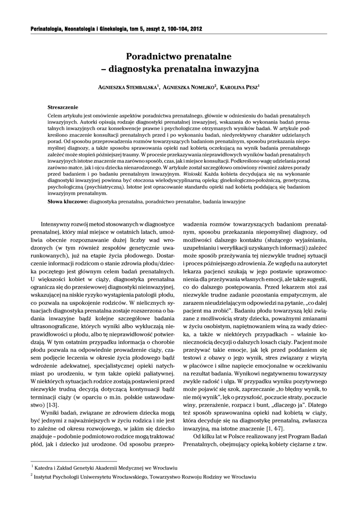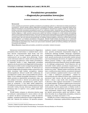 Perinatologia, Neonatologia i Ginekologia, tom 5, zeszyt 2, 100-104, 2012 Poradnictwo prenatalne – diagnostyka prenatalna inwazyjna AGNIESZKA STEMBALSKA1, AGNIESZKA NOMEJKO2, KAROLINA PESZ1 Streszczenie Celem artykułu jest omówienie aspektów poradnictwa prenatalnego, głównie w odniesieniu do badań prenatalnych inwazyjnych. Autorki opisują rodzaje diagnostyki prenatalnej inwazyjnej, wskazania do wykonania badań prenatalnych inwazyjnych oraz konsekwencje prawne i psychologiczne otrzymanych wyników badań. W artykule podkreślono znaczenie konsultacji prenatalnych przed i po wykonaniu badań, niedyrektywny charakter udzielanych porad. Od sposobu przeprowadzenia rozmów towarzyszących badaniom prenatalnym, sposobu przekazania niepomyślnej diagnozy, a także sposobu sprawowania opieki nad kobietą oczekującą na wynik badania prenatalnego zależeć może stopień późniejszej traumy. W procesie przekazywania nieprawidłowych wyników badań prenatalnych inwazyjnych istotne znaczenie ma zarówno sposób, czas, jak i miejsce konsultacji. Podkreślono wagę udzielania porad zarówno matce, jak i ojcu dziecka nienarodzonego. W artykule został szczegółowo omówiony również zakres porady przed badaniem i po badaniu prenatalnym inwazyjnym. Wnioski. Każda kobieta decydująca się na wykonanie diagnostyki inwazyjnej powinna być otoczona wielodyscyplinarną opieką: ginekologiczno-położniczą, genetyczną, psychologiczną (psychiatryczną). Istotne jest opracowanie standardu opieki nad kobietą poddającą się badaniom inwazyjnym prenatalnym. Słowa kluczowe: diagnostyka prenatalna, poradnictwo prenatalne, badania inwazyjne Intensywny rozwój metod stosowanych w diagnostyce prenatalnej, który miał miejsce w ostatnich latach, umożliwia obecnie rozpoznawanie dużej liczby wad wrodzonych (w tym również zespołów genetycznie uwarunkowanych), już na etapie życia płodowego. Dostarczenie informacji rodzicom o stanie zdrowia płodu/dziecka poczętego jest głównym celem badań prenatalnych. U większości kobiet w ciąży, diagnostyka prenatalna ogranicza się do przesiewowej diagnostyki nieinwazyjnej, wskazującej na niskie ryzyko wystąpienia patologii płodu, co pozwala na uspokojenie rodziców. W nielicznych sytuacjach diagnostyka prenatalna zostaje rozszerzona o badania inwazyjne bądź kolejne szczegółowe badania ultrasonograficzne, których wyniki albo wykluczają nieprawidłowości u płodu, albo tę nieprawidłowość potwierdzają. W tym ostatnim przypadku informacja o chorobie płodu pozwala na odpowiednie prowadzenie ciąży, czasem podjęcie leczenia w okresie życia płodowego bądź wdrożenie adekwatnej, specjalistycznej opieki natychmiast po urodzeniu, w tym także opieki paliatywnej. W niektórych sytuacjach rodzice zostają postawieni przed niezwykle trudną decyzją dotyczącą kontynuacji bądź terminacji ciąży (w oparciu o m.in. polskie ustawodawstwo) [1-3]. Wyniki badań, związane ze zdrowiem dziecka mogą być jednymi z najważniejszych w życiu rodzica i nie jest to zależne od okresu rozwojowego, w jakim się dziecko znajduje – podobnie podmiotowo rodzice mogą traktować płód, jak i dziecko już urodzone. Od sposobu przepro- wadzenia rozmów towarzyszących badaniom prenatalnym, sposobu przekazania niepomyślnej diagnozy, od możliwości dalszego kontaktu (służącego wyjaśnianiu, uzupełnianiu i weryfikacji uzyskanych informacji) zależeć może sposób przeżywania tej niezwykle trudnej sytuacji i proces późniejszego zdrowienia. Ze względu na autorytet lekarza pacjenci szukają w jego postawie uprawomocnienia dla przeżywania własnych emocji, ale także sugestii, co do dalszego postępowania. Przed lekarzem stoi zaś niezwykle trudne zadanie pozostania empatycznym, ale zarazem nieudzielającym odpowiedzi na pytanie, „co dalej pacjent ma zrobić”. Badaniu płodu towarzyszą lęki związane z możliwością straty dziecka, poważnymi zmianami w życiu osobistym, napiętnowaniem winą za wady dziecka, a także w niektórych przypadkach – właśnie koniecznością decyzji o dalszych losach ciąży. Pacjent może przeżywać takie emocje, jak lęk przed poddaniem się testowi z obawy o jego wynik, stres związany z wizytą w placówce i silne napięcie emocjonalne w oczekiwaniu na rezultat badania. Wynikowi negatywnemu towarzyszy zwykle radość i ulga. W przypadku wyniku pozytywnego może pojawić się szok, zaprzeczanie „to błędny wynik, to nie mój wynik”, lęk o przyszłość, poczucie straty, poczucie winy, przerażenie, rozpacz i bunt, „dlaczego ja”. Dlatego też sposób sprawowanina opieki nad kobietą w ciąży, która decyduje się na diagnostykę prenatalną, zwłaszcza inwazyjną, ma istotne znaczenie [1, 4-7]. Od kilku lat w Polsce realizowany jest Program Badań Prenatalnych, obejmujący opieką kobiety ciężarne z tzw. 1 Katedra i Zakład Genetyki Akademii Medycznej we Wrocławiu 2 Instytut Psychologii Uniwersytetu Wrocławskiego, Towarzystwo Rozwoju Rodziny we Wrocławiu Poradnictwo prenatalne – diagnostyka prenatalna inwazyjna grupy podwyższonego ryzyka urodzenia dziecka z wadami wrodzonymi [8, 9]. Pacjentki do Programu kwalifikowane są ze względu na: – wiek (ukończone 35 lat), – wystąpienie w poprzedniej ciąży lub u dziecka zespołu/choroby genetycznej (uwarunkowanej chromosomowo, monogenowo lub wieloczynnikowo), – fakt nosicielstwa zrównoważonej aberracji chromosomowej u któregoś z rodziców, – nieprawidłowe wyniki ultrasonograficznych lub/i biochemicznych badań przesiewowych. Większość powyższych wskazań do Programu Badań Prenatalnych stanowi także wskazanie do wykonania u pacjentek badań prenatalnych inwazyjnych. Istnieją trzy metody pobierania (pod kontrolą ultrasonografu) materiału (komórek płodu) do badania genetycznego: • biopsja kosmówki – czyli przezbrzuszne lub przezszyjkowe pobranie niewielkiej ilości tkanki rozwijającego się łożyska; czas wykonan