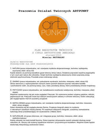 Pracownia Działań Twórczych ARTPUNKT PLAN WARSZTATÓW TWÓRCZYCH Z CYKLU ARTYSTYCZNE ABECADŁO styczeń/2013 Miesiąc NATURALNY ZAJĘCIA WARSZTATOWE PRZEZNACZONE DLA GRUP PRZEDSZKOLNYCH 1. NATURA (praca indywidualna, cel: rozwijanie myślenia skojarzeniowego, technika: wyklejanka, wycinanka efekt: obraz A3) Każde dziecko za pomocą kawałków gazet stworzy obraz natury. Działania poprzedzi wspólna pogawędka o tym czym jest natura dla człowieka. Dzięki technice wyklejania płaszczyzny dzieci poprawią swoją zdolność psychoruchową. Powstałe prace zobrazują naturę. 2. ZIARNO (praca indywidualna, cel: pobudzanie wyobraźni, technika: mieszana, efekt: obraz A3) Obraz stworzony z wykorzystaniem różnych ziaren pozwoli dzieciom poznać naturalne kształty i pochodzenie roślin. Za pomocą kaszy, ryżu, maku powstaną obrazy, które przedstawią zimowe krajobrazy. 3. PATYCZAKI (praca indywidualna, cel: kształtowanie wrażliwości estetycznej, technika: mieszana, efekt: obiekt) Wspólnie zastanowimy się jak może wyglądać Patyczak. Do wykonania postaci użyjemy patyków, włóczki, papierowych tub. Patyczak może być dobrym towarzyszem zabawy w zimowe wieczory. Dzieci zdecydują jaki wygląd będzie miał ich prywatny przyjaciel. 4. MATKA ZIEMIA (praca indywidualna, cel: rozwijanie myślenia skojarzeniowego, technika: mieszana, efekt: obraz okrągły) Dzieci dowiedzą się jak wygląda planeta Ziemia. Projekcja fotografii ułatwi im myślenie o naturalnych zasobach naszej planety. Po wspólnym obejrzeniu fotografii, uczestnicy samodzielnie wykonają obraz przedstawiający ich wyobrażenie o Matce Ziemi. 5. NATURALNE JA (praca zbiorowa, cel: integracja grupy, technika: mieszana, efekt: obraz wielkoformatowy) Każdy człowiek ma swój kształt fizyczny. Dzieci poprzez odrysowanie swoich sylwetek zbudują swoje naturalne JA. Obrysy ciał zostaną wypełnione kolorami i przyrodniczymi kształtami. Wspólne dzieło będzie doskonałą interpretacją osobowości dzieci. ZAJĘCIA WARSZTATOWE PRZEZNACZONE DLA SZKÓŁ PODSTAWOWYCH 1. LAND ART (praca indywidualna, cel: doskonalenie umiejętności manualnych, technika: malarska, efekt: obraz A2) Sztuka ziemi zazwyczaj realizowana jest w przestrzeni środowiska naturalnego. Uczestnicy spróbują wykonać obraz przedstawiający popularne działa artystów tworzących w tym nurcie. Po wcześniejszej projekcji fotografii warsztatowicze przejdą do realizowania swoich pomysłów z wykorzystaniem naturalnych produktów takich jak ziarna kaszy, ryżu, fasoli, maku. 2. BIŻUNATURA (praca indywidualna, cel: rozwijanie wyobraźni, technika: mieszana, efekt: bransoletka) Sznurki, kawałki tkanin, włóczka i kartonowe tuby będą budulcem w wykonaniu bransoletek przyjaźni. Każdy uczestnik wykona dwie bransoletki, by jedną z nich podarować przyjacielowi. 3. EKOSYSTEM (praca zbiorowa, cel: integracja grupy, technika: mieszana, efekt: obraz wielkoformatowy) Czym jest ekosystem? Na to pytanie odpowiedzą uczestnicy działań plastycznych obrazując zasady, sposób funkcjonowania ekosystemu istniejącego w przyrodzie. Wspólne opracowanie, wykonanie dzieła malarskiego pozwoli zintegrować grupę i wzmocnić relację pomiędzy uczniami. 4. PATYKOWY ŁAPACZ SNÓW (praca indywidualna, cel: kształtowanie wrażliwości estetycznej, technika: mieszana, efekt: obiekt) Łapacz zwany również zaklinaczem snów jest popularnym przedmiotem w kulturze indiańskiej. Tworzony po to, by dbać o spokojny i dobry sen. Uczestnicy wykorzystując patyki, kijki, piórka i kawałki tkanin z których skonstruują przestrzenne zaklinacze snów. 5. GÓRSKIE KRAJOBRAZY ( praca indywidualna, cel: pobudzanie wyobraźni, technika: malarstwo, efekt: obraz A3) Zimowe krajobrazy prezentowane uczestnikom będą inspiracją we własnych realizacjach malarskich. Każdy indywidualnie stworzy nietypowy obraz w kolorach zimy z wykorzystaniem ciemnego papieru. ZAJĘCIA WARSZTATOWE PRZEZNACZONE DLA SZKÓŁ GIMNAZJALNYCH I LICEALNYCH 1. EKOSYSTEM (praca zbiorowa, cel: integracja grupy, technika: mieszana, efekt: gra planszowa) Uczestnicy stworzą grę planszową uwzględniając sposób funkcjonowania ekosystemu w środowisku naturalnym. Zadanie wymaga opracowania zasad gry, stworzenia planszy i jej interpretacji wizualnej. 2. PARĘ SŁÓW O NATURZE (praca indywidualna, cel: kształtowanie wrażliwości estetycznej, technika: mieszana, efekt: książka artystyczna) Zadaniem młodzieży będzie zobrazowanie za pomocą liter i ich kształtów terminu NATURA. Wspólnie zastanowimy się nad znaczeniem środowiska naturalnego w naszym życiu. ______________________________________________________________________________________ W celu zapisania grupy na zajęcia z cyklu Artystyczne ABECADŁO należy wybrać termin zajęć (poniedziałki, wtorki i środy) oraz tytuł warsztatu i skontaktować się telefonicznie lub osobiście z Ośrodkiem Kultury „Wzgórze Zamkowe” w Lubinie celem rezerwacji i uzgodnienia godziny przybycia grupy. Adres: Ośrodek Kultury „Wzgórze Zamkowe” Pracownia Działań Twórczych „Artpunkt” ul. M. Pruzi 7 i 9, 59 -‐ 300 Lubin tel. 76/ 749 69 69, fax. 76/ 749 69 68