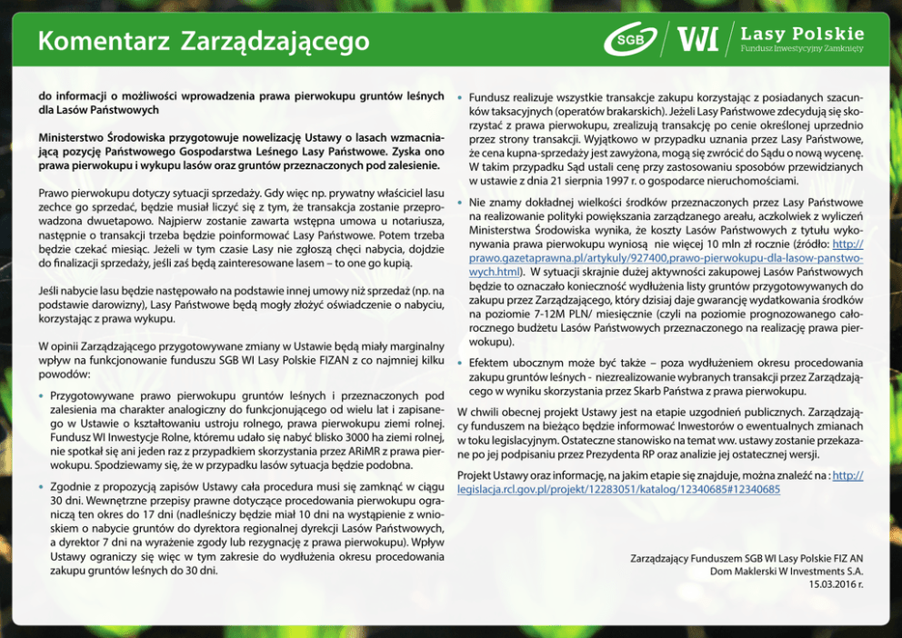 Komentarz Zarządzającego do informacji o możliwości wprowadzenia prawa pierwokupu gruntów leśnych dla Lasów Państwowych Ministerstwo Środowiska przygotowuje nowelizację Ustawy o lasach wzmacniającą pozycję Państwowego Gospodarstwa Leśnego Lasy Państwowe. Zyska ono prawa pierwokupu i wykupu lasów oraz gruntów przeznaczonych pod zalesienie. Prawo pierwokupu dotyczy sytuacji sprzedaży. Gdy więc np. prywatny właściciel lasu zechce go sprzedać, będzie musiał liczyć się z tym, że transakcja zostanie przeprowadzona dwuetapowo. Najpierw zostanie zawarta wstępna umowa u notariusza, następnie o transakcji trzeba będzie poinformować Lasy Państwowe. Potem trzeba będzie czekać miesiąc. Jeżeli w tym czasie Lasy nie zgłoszą chęci nabycia, dojdzie do finalizacji sprzedaży, jeśli zaś będą zainteresowane lasem – to one go kupią. Jeśli nabycie lasu będzie następowało na podstawie innej umowy niż sprzedaż (np. na podstawie darowizny), Lasy Państwowe będą mogły złożyć oświadczenie o nabyciu, korzystając z prawa wykupu. W opinii Zarządzającego przygotowywane zmiany w Ustawie będą miały marginalny wpływ na funkcjonowanie funduszu SGB WI Lasy Polskie FIZAN z co najmniej kilku powodów: •Przygotowywane prawo pierwokupu gruntów leśnych i przeznaczonych pod zalesienia ma charakter analogiczny do funkcjonującego od wielu lat i zapisanego w Ustawie o kształtowaniu ustroju rolnego, prawa pierwokupu ziemi rolnej. Fundusz WI Inwestycje Rolne, któremu udało się nabyć blisko 3000 ha ziemi rolnej, nie spotkał się ani jeden raz z przypadkiem skorzystania przez ARiMR z prawa pierwokupu. Spodziewamy się, że w przypadku lasów sytuacja będzie podobna. •Fundusz realizuje wszystkie transakcje zakupu korzystając z posiadanych szacun- ków taksacyjnych (operatów brakarskich). Jeżeli Lasy Państwowe zdecydują się skorzystać z prawa pierwokupu, zrealizują transakcję po cenie określonej uprzednio przez strony transakcji. Wyjątkowo w przypadku uznania przez Lasy Państwowe, że cena kupna-sprzedaży jest zawyżona, mogą się zwrócić do Sądu o nową wycenę. W takim przypadku Sąd ustali cenę przy zastosowaniu sposobów przewidzianych w ustawie z dnia 21 sierpnia 1997 r. o gospodarce nieruchomościami. •Nie znamy dokładnej wielkości środków przeznaczonych przez Lasy Państwowe na realizowanie polityki powiększania zarządzanego areału, aczkolwiek z wyliczeń Ministerstwa Środowiska wynika, że koszty Lasów Państwowych z tytułu wykonywania prawa pierwokupu wyniosą nie więcej 10 mln zł rocznie (źródło: http:// prawo.gazetaprawna.pl/artykuly/927400,prawo-pierwokupu-dla-lasow-panstwowych.html). W sytuacji skrajnie dużej aktywności zakupowej Lasów Państwowych będzie to oznaczało konieczność wydłużenia listy gruntów przygotowywanych do zakupu przez Zarządzającego, który dzisiaj daje gwarancję wydatkowania środków na poziomie 7-12M PLN/ miesięcznie (czyli na poziomie prognozowanego całorocznego budżetu Lasów Państwowych przeznaczonego na realizację prawa pierwokupu). •Efektem ubocznym może być także – poza wydłużeniem okresu procedowania zakupu gruntów leśnych - niezrealizowanie wybranych transakcji przez Zarządzającego w wyniku skorzystania przez Skarb Państwa z prawa pierwokupu. W chwili obecnej projekt Ustawy jest na etapie uzgodnień publicznych. Zarządzający funduszem na bieżąco będzie informować Inwestorów o ewentualnych zmianach w toku legislacyjnym. Ostateczne stanowisko na temat ww. ustawy zostanie przekazane po jej podpisaniu przez Prezydenta RP oraz analizie jej ostatecznej wersji. Projekt Ustawy oraz informację, na jakim etapie się znajduje, można znaleźć na : http:// •Zgodnie z propozycją zapisów Ustawy cała procedura musi się zamknąć w ciągu legislacja.rcl.gov.pl/projekt/12283051/katalog/12340685#12340685 30 dni. Wewnętrzne przepisy prawne dotyczące procedowania pierwokupu ograniczą ten okres do 17 dni (nadleśniczy będzie miał 10 dni na wystąpienie z wnioskiem o nabycie gruntów do dyrektora regionalnej dyrekcji Lasów Państwowych, a dyrektor 7 dni na wyrażenie zgody lub rezygnację z prawa pierwokupu). Wpływ Ustawy ograniczy się więc w tym zakresie do wydłużenia okresu procedowania zakupu gruntów leśnych do 30 dni. Zarządzający Funduszem SGB WI Lasy Polskie FIZ AN Dom Maklerski W Investments S.A. 15.03.2016 r.