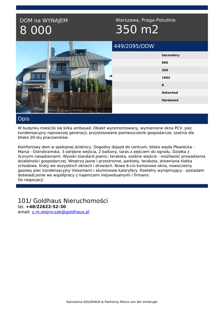 DOM na WYNAJEM 8 000 Warszawa, Praga-Południe 350 m2 449/2095/ODW Secondary 600 350 1992 8 Detached Hardened Opis W budynku mieściło się kilka ambasad. Obiekt wyremontowany, wymienione okna PCV, piec kondensacyjny najnowszej generacji, przystosowane pomieszczenie gospodarcze, szatnia dla blisko 20-stu pracowników. Komfortowy dom w spokojnej dzielnicy. Dogodny dojazd do centrum, blisko węzła Płowiecka Marsa - Ostrobramska. 3 odrębne wejścia, 2 balkony, taras z zejściem do ogrodu. Działka z licznymi nasadzeniami. Wysoki standard piwnic: terakota, osobne wejście - możliwość prowadzenia działalności gospodarczej. Wnętrza jasne i przestronne, parkiety, terakota, drewniana klatka schodowa. Kraty we wszystkich oknach i drzwiach. Nowe 6-cio komorowe okna, nowoczesny gazowy piec kondensacyjny Viessmann i aluminiowe kaloryfery. Rzetelny wynajmujący - posiadam doświadczenie we współpracy z najemcami indywidualnymi i firmami. Do negocjacji 101/ Goldhaus Nieruchomości tel. +48/22622-52-30 email: [email protected] Kancelaria GOLDHAUS & Partnerzy Marco von der Vanbrugh Powered by TCPDF (www.tcpdf.org)