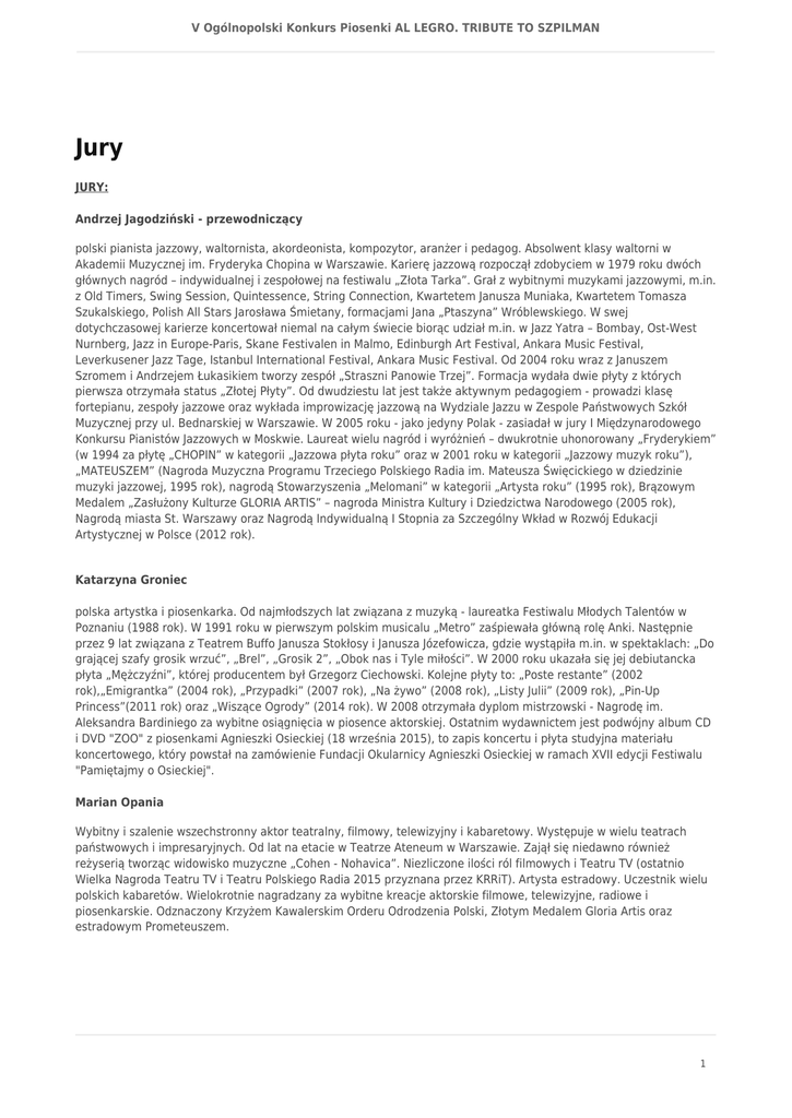 V Ogólnopolski Konkurs Piosenki AL LEGRO. TRIBUTE TO SZPILMAN Jury JURY: Andrzej Jagodziński - przewodniczący polski pianista jazzowy, waltornista, akordeonista, kompozytor, aranżer i pedagog. Absolwent klasy waltorni w Akademii Muzycznej im. Fryderyka Chopina w Warszawie. Karierę jazzową rozpoczął zdobyciem w 1979 roku dwóch głównych nagród – indywidualnej i zespołowej na festiwalu „Złota Tarka”. Grał z wybitnymi muzykami jazzowymi, m.in. z Old Timers, Swing Session, Quintessence, String Connection, Kwartetem Janusza Muniaka, Kwartetem Tomasza Szukalskiego, Polish All Stars Jarosława Śmietany, formacjami Jana „Ptaszyna” Wróblewskiego. W swej dotychczasowej karierze koncertował niemal na całym świecie biorąc udział m.in. w Jazz Yatra – Bombay, Ost-West Nurnberg, Jazz in Europe-Paris, Skane Festivalen in Malmo, Edinburgh Art Festival, Ankara Music Festival, Leverkusener Jazz Tage, Istanbul International Festival, Ankara Music Festival. Od 2004 roku wraz z Januszem Szromem i Andrzejem Łukasikiem tworzy zespół „Straszni Panowie Trzej”. Formacja wydała dwie płyty z których pierwsza otrzymała status „Złotej Płyty”. Od dwudziestu lat jest także aktywnym pedagogiem - prowadzi klasę fortepianu, zespoły jazzowe oraz wykłada improwizację jazzową na Wydziale Jazzu w Zespole Państwowych Szkół Muzycznej przy ul. Bednarskiej w Warszawie. W 2005 roku - jako jedyny Polak - zasiadał w jury I Międzynarodowego Konkursu Pianistów Jazzowych w Moskwie. Laureat wielu nagród i wyróżnień – dwukrotnie uhonorowany „Fryderykiem” (w 1994 za płytę „CHOPIN” w kategorii „Jazzowa płyta roku” oraz w 2001 roku w kategorii „Jazzowy muzyk roku”), „MATEUSZEM” (Nagroda Muzyczna Programu Trzeciego Polskiego Radia im. Mateusza Święcickiego w dziedzinie muzyki jazzowej, 1995 rok), nagrodą Stowarzyszenia „Melomani” w kategorii „Artysta roku” (1995 rok), Brązowym Medalem „Zasłużony Kulturze GLORIA ARTIS” – nagroda Ministra Kultury i Dziedzictwa Narodowego (2005 rok), Nagrodą miasta St. Warszawy oraz Nagrodą Indywidualną I Stopnia za Szczególny Wkład w Rozwój Edukacji Artystycznej w Polsce (2012 rok). Katarzyna Groniec polska artystka i piosenkarka. Od najmłodszych lat związana z muzyką - laureatka Festiwalu Młodych Talentów w Poznaniu (1988 rok). W 1991 roku w pierwszym polskim musicalu „Metro” zaśpiewała główną rolę Anki. Następnie przez 9 lat związana z Teatrem Buffo Janusza Stokłosy i Janusza Józefowicza, gdzie wystąpiła m.in. w spektaklach: „Do grającej szafy grosik wrzuć”, „Brel”, „Grosik 2”, „Obok nas i Tyle miłości”. W 2000 roku ukazała się jej debiutancka płyta „Mężczyźni”, której producentem był Grzegorz Ciechowski. Kolejne płyty to: „Poste restante” (2002 rok),„Emigrantka” (2004 rok), „Przypadki” (2007 rok), „Na żywo” (2008 rok), „Listy Julii” (2009 rok), „Pin-Up Princess”(2011 rok) oraz „Wiszące Ogrody” (2014 rok). W 2008 otrzymała dyplom mistrzowski - Nagrodę im. Aleksandra Bardiniego za wybitne osiągnięcia w piosence aktorskiej. Ostatnim wydawnictem jest podwójny album CD i DVD "ZOO" z piosenkami Agnieszki Osieckiej (18 września 2015), to zapis koncertu i płyta studyjna materiału koncertowego, który powstał na zamówienie Fundacji Okularnicy Agnieszki Osieckiej w ramach XVII edycji Festiwalu "Pamiętajmy o Osieckiej". Marian Opania Wybitny i szalenie wszechstronny aktor teatralny, filmowy, telewizyjny i kabaretowy. Występuje w wielu teatrach państwowych i impresaryjnych. Od lat na etacie w Teatrze Ateneum w Warszawie. Zajął się niedawno również reżyserią tworząc widowisko muzyczne „Cohen - Nohavica”. Niezliczone ilości ról filmowych i Teatru TV (ostatnio Wielka Nagroda Teatru TV i Teatru Polskiego Radia 2015 przyznana przez KRRiT). Artysta estradowy. Uczestnik wielu polskich kabaretów. Wielokrotnie nagradzany za wybitne kreacje aktorskie filmowe, telewizyjne, radiowe i piosenkarskie. Odznaczony Krzyżem Kawalerskim Orderu Odrodzenia Polski, Złotym Medalem Gloria Artis oraz estradowym Prometeuszem. 1
