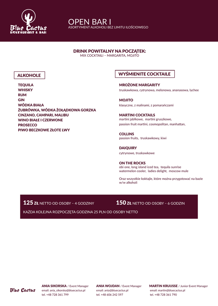 OPEN BAR I ASORTYMENT ALKOHOLI BEZ LIMITU ILOŚCIOWEGO DRINK POWITALNY NA POCZĄTEK: MIX COCKTAILI – MARGARITA, MOJITO ALKOHOLE WYŚMIENITE COCKTAILE TEQUILA WHISKY RUM GIN WÓDKA BIAŁA ŻUBRÓWKA, WÓDKA ŻOŁĄDKOWA GORZKA CINZANO, CAMPARI, MALIBU WINO BIAŁE I CZERWONE PROSECCO PIWO BECZKOWE ZŁOTE LWY MROŻONE MARGARITY truskawkowa, cytrynowa, melonowa, ananasowa, lychee MOJITO klasyczne, z malinami, z pomarańczami MARTINI COCKTAILS martini jabłkowe, martini gruszkowe, passion fruit martini, cosmopolitan, manhattan, COLLINS passion fruits, truskawkowy, kiwi DAIQUIRY cytrynowe, truskawkowe ON THE ROCKS obi one, long island iced tea, tequila sunrise watermelon cooler, ladies delight, moscow mule Oraz wszystkie koktajle, które można przygotować na bazie w/w alkoholi 125 ZŁ NETTO OD OSOBY – 4 GODZINY 150 ZŁ NETTO OD OSOBY – 6 GODZIN KAŻDA KOLEJNA ROZPOCZĘTA GODZINA 25 PLN OD OSOBY NETTO ANIA SIKORSKA / Event Manager ANIA WOJDAN / Event Manager MARTIN KRUIJSSE / Junior Event Manager email: [email protected] tel. +48 728 361 799 email: [email protected] tel. +48 606 242 597 email: [email protected] tel. +48 728 361 790 OPEN BAR II ASORTYMENT ALKOHOLI BEZ LIMITU ILOŚCIOWEGO DRINK POWITALNY NA POCZĄTEK: PROSECCO ALKOHOLE WYŚMIENITE COCKTAILE WHISKY RUM GIN WÓDKA BIAŁA CINZANO, CAMPARI, MALIBU WINO BIAŁE I CZERWONE PROSECCO PIWO BECZKOWE ZŁOTE LWY MOJITO 90 ZŁ NETTO OD OSOBY – 4 GODZINY 110 ZŁ NETTO OD OSOBY – 6 GODZIN KAŻDA KOLEJNA ROZPOCZĘTA GODZINA 20 PLN OD OSOBY NETTO klasyczne, z malinami, z pomarańczami MARTINI COCKTAILS martini jabłkowe, martini gruszkowe, passion fruit martini, cosmopolitan, manhattan, COLLINS passion fruits, truskawkowy, kiwi DAIQUIRY cytrynowe, truskawkowe ON THE ROCKS obi one, long island iced tea, tequila sunrise watermelon cooler, ladies delight, moscow mule Oraz wszystkie koktajle, które można przygotować na bazie w/w alkoholi 25 ZŁ NETTO OD OSOBY + ANIA SIKORSKA / Event Manager ANIA WOJDAN / Event Manager MARTIN KRUIJSSE / Junior Event Manager email: [email protected] tel. +48 728 361 799 email: [email protected] tel. +48 606 242 597 email: [email protected] tel. +48 728 361 790 OPEN BAR III ASORTYMENT ALKOHOLI BEZ LIMITU ILOŚCIOWEGO DRINK POWITALNY NA POCZĄTEK: PROSECCO ALKOHOLE WYŚMIENITE COCKTAILE WÓDKA BIAŁA WINO BIAŁE I CZERWONE PROSECCO PIWO BECZKOWE ZŁOTE LWY APPLE MARTINI PEAR MARTINI CHERRY MARTINI 65 ZŁ NETTO OD OSOBY – 4 GODZINY 85 ZŁ NETTO OD OSOBY – 6 GODZIN KAŻDA KOLEJNA ROZPOCZĘTA GODZINA 20 PLN OD OSOBY NETTO STRAWBERRY COLLINS PASSIONFRUIT COLLINS WATERMELON COLLINS CAIPIROSKA MOSCOW MULE 25 ZŁ NETTO OD OSOBY + ANIA SIKORSKA / Event Manager ANIA WOJDAN / Event Manager MARTIN KRUIJSSE / Junior Event Manager email: [email protected] tel. +48 728 361 799 email: [email protected] tel. +48 606 242 597 email: [email protected] tel. +48 728 361 790