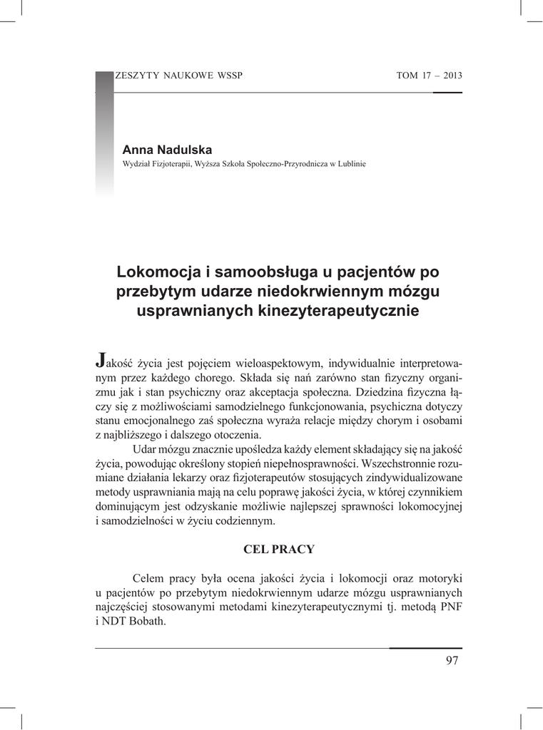 ZESZYTY NAUKOWE WSSP TOM 17 – 2013 Anna Nadulska Wydział Fizjoterapii, Wyższa Szkoła Społeczno-Przyrodnicza w Lublinie Lokomocja i samoobsługa u pacjentów po przebytym udarze niedokrwiennym mózgu usprawnianych kinezyterapeutycznie Jakość życia jest pojęciem wieloaspektowym, indywidualnie interpretowa- nym przez każdego chorego. Składa się nań zarówno stan fizyczny organizmu jak i stan psychiczny oraz akceptacja społeczna. Dziedzina fizyczna łączy się z możliwościami samodzielnego funkcjonowania, psychiczna dotyczy stanu emocjonalnego zaś społeczna wyraża relacje między chorym i osobami z najbliższego i dalszego otoczenia. Udar mózgu znacznie upośledza każdy element składający się na jakość życia, powodując określony stopień niepełnosprawności. Wszechstronnie rozumiane działania lekarzy oraz fizjoterapeutów stosujących zindywidualizowane metody usprawniania mają na celu poprawę jakości życia, w której czynnikiem dominującym jest odzyskanie możliwie najlepszej sprawności lokomocyjnej i samodzielności w życiu codziennym. CEL PRACY Celem pracy była ocena jakości życia i lokomocji oraz motoryki u pacjentów po przebytym niedokrwiennym udarze mózgu usprawnianych najczęściej stosowanymi metodami kinezyterapeutycznymi tj. metodą PNF i NDT Bobath. 97 ANNA NADULSKA MATERIAŁ I METODYKA Materiał badawczy stanowiła grupa 50 osób po przebytym udarze niedokrwiennym mózgu skierowanych po zakończonej hospitalizacji, na dalszą (3-tygodniowe kursy) rehabilitację do wyspecjalizowanych ośrodków rehabilitacyjnych w szpitalu lub przychodniach na terenie Lublina i okolic. Pacjenci dobrani do badań przed wystąpieniem choroby wykazywali zupełną samodzielność i niezależność w wykonywaniu czynności życia codziennego. Kolejnym kryterium doboru była możliwość nawiązania kontaktu werbalnego z chorym w celu wypełnienia ankiety badawczej. Narzędziem badań był kwestionariusz ankiety autorskiej składający się z czterech części: I -metryczkowej zawierającej dane osobowe i ocenę ogólnego stanu zdrowia; części II dotyczącej rehabilitacji podczas hospitalizacji- doboru, czasu trwania i intensywności działań kinezyterapeutycznych; części III składającej się z pytań dotyczących oceny aktualnych problemówstopnia niedowładu, zaburzeń w mowie i jej rozumieniem, trudności z samodzielnym spożywaniem pokarmów, kontrolą mikcji i defekacji, zaburzeń pamięci, koncentracji i afektu, czucia lęku, depresji (pacjent miał możliwość wielokrotnego wskazania problemu); części IV oceniającej stan sprawności i samopoczucie po przebytej rehabilitacji-poprawa w poruszaniu się, utrzymaniu równowagi, konieczność stosowania środków zaopatrzenia ortopedycznego, nastrój oraz jakie metody usprawniające były stosowane podczas rehabilitacji i czy pacjent akceptował stosowaną metodę. Ankieta składała się łącznie z 30 pytań. Wyniki zbiorcze badań zestawiono w tabelach. OMÓWIENIE WYNIKÓW BADAŃ Przeprowadzone badania wykazały, że pogorszenie jakości życia związane jest z upośledzeniem czynności motorycznych i lokomocyjnych. Usprawnianie metodami kinezyterapeutycznymi znacząco wpłynęło na poprawę motoryki. W badaniach uczestniczyły osoby w wieku od 34 do 68 lat, w nieznacznej większości (27 osób) byli to mężczyźni. Wśród ankietowanych 76% było aktywnych zawodowo (ponad połowa to pracownicy umysłowi), reszta nie pracowała z powodu przejścia na emeryturę. Ogólny stan zdrowia po epizodzie udaru przed podjęciem terapii specjalistycznymi metodami kinezyterapeutycznymi był oceniany przez większość pacjentów jako zły - 66% ankietowanych (tab.1). 98 LOKOMOCJA I SAMOOBSŁUGA U PACJENTÓW Tab. 1. Ocena stanu zdrowia przed działaniami rehabilitacyjnymi Stan zdrowia Odsetek badanych ( %) zły 66 dobry 28 bardzo dobry 6 Najczęstszym powikłaniem w następstwie udaru był niedowład częściowy oraz występujący rzadziej niedowład połowiczy. Niewielki odsetek stanowili pacjenci u których niedowład nie wystąpił (tab.2). Tab.2. Następstwa udaru w zakresie układu ruchu Skutek udaru Odsetek badanych (%) częściowy niedowład 81 całkowity niedowład 8 brak niedowładu 10 Wśród trudności ruchowych najczęściej zgłaszanych przez pacjentów dominowały problemy ze wstawaniem z łóżka, utrzymaniem pionowej postawy i równowagi, z samodzielnym spożywaniem posiłków, poruszaniem się, z wchodzeniem po schodach i inne (tab. 3). Każdy z pacjentów mógł udzielić więcej niż jednej odpowiedzi dlatego odsetki odpowiedzi nie sumują się. Tab.3. Najczęstsze zgłaszane przez pacjentów trudności Trudność codzienna Odsetek badanych (%) wstawanie z łóżka 90% utrzymanie równowagi 90 samodzielne spożywanie 75 posiłków chodzenie po schodach 90 samodzielne poruszanie się 90 korzystanie z toalety 85 zabiegi higieniczne 85 ubieranie się 78 pisanie 46 99 ANNA NADULSKA Ze względu na dość znacznego stopnia niesprawność ruchową pacjenci wymagali zaopatrzenia ortopedycznego wspomagającego chodzenie. w tym celu najczęściej stosowano laskę łokciową lub pachową, balkonik, ortezę, wózek inwalidzki (tab.4). Tab.4. Najczęściej używane środki zaopatrzenia ortopedycznego stosowane przez chorych przed rehabilitacją Stosowane zaopatrzenie ortopedyczne Odsetek badanych (%) laski 67 balkonik 13 orteza 3 wózek inwalidzki 7 nie stosuję 10 Udar mózgu wywołując niesprawność fizyczną spowodował u 86% pacjentów konieczność rezygnacji z pracy zarobkowej oraz znacznego stopnia ograniczenie kontaktów towarzyskich. Wpłynęło to niekorzystnie na samopoczucie będąc przyczyną pogorszenia nastroju lub depresji tab.5 Tab.5. Następstwa psychofizyczne i ekonomiczne udaru Następstwa Odsetek badanych (%) pogorszenie sprawności 100 rezygnacja z pracy zarobkowej 86 osłabienie kontaktów towarzyskich 54 osłabienie więzi rodzinnych 13 rezygnacja z aktywności sportowej 10