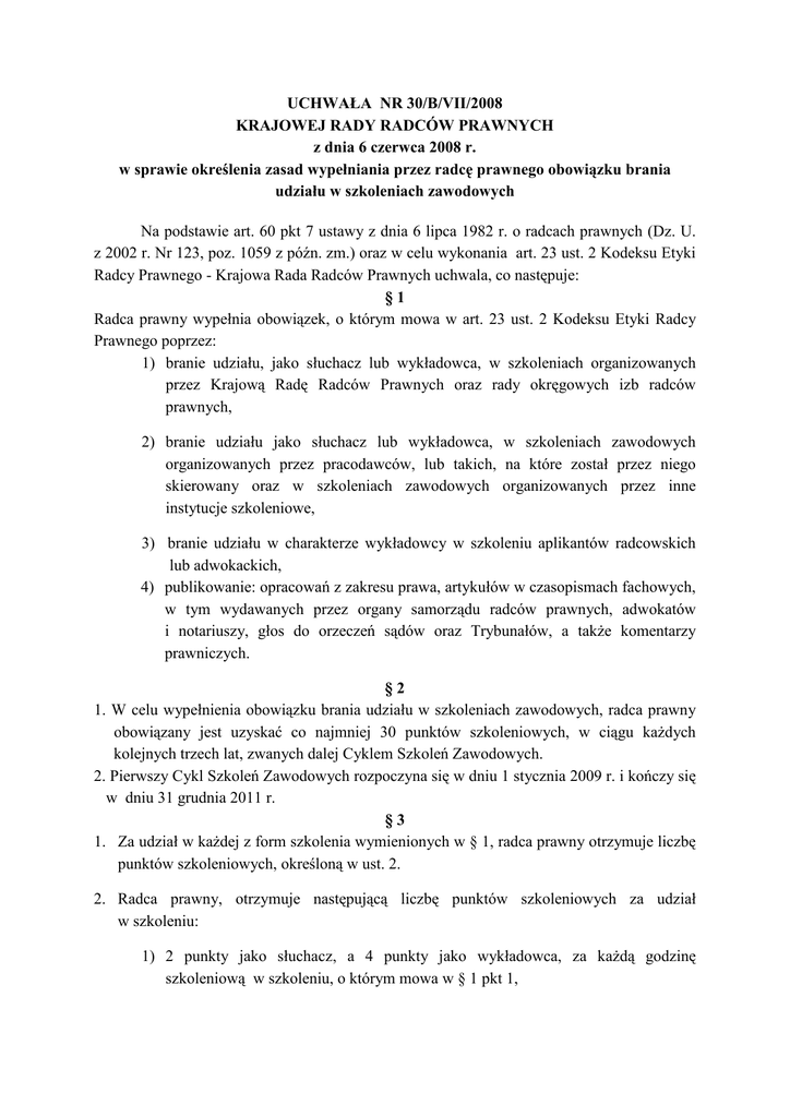 UCHWAŁA NR 30/B/VII/2008 KRAJOWEJ RADY RADCÓW PRAWNYCH z dnia 6 czerwca 2008 r. w sprawie określenia zasad wypełniania przez radcę prawnego obowiązku brania udziału w szkoleniach zawodowych Na podstawie art. 60 pkt 7 ustawy z dnia 6 lipca 1982 r. o radcach prawnych (Dz. U. z 2002 r. Nr 123, poz. 1059 z późn. zm.) oraz w celu wykonania art. 23 ust. 2 Kodeksu Etyki Radcy Prawnego - Krajowa Rada Radców Prawnych uchwala, co następuje: §1 Radca prawny wypełnia obowiązek, o którym mowa w art. 23 ust. 2 Kodeksu Etyki Radcy Prawnego poprzez: 1) branie udziału, jako słuchacz lub wykładowca, w szkoleniach organizowanych przez Krajową Radę Radców Prawnych oraz rady okręgowych izb radców prawnych, 2) branie udziału jako słuchacz lub wykładowca, w szkoleniach zawodowych organizowanych przez pracodawców, lub takich, na które został przez niego skierowany oraz w szkoleniach zawodowych organizowanych przez inne instytucje szkoleniowe, 3) branie udziału w charakterze wykładowcy w szkoleniu aplikantów radcowskich lub adwokackich, 4) publikowanie: opracowań z zakresu prawa, artykułów w czasopismach fachowych, w tym wydawanych przez organy samorządu radców prawnych, adwokatów i notariuszy, głos do orzeczeń sądów oraz Trybunałów, a takŜe komentarzy prawniczych. §2 1. W celu wypełnienia obowiązku brania udziału w szkoleniach zawodowych, radca prawny obowiązany jest uzyskać co najmniej 30 punktów szkoleniowych, w ciągu kaŜdych kolejnych trzech lat, zwanych dalej Cyklem Szkoleń Zawodowych. 2. Pierwszy Cykl Szkoleń Zawodowych rozpoczyna się w dniu 1 stycznia 2009 r. i kończy się w dniu 31 grudnia 2011 r. §3 1. Za udział w kaŜdej z form szkolenia wymienionych w § 1, radca prawny otrzymuje liczbę punktów szkoleniowych, określoną w ust. 2. 2. Radca prawny, otrzymuje następującą liczbę punktów szkoleniowych za udział w szkoleniu: 1) 2 punkty jako słuchacz, a 4 punkty jako wykładowca, za kaŜdą godzinę szkoleniową w szkoleniu, o którym mowa w § 1 pkt 1, 2) 1 punkt jako słuchacz, a 2 punkty jako wykładowca, za kaŜdą godzinę szkoleniową w szkoleniu, o którym mowa w § 1 pkt 2, 3) 1 punkt za kaŜdą godzinę szkoleniową szkolenia, o którym mowa w § 1 pkt 3, 4) 6 punktów za kaŜdą publikację, o której mowa w § 1 pkt 4. § 4 1. NiezaleŜnie od wypełnienia obowiązku, o którym mowa w § 2 ust. 1, radca prawny wpisany na listę radców prawnych, na innej podstawie niŜ odbycie aplikacji radcowskiej i zdanie egzaminu radcowskiego, obowiązany jest uczestniczyć w szkoleniu z zakresu zasad etyki radcy prawnego i historii zawodu radcy prawnego, w wymiarze co najmniej 5 godzin szkoleniowych, w ciągu pierwszych dwóch lat po wpisaniu go na listę radców prawnych. 2. Radca prawny, o którym mowa w ust. 1, który został wpisany na listę radców prawnych, w okresie od dnia 10 września 2005 r. do dnia wejścia w Ŝycie niniejszej uchwały, obowiązany jest uczestniczyć w takim szkoleniu, nie później niŜ do dnia 30 czerwca 2011 r. §5 Szkolenie zawodowe odbyte w krajach członkowskich Unii Europejskiej uwaŜa się odpowiednio za równoznaczne z wypełnieniem obowiązku szkolenia zawodowego w rozumieniu niniejszej uchwały, jeŜeli odpowiada ono jednej z form szkolenia przewidzianych w § 1. §6 1. W celu udokumentowania wypełnienia obowiązku, o którym mowa w § 2 ust. 1, radca prawny obowiązany jest złoŜyć w radzie okręgowej izby radców prawnych zaświadczenia zawierające informacje o formie i zakresie szkolenia oraz o ilości godzin szkolenia oraz dowody publikacji, o których mowa w § 1 pkt 4. 2. W przypadku szkoleń, o którym mowa w § 1 pkt 1, zaświadczenie powinno obejmować liczbę punktów. 3. Radca prawny, o którym mowa w § 4, jest obowiązany złoŜyć w radzie okręgowej izby radców prawnych dowód wypełnienia obowiązku, o którym mowa w tamtym przepisie. §7 1. Radca prawny wpisany na listę radców prawnych w okresie trwania Cyklu Szkoleń Zawodowych, obowiązany jest do wypełnienia obowiązku brania udziału w szkoleniu zawodowym, w wymiarze proporcjonalnym pozostałym do końca tego okresu. 2. Okres zawieszenia w prawie do wykonywania zawodu, trwający w czasie Cyklu Szkoleń Zawodowych, zmniejsza proporcjonalnie wymiar obowiązku udziału w szkoleniu zawodowym. §8 Radcowie prawni emeryci i renciści nie wykonujący zawodu są zwolnieni z obowiązku udziału w szkoleniach zawodowych. §9 Rada okręgowej izby radców prawnych moŜe, w drodze uchwały: 1) w szczególnie uzasadnionych przypadkach zmniejszyć, z urzędu lub na wniosek radcy prawnego, wymaganą liczbę punktów, o której mowa w § 2 ust. 1, a w szczególności w razie: choroby (chorób) trwającej co najmniej dziewięć miesięcy, okresu pobytu (pobytów) za granicą trwającego co najmniej dziewięć miesięcy w okresie Cyklu Szkoleń Zawodowych, 2) zaliczyć jako odpowiednio równoznaczne z wypełnieniem obowiązku szkolenia zawodowego, szkolenie zawodowe odbyte w jednej z form przewidzianych w § 3, za granicą w innym kraju niŜ kraju członkowskim Unii Europejskiej, a takŜe szkolenie zawodowe odbyte w kraju członkowskim Unii Europejskiej, w innej formie niŜ przewidziana w § 1. § 10 Punkty szkoleniowe uzyskane przez radców prawnych, w okresie od dnia wejścia w Ŝycie uchwały do dnia 31 grudnia 2008 r., podlegają zaliczeniu do Cyklu Szkoleń Zawodowych rozpoczynającego się w dniu 1 stycznia 2009 r. § 11 Uchwała wchodzi w Ŝycie z dniem jej podjęcia. Sekretarz Krajowej Rady Radców Prawnych /-/ Ewa Stompor-Nowicka Prezes Krajowej Rady Radców Prawnych /-/ Maciej Bobrowicz