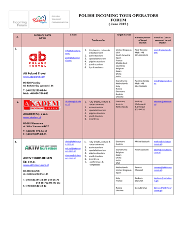 POLISH INCOMING TOUR OPERATORS FORUM ( June 2015 ) Lp. Company name adress 1. e-mail: Target market Contact person of target market e-mail to Contact person of target market United Kingdom USA South America Spain France Middle East countries Belgium Japan China India Piotr Sienicki Mob. +48 795-03-04-05 [email protected] om; Scandinavia Netherlands Italy Russia Germany Austria Ukraine Paulina Zaręba Mob. +48 604 704 685 [email protected] m; City breaks, culture & entertainment active tourism specialist tourism pilgrims tourism youth tourism Incentives Germany Austria Netherlands Andrzej Malinowski T. (+48 22) 875-04-16 akadem@akadem .pl; City breaks, culture & entertainment active tourism specialist tourism pilgrims tourism youth tourism Incentives conferences & congresses Germany Austria Michał Jasiczek michal@aktivtour s.com.pl; Scandinavia Belgium Japan China India USA Adam Jasiczek adam@aktivtours. com.pl; Netherlands United Kingdom Spain Tomasz Marszałł tomasz@aktivtour s.com.pl; Italy France Barbara Skawroń barbara@aktivtou rs.pl; Russia Ukraine Danuta Gryz danuta@aktivtour s.com.pl; Tourism offer info@abpoland. com; piotr@abpolan d.com; 1. City breaks, culture & 2. 3. 4. 5. 6. entertainment active tourism specialist tourism pilgrims tourism youth tourism Spa & wellness AB Poland Travel www.abpoland.com 05-820 Piastów Ul. Bohaterów Wolności 24 T. (+48 22) 299-03-74 Mob. +48 604-704-685 akadem@akade m.pl; 2. 1. 2. 3. 4. 5. 6. AKADEM Sp. z o.o. www.akadem.pl 02-661 Warszawa ul. Wita Stwosza 44/37 T. (+48 22) 875-04-16 F. (+48 22) 825-89-53 aktiv@aktivtour s.com.pl; 3. michal@aktivto urs.com.pl; AKTIV TOURS REISEN Sp. z o.o. www.aktivtours.com.pl 80-286 Gdańsk ul. Jaśkowa Dolina 114 T. (+48 58) 344-38-80; 344-06-70 344-38-79; 345-05-15; F. (+48 58) 520-19-13 danuta@aktivto urs.com.pl; 1. 2. 3. 4. 5. 6. 7. opole@almatur .pl; [email protected] u; info@excitingp oland.com; 4. 1. City breaks, culture & entertainment 2. specialist tourism 3. pilgrims tourism 4. youth tourism ALMATUR-OPOLE Sp. z o.o. Scandinavia United Kingdom USA Canada, Australia Grzegorz Bartecki T. (+48 77) 423-28-48 Grzegorz.b@exciti ngpoland.com; Russia Ukraine Belarus Olga Jezierska T. (+48 77) 423-28-47 ojezierska@almat ur.ru; Dorota Piotrowska T. (+48 77) 423-28-57 www.almatur.opole.pl www.almatur.ru www.excitingpoland.com www.excitingpoland.ru dpiotrowska@alm atur.ru; 45-058 Opole ul. Ozimska 26/2 T. (+48 77) 423-28-33, Fax (+48 77) 423-28-40 arturtravel@art urtravel.pl; 5. lukasz@arturtra vel.pl; konrad@arturtr avel.pl; ARTUR Travel Barłowscy Spółka Jawna 1. City breaks, culture & entertainment 2. active tourism 3. specialist tourism 4. pilgrims tourism 5. youth tourism 6. business tourism 7. Incentives 8. conferences & congresses 9. SPA & Wellness 10. Golf www.arturtravel.pl Germany Netherlands Belgium France Spain USA China India Łukasz Barłowski Mob. +48 602-109-777 lukasz@arturtrav el.pl; Scandinavia Austria United Kingdom Russia Japan Konrad Barłowski Mob. +48 602-108-777 konrad@arturtrav el.pl; Germany Austria Scandinavia Netherlands Belgium United Kingdom Italy France Spain America Malesia Ewa Weintrit mob. +48 602-231-789 [email protected] rystyka.pl; 30-319 Kraków Ul. Tyniecka 3, T. (+48 12) 651-06-63 Fax. (+48 12) 651-06-63 incoming@ave. turystyka.pl; 6. [email protected]; AVE Polonia Incoming Touroperator [email protected] yka.pl; www.ave.turystyka.pl www.ave-polonia.eu ewusiaw@op .pl; 40-527 Katowice ul. Gawronów 20 T. (+48 32) 205-38-30 1. 2. 3. 4. 5. 6. 7. pilgrims tourism City breaks Culture & heritage Actibve tourism Buisness tourism SPA&Welness Incentives [email protected]; [email protected] a.pl; Singapour Mexico Japan China India 2 avena@avenatr avel.pl; 7. AVENA TRAVEL bogacka@aven atravel.pl; www.avenatravel.pl www.go2poland.pl 31-153 Kraków ul. Szlak 65 1. 2. 3. 4. 5. 6. 7. 8. City breaks, culture & entertainment active tourism specialist tourism pilgrims tourism youth tourism business tourism Incentives conferences & congresses Germany Austria Scandinavia Netherlands Belgium United Kingdom Italy France Spain USA Russia Ukraine Japan China India City breaks, culture & entertainment pilgrims tourism youth tourism conferences & congresses Germany Japan Italy France Scandinavia USA City breaks, culture & entertainment pilgrims tourism youth tourism Incentives conferences & congresses Germany Austria Netherlands Russia Ukraine Japan T. (+48 12) 633-11-34 Fax. (48 12) 633-11-34 europol@europ ol.com.pl; 8. anna@europol. com.pl; 1. 2. 3. 4. Biuro Podróży EURO POL TOUR Sp. z o.o. avena@avenatrav el.pl; Anna Truszkowska [email protected] m.pl; www.europol.com.pl 40-160 Katowice Al. Korfantego 79 T. (+48 32) 253-02-07 Fax. (+48 32) 258-74-95 [email protected]. pl; 9. 1. 2. 3. 4. 5. [email protected]; Biuro Podróży PROFI-TOUR Andrzej Jaworski www.profi-tour.pl 53-650 Wrocław ul. Czarnieckiego 1 T. (+48 71) 344-58-99, Fax (+48 71) 344 42 81 3 10. Biuro Turystyki Szkoleń i Konferencji VISITE.PL Daria Kieraszkiewicz [email protected] l; [email protected]; 1. 2. 3. www.visite.pl Daria Kieraszewicz Mob. +48 607-566-388 [email protected]; City breaks, culture & entertainment youth tourism conferences & congresses Belgium France City breaks, culture & entertainment specialist tourism youth tourism Incentives conferences & congresses China [email protected]; City breaks, culture & entertainment active tourism specialist tourism pilgrims tourism youth tourism Incentives conferences & congresses SPA & Wellness Germany Austria Scandinavia Netherlands Belgium United Kingdom Spain Japan China India info@chopintrave l.pl; City breaks, culture & entertainment active tourism specialist tourism pilgrims tourism youth tourism Incentives conferences & congresses Germany Austria Scandinavia Netherlands Belgium United Kingdom Italy Spain USA Russia Ukraine Japan China 85-092 Bydgoszcz ul. Wyczółkowskiego 14/2 T. (+48 52) 52-14-796; Mob. +48 607-566-388 info@chinatow n-travel.pl; 11. 1. 2. 3. 4. 5