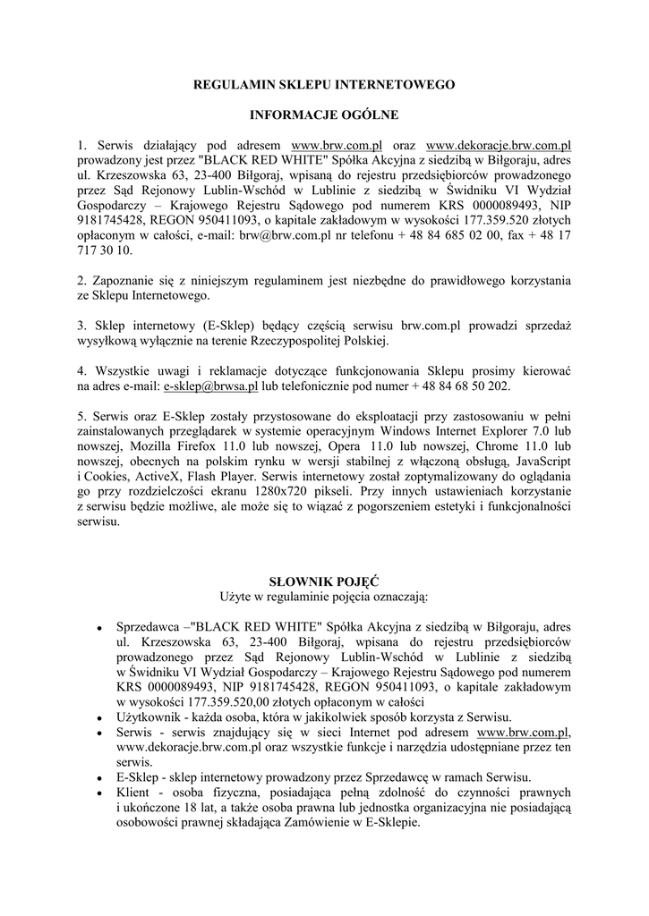 REGULAMIN SKLEPU INTERNETOWEGO INFORMACJE OGÓLNE 1. Serwis działający pod adresem www.brw.com.pl oraz www.dekoracje.brw.com.pl prowadzony jest przez "BLACK RED WHITE" Spółka Akcyjna z siedzibą w Biłgoraju, adres ul. Krzeszowska 63, 23-400 Biłgoraj, wpisaną do rejestru przedsiębiorców prowadzonego przez Sąd Rejonowy Lublin-Wschód w Lublinie z siedzibą w Świdniku VI Wydział Gospodarczy – Krajowego Rejestru Sądowego pod numerem KRS 0000089493, NIP 9181745428, REGON 950411093, o kapitale zakładowym w wysokości 177.359.520 złotych opłaconym w całości, e-mail: [email protected] nr telefonu + 48 84 685 02 00, fax + 48 17 717 30 10. 2. Zapoznanie się z niniejszym regulaminem jest niezbędne do prawidłowego korzystania ze Sklepu Internetowego. 3. Sklep internetowy (E-Sklep) będący częścią serwisu brw.com.pl prowadzi sprzedaż wysyłkową wyłącznie na terenie Rzeczypospolitej Polskiej. 4. Wszystkie uwagi i reklamacje dotyczące funkcjonowania Sklepu prosimy kierować na adres e-mail: [email protected] lub telefonicznie pod numer + 48 84 68 50 202. 5. Serwis oraz E-Sklep zostały przystosowane do eksploatacji przy zastosowaniu w pełni zainstalowanych przeglądarek w systemie operacyjnym Windows Internet Explorer 7.0 lub nowszej, Mozilla Firefox 11.0 lub nowszej, Opera 11.0 lub nowszej, Chrome 11.0 lub nowszej, obecnych na polskim rynku w wersji stabilnej z włączoną obsługą, JavaScript i Cookies, ActiveX, Flash Player. Serwis internetowy został zoptymalizowany do oglądania go przy rozdzielczości ekranu 1280x720 pikseli. Przy innych ustawieniach korzystanie z serwisu będzie możliwe, ale może się to wiązać z pogorszeniem estetyki i funkcjonalności serwisu. SŁOWNIK POJĘĆ Użyte w regulaminie pojęcia oznaczają: Sprzedawca –"BLACK RED WHITE" Spółka Akcyjna z siedzibą w Biłgoraju, adres ul. Krzeszowska 63, 23-400 Biłgoraj, wpisana do rejestru przedsiębiorców prowadzonego przez Sąd Rejonowy Lublin-Wschód w Lublinie z siedzibą w Świdniku VI Wydział Gospodarczy – Krajowego Rejestru Sądowego pod numerem KRS 0000089493, NIP 9181745428, REGON 950411093, o kapitale zakładowym w wysokości 177.359.520,00 złotych opłaconym w całości Użytkownik - każda osoba, która w jakikolwiek sposób korzysta z Serwisu. Serwis - serwis znajdujący się w sieci Internet pod adresem www.brw.com.pl, www.dekoracje.brw.com.pl oraz wszystkie funkcje i narzędzia udostępniane przez ten serwis. E-Sklep - sklep internetowy prowadzony przez Sprzedawcę w ramach Serwisu. Klient - osoba fizyczna, posiadająca pełną zdolność do czynności prawnych i ukończone 18 lat, a także osoba prawna lub jednostka organizacyjna nie posiadającą osobowości prawnej składająca Zamówienie w E-Sklepie. Towar - produkty oferowane przez Sprzedawcę do sprzedaży w E-Sklepie. Towar jest fabrycznie nowy. Cena – cena Towaru wraz z obowiązującym podatkiem od towarów i usług (VAT) nie uwzględniająca kosztów dostawy Towaru. Umowa sprzedaży - umowa sprzedaży Towarów w rozumieniu Kodeksu Cywilnego, zawarta pomiędzy Sprzedawcą a Klientem, z wykorzystaniem serwisu internetowego E-Sklepu Koszt dostawy – ponoszony przez Klienta koszt związany z dostarczeniem Towarów zamówionych ze E-Sklepu do miejsca wskazanego przez Klienta., Zamówienie – zlecenie zakupu za Cenę Towarów złożone za pomocą mechanizmów dostępnych na stronie internetowej E-Sklepu, przez Klienta zgodnie z niniejszym Regulaminem. Ochrona danych osobowych 1. Dane osobowe przekazywane przez Użytkowników Serwisu, są przetwarzane przez Sprzedawcę. Przekazane podczas rejestracji i/lub składania zamówienia on-line dane osobowe, będą wykorzystywane wyłącznie w celu: realizacji umowy, w przypadku wyrażenia przez klienta zgody, w celu informowania o nowych produktach, usługach oraz promocjach oferowanych przez Serwis. Wyrażenie zgody nie jest warunkiem realizacji Zamówienia. 2. Użytkownik ma możliwość zarejestrowania konta w Serwisie. Z konta zarejestrowanego w ten sposób można również korzystać na stronie www.brw.com.pl. Dokonując rejestracji w Serwisie, Użytkownik dobrowolnie wyraża zgodę na przetwarzanie swoich danych osobowych, zachowując prawo do wglądu, poprawy i usunięcia ich z bazy. 3. Każdy Użytkownik ma prawo do kontroli przetwarzanych danych, które go dotyczą, zawartych w zbiorach danych oraz dostępu do swoich danych celem ich poprawiania. Każdemu Użytkownikowi po zarejestrowaniu się przysługuje wgląd do swoich danych oraz możliwość ich zmiany. Powierzone dane osobowe są przechowywane i zabezpieczone zgodnie z zasadami określonymi w obowiązujących przepisach prawa. 4. Dane osobowe nie są udostępniane innym podmiotom dla celów marketingowych. Ochrona praw autorskich 1. Zawartość stron internetowych Serwisu jest własnością firmy "BLACK RED WHITE" S.A. z siedzibą w Biłgoraju. Wszelkie prawa autorskie osobiste i majątkowe do jakichkolwiek elementów Serwisu (tekstowych, graficznych, układu strony, itp.) są zastrzeżone. Serwis oraz wszystkie jego elementy są chronione przepisami prawa, w szczególności ustawy z dnia 4 lutego 1994 roku o prawie autorskim i prawach pokrewnych (tekst jednolity Dz. U.00.80.904 z późn. zm.) oraz ustawy z dnia 16 kwietnia 1993 roku o zwalczaniu nieuczciwej konkurencji (Dz.U.93.47.211 z późn. zm.). 2. Oznaczenie www.brw.com.pl wraz z sub-domenami oraz inne znaki towarowe używane na stronach są znakami chronionymi przepisami ustawy z dnia 30 czerwca 2000r. Prawo własności przemysłowej (Dz.U. 01.49.508 z późn. zm.) oraz ustawy z dnia 16 kwietnia 1993r. o zwalczaniu nieuczciwej konkurencji (Dz.U.93.47.211 z późn. zm.). Opisy i zdjęcia produktów 1. Wszelkie informacje dotyczące towarów, w tym w szczególności katalogi, foldery, broszury, inne materiały informacyjne lub reklamowe, a także informacje zamieszczone na stronie Serwisu przez Sprzedawcę, kierowane do odbiorców i potencjalnych kli