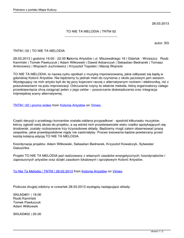Pobrano z portalu Mapa Kultury 28.03.2013 TO NIE TA MELODIA | TNTM 02 ____________________________ autor: SG TNTM | 02 | TO NIE TA MELODIA 28.03.2013 | godzina 19.00 - 22.00 Kolonia Artystów | ul. Miszewskiego 18 | Gdańsk - Wrzeszcz Roob Kamiński | Tomek Pawluczuk | Adam Witkowski | Dawid Adrjanczyk | Sebastian Bednarek | Tomasz Antonowicz | Wojciech Juchniewicz | Krzysztof Topolski | Maciej Wojnicki TO NIE TA MELODIA, to nazwa cyklu spotkań z muzyką improwizowaną, jakie odbywać się będą w gdańskiej Kolonii Artystów. Nie będziemy tu jednak mieli do czynienia z około jazzowym jam session. Występujący na nich artyści byli do tej pory kojarzeni raczej z alternatywnym rockiem i elektroniką, niż z poszukiwaniami na polu improwizacji. Odrzucenie rutyny to właśnie metoda, którą organizatorzy całego przedsięwzięcia chcą osiągnąć jeden z jego celów – poszerzanie doświadczenia oraz integracja trójmiejskiej sceny alternatywnej. TNTM | 02 | promo wideo from Kolonia Artystów on Vimeo. Część decyzji o przebiegu koncertów została oddana przypadkowi - spośród kilkunastu muzyków, którzy zgłosili swój akces do projektu, a są wśród nich przedstawiciele wielu rzadko spotykających się środowisk, zostały rozlosowane trzy trzyosobowe składy. Będziemy mogli zatem obserwować pracę zespołów, jakie prawdopodobnie nigdy nie zaistniałyby. Proces losowania będzie powtarzany przed każdą kolejną edycją TO NIE TA MELODIA. Koordynacja projektu: Adam Witkowski, Sebastian Bednarek, Krzysztof Kowalczyk, Sylwester Galuschka Projekt TO NIE TA MELODIA jest realizowany z własnych zasobów energetycznych: koordynatorów i zaproszonych artystów oraz dzięki zasobom lokalowym i sprzętowym Kolonii Artystów. To Nie Ta Melodia | TNTM | 28.02.2013 from Kolonia Artystów on Vimeo. Podczas drugiej odsłony w czwartek 28.03.2013 wystąpią następujące składy: SKŁAD#01 | 19.00 Roob Kamiński Tomek Pawluczuk Adam Witkowski SKŁAD#02 | 20.00 strona 1 / 2 Pobrano z portalu Mapa Kultury Dawid Adrjanczyk Sebastian Bednarek Tomasz Antonowicz Skład#03 | 21.00 Wojciech Juchniewicz Krzysztof Topolski Maciej Wojnicki Ilość miejsc ograniczona. Wstęp free! Prosimy nie przynoście napojów alkoholowych. Po koncertach zapraszamy do Cafe Fikcja (Gdańsk Wrzeszcz al. Grunwaldzka 99/101). Dla gości KA zniżki 10% w barze na hasło: ToNieTaMelodia strona 2 / 2