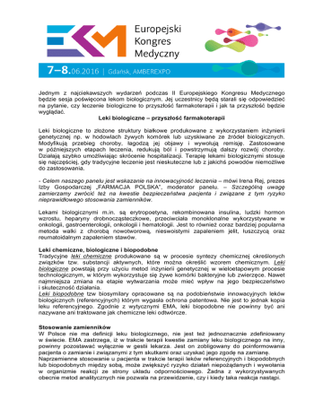 Jednym z najciekawszych wydarzeń podczas II Europejskiego Kongresu Medycznego będzie sesja poświęcona lekom biologicznym. Jej uczestnicy będą starali się odpowiedzieć na pytanie, czy leczenie biologiczne to przyszłość farmakoterapii i jak ta przyszłość będzie wyglądać. Leki biologiczne – przyszłość farmakoterapii Leki biologiczne to złożone struktury białkowe produkowane z wykorzystaniem inżynierii genetycznej np. w hodowlach żywych komórek lub uzyskiwane ze źródeł biologicznych. Modyfikują przebieg choroby, łagodzą jej objawy i wywołują remisję. Zastosowane w późniejszych etapach leczenia, redukują ból i powstrzymują dalszy rozwój choroby. Działają szybko umożliwiając skrócenie hospitalizacji. Terapię lekami biologicznymi stosuje się najczęściej, gdy tradycyjne leczenie jest nieskuteczne lub z jakichś powodów niemożliwe do zastosowania. - Celem naszego panelu jest wskazanie na innowacyjność leczenia – mówi Irena Rej, prezes Izby Gospodarczej „FARMACJA POLSKA”, moderator panelu. – Szczególną uwagę zamierzamy zwrócić też na kwestie bezpieczeństwa pacjenta i związane z tym ryzyko nieprawidłowego stosowania zamienników. Lekami biologicznymi m.in. są erytropoetyna, rekombinowana insulina, ludzki hormon wzrostu, heparyny drobnocząsteczkowe, przeciwciała monoklonalne wykorzystywane w onkologii, gastroenterologii, onkologii i hematologii. Jest to również coraz bardziej popularna metoda walki z chorobą nowotworową, nieswoistymi zapaleniem jelit, łuszczycą oraz reumatoidalnym zapaleniem stawów. Leki chemiczne, biologiczne i biopodobne Tradycyjne leki chemiczne produkowane są w procesie syntezy chemicznej określonych związków tzw. substancji aktywnych, które można określić wzorem chemicznym. Leki biologiczne powstają przy użyciu metod inżynierii genetycznej w wieloetapowym procesie technologicznym, w którym wykorzystuje się żywe komórki bakteryjne lub zwierzęce. Nawet najmniejsza zmiana na etapie wytwarzania może mieć wpływ na jego bezpieczeństwo i skuteczność działania. Leki biopodobne tzw biosymilary opracowane są na podobieństwie innowacyjnych leków biologicznych (referencyjnych) którym wygasła ochrona patentowa. Nie jest to jednak kopia leku referencyjnego. Zgodnie z wytycznymi EMA, leki biopodobne nie powinny być ani nazywane ani traktowane jak chemiczne leki odtwórcze. Stosowanie zamienników W Polsce nie ma definicji leku biologicznego, nie jest też jednoznacznie zdefiniowany w świecie. EMA zastrzega, iż w trakcie terapii kwestie zamiany leku biologicznego na inny, powinny pozostawać wyłącznie w gestii lekarza. Jest on zobligowany do poinformowania pacjenta o zamianie i związanymi z tym skutkami oraz uzyskać jego zgodę na zamianę. Naprzemienne stosowanie u pacjenta w trakcie terapii leków referencyjnych i biopodobnych lub biopodobnych między sobą, może zwiększyć ryzyko działań niepożądanych i wywołania w organizmie reakcji ze strony układu odpornościowego. Żadna z wykorzystywanych obecnie metod analitycznych nie pozwala na przewidzenie, czy i kiedy taka reakcja nastąpi.