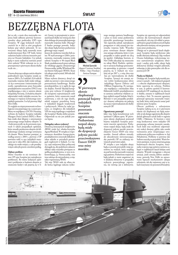 12 ŚWIAT 6–12 czerwca 2014 r. BEZZĘBNA FLOTA Już za rok, a może dwa marynarka wojenna Indii odbierze pierwszy konwencjonalny okręt podwodny (OP) typu Scorpène. W ciągu kolejnych trzech– czterech lat w ślad za nim przypłynie kolejne pięć takich jednostek. Te nowoczesne okręty będą stanowiły trzon modernizowanej floty OP Indii, której zadaniem będzie ochrona interesów państwa na Oceanie Indyjskim. Czy jednak będą w stanie realizować stawiane przed nimi zadania? Wiele wskazuje na to, że przynajmniej w pierwszym okresie służby wcale nie… Umowa dotycząca zakupu sześciu okrętów podwodnych typu Scorpène została zawarta w 2005 r. Za 3 mld dol. (9,14 mld zł) marynarka wojenna Indii miała wzbogacić się o nowoczesne i śmiercionośne jednostki, zaprojektowane przez francuskie przedsiębiorstwo stoczniowe DNCS oraz współpracującą z nim w tamtym okresie hiszpańską Navantię. Za budowę okrętów odpowiadać miały indyjskie stocznie, korzystające ze wsparcia technicznego europejskich partnerów. I to był pierwszy błąd New Delhi. Ze względu na nieprzystosowanie technologiczne oraz pojawiające się z czasem problemy we współpracy z DCNS i Navantią, wybrane do budowy Scorpène indyjskie Mazagon Dock Limited (MDL) z Bombaju miało duże kłopoty z utrzymaniem narzuconego tempa budowy okrętów. Te z kolei przyczyniły się do powstania typowych w takich przypadkach opóźnień, które zmusiły producenta okrętów do kilkukrotnego ustalania nowego terminarza ich dostaw. Warto bowiem pamiętać, że według umowy z 2005 r., pierwszy z OP powinien trafić w ręce indyjskich marynarzy już w roku 2012. Jak wiadomo, nic takiego nie miało miejsca, a całe przedsięwzięcie zaliczyło prawie czteroletni poślizg. fot: fotolia Głębszy problem Mimo wszystko to nie terminarz dostaw OP typu Scorpène jest największym problemem. Bo mimo kolejnych opóźnień i problemów w budowie okrętów, te ostatecznie kiedyś i tak pojawią się w li- nii. Gorzej, że przynajmniej w pierwszych latach służby nie wniosą one zbyt dużo dobrego do potencjału bojowego marynarki wojennej Indii. Dlaczego? Z bardzo prostego powodu. Indyjskie okręty będą bowiem pozbawione głównego oręża: torped. Jeszcze do niedawna wszystko było jasne. W myśl zawartego w 2010 r. porozumienia, marynarka wojenna miała uzbroić Scorpène w 98 torped Black Shark, produkowanych przez należącą do włoskiego giganta zbrojeniowego Finmeccanikę, spółkę Whitehead Alenia Sistemi Subacquei (WASS). Koszt ich zakupu miał wynieść 300 mln dol. (916 mln zł). Mimo wyboru dostawcy, dotąd nie udało się zawrzeć z nim ostatecznego porozumienia handlowego. Bardzo prawdopodobne, że w ogóle do tego nie dojdzie. Powód? Skandal korupcyjny przy wyborze 12 śmigłowców do transportu najważniejszych osób w państwie, który ostatecznie został anulowany, a nim do tego doszło, zdołał rozpętać prawdziwą burzę w indyjskich kręgach wojskowych i politycznych. Można by zadać pytanie, co śmigłowce dla indyjskich VIP-ów mają wspólnego z torpedami dla Scorpène? Bardzo dobre pytanie. Odpowiedź na nie jest jednak jeszcze lepsza. Nielegalny sukces rynkowy? Dostawcą nieszczęsnych śmigłowców AW101 miała być włosko-brytyjska AgustaWestland. W związku ze wspomnianym skandalem korupcyjnym, przedsiębiorstwo otrzymało kilkuletni zakaz udziału w przyszłych przetargach rządowych w Indiach. Co więcej, część miejscowej klasy politycznej domagała się, aby podobnym zakazem obłożyć także wszystkie powiązane ze spółką przedsiębiorstwa, w tym m.in. kontrolującą ją Finmeccanikę oraz inne należące do niej podmioty, a więc także wspomnianą WASS. Tak więc WASS stała się ofiarą nie do końca legalnego sukcesu rynko- Michał Jarocki ekspert Centrum Studiów Polska – Azja i Fundacji Amicus Europae W pierwszym okresie eksploatacji potencjał bojowy indyjskich Scorpène pozostanie znacznie ograniczony. Pozbawione torped okręty, będą miały do dyspozycji jedynie pociski przeciwokrętowe Exocet SM39 oraz miny morskie. wego swojego partnera handlowego i przez to może zostać pozbawiona niezwykle prestiżowego kontraktu. Tak naprawdę jednak największym przegranym w całej sytuacji jest marynarka wojenna Indii. Wszystko przez terminarze dostaw okrętów oraz samego uzbrojenia, które w tym przypadku w żaden sposób nie chcą się zgodzić. Zakładając bowiem, że New Delhi zdecyduje się ostatecznie na zakup Black Sharków, opóźnienia w zawarciu finalnego porozumienia spowodują, że pierwsze z torped pojawią się w Indiach nie wcześniej niż po 2017 r., a więc dwa–trzy lata po wprowadzeniu do służby Scorpène. Sytuacji nie uratuje nawet wybór konkurencyjnej oferty indyjskiego Pipavav Defence and Offshore Engineering. Po nawiązaniu współpracy z niemieckim Atlas Elektronik GmbH, przedsiębiorstwo to zamierza zaoferować władzom zakup ciężkich torped Seahake Mod.4. Również w tym przypadku produkcja i dostawy uzbrojenia nie pokryją się raczej z wprowadzaniem do służby nowych OP. Ograniczony potencjał Jakie więc będą konsekwencje tych opóźnień? Całkiem spore. W pierwszym okresie eksploatacji potencjał bojowy indyjskich Scorpène pozostanie znacznie ograniczony. Pozbawione torped okręty, będą miały do dyspozycji jedynie pociski przeciwokrętowe Exocet SM39 oraz miny morskie. Arsenał całkiem niemały, ale zdecydowanie niewystarczający, aby pozwolić OP na realizację stawianych przed nimi zadań. W związku z tym indyjskie okręty będą co prawda prowadziły misje patrolowe na wodach, które znajdują się pod kontrolą marynarki wojennej tego państwa. Pozbawione torped nie będą jednak w stanie angażować się w działania ofensywne w przypadku wykrycia potencjalnego zagrożenia, nie mówiąc już o defensywie. Scorpène nie zapewnią też odpowiedniej ochrony dla konwojowanych okrętów nawodnych, tak więc ich wkład w pote
