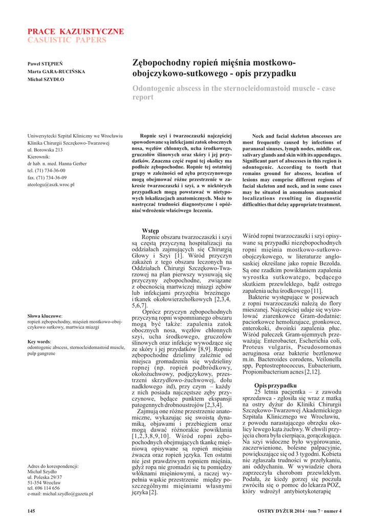 PRACE KAZUISTYCZNE CASUISTIC PAPERS Paweł STĘPIEŃ Marta GARA-RUCIŃSKA Michał SZYDŁO Zębopochodny ropień mięśnia mostkowoobojczykowo-sutkowego - opis przypadku Odontogenic abscess in the sternocleidomastoid muscle - case report Uniwersytecki Szpital Kliniczny we Wrocławiu Klinika Chirurgii Szczękowo-Twarzowej ul. Borowska 213 Kierownik: dr hab. n. med. Hanna Gerber tel. (71) 734-36-00 fax. (71) 734-36-09 [email protected] Słowa kluczowe: ropień zębopochodny, mięsień mostkowo-obojczykowo sutkowy, martwica miazgi Key words: odontogenic abscess, sternocleidomastoid muscle, pulp gangrene Adres do korespondencji: Michał Szydło ul. Poleska 29/37 51-354 Wrocław tel. 696 114 656 e-mail: [email protected] 145 Ropnie szyi i twarzoczaszki najczęściej spowodowane są infekcjami zatok obocznych nosa, węzłów chłonnych, ucha środkowego, gruczołów ślinowych oraz skóry i jej przydatków. Znaczna część ropni tej okolicy ma podłoże zębopochodne. Ropnie tej ostatniej grupy w zależności od zęba przyczynowego mogą obejmować różne przestrzenie w zakresie twarzoczaszki i szyi, a w niektórych przypadkach mogą powstawać w nietypowych lokalizacjach anatomicznych. Może to nastręczać trudności diagnostyczne i opóźniać wdrożenie właściwego leczenia. Wstęp Ropnie obszaru twarzoczaszki i szyi są częstą przyczyną hospitalizacji na oddziałach zajmujących się Chirurgią Głowy i Szyi [1]. Wśród przyczyn zakażeń z tego obszaru leczonych na Oddziałach Chirurgi Szczękowo-Twarzowej na plan pierwszy wysuwają się przyczyny zębopochodne, związane z obecnością martwiczej miazgi zębów lub infekcjami przyzębia brzeżnego i tkanek okołowierzchołkowych [2,3,4, 5,6,7]. Oprócz przyczyn zębopochodnych przyczyną ropni wspomnianego obszaru mogą być także: zapalenia zatok obocznych nosa, węzłów chłonnych szyi, ucha środkowego, gruczołów ślinowych oraz infekcje wywodzące się ze skóry i jej przydatków [8,9]. Ropnie zębopochodne dzielimy zależnie od miejsca gromadzenia się wydzieliny ropnej (np. ropień podbródkowy, okołożuchwowy, podjęzykowy, przestrzeni skrzydłowo-żuchwowej, dołu nadkłowego itd), przy czym – każdy z nich posiada najczęstsze zęby przyczynowe, będące punktem ekspansji patogennych drobnoustrojów [2,3,4]. Zajmują one różne przestrzenie anatomiczne, wykazując się swoistą dynamiką, objawami i przebiegiem oraz mogą dawać różnorakie powikłania [1,2,3,8,9,10]. Wśród ropni zębopochodnych obejmujących tkankę mięśniową opisywane są ropień mięśnia żwacza oraz ropień języka. Ten ostatni nie jest prawdziwym ropniem mięśnia, gdyż ropa nie gromadzi się tu pomiędzy włóknami mięśniowymi, a raczej wypełnia wąskie przestrzenie między poszczególnymi mięśniami własnymi języka [2]. Neck and facial skeleton abscesses are most frequently caused by infections of paranasal sinuses, lymph nodes, middle ear, salivary glands and skin with its appendages. Significant part of abscesses in this region is odontogenic. According to tooth that remains ground for abscess, location of lesions may comprise different regions of facial skeleton and neck, and in some cases may be situated in anomalous anatomical localizations resulting in diagnostic difficulties that delay appropriate treatment. Wśród ropni twarzoczaszki i szyi opisywane są przypadki niezębopochodnych ropni mięśnia mostkowo-sutkowoobojczykowego, w literaturze anglosaskiej określane jako ropnie Bezolda. Są one rzadkim powikłaniem zapalenia wyrostka sutkowatego, będącego skutkiem przewlekłego, bądź ostrego zapalenia ucha środkowego [11]. Bakterie występujące w posiewach z ropni twarzoczaszki należą do flory mieszanej. Najczęściej udaje się wyizolować ziarenkowce Gram-dodatnie: paciorkowce hemolizujace, gronkowce, enterokoki, dwoinki zapalenia płuc. Wśród pałeczek Gram-ujemnych przeważają: Enterobacter, Escherichia coli, Proteus vulgaris, Pseudosomonas aeruginosa oraz bakterie beztlenowe m.in. Bacteroides corodens, Veilonella spp, Peptostreptococcus, Eubacterium, Propionibacterium acnes [2,12]. Opis przypadku 25 letnia pacjentka – z zawodu sprzedawca - zgłosiła się wraz z matką na ostry dyżur do Kliniki Chirurgii Szczękowo-Twarzowej Akademickiego Szpitala Klinicznego we Wrocławiu, z powodu narastającego obrzęku okolicy lewego kąta żuchwy. W chwili przyjęcia chora była cierpiąca, gorączkująca. Na szyi widoczne było wygórowanie, zaczerwienione, bolesne palpacyjnie, powiększające się od 3 tygodni. Kobieta nie zgłaszała trudności w przełykaniu, ani oddychaniu. W wywiadzie chora zaprzeczyła chorobom przewlekłym. Podała, że kiedy gorzej się poczuła zwróciła się o pomoc do lekarza POZ, który wdrożył antybiotykoterapię OSTRY DYŻUR 2014 . tom 7 . numer 4 (Amoksiklav 2 x na dobę 1000 mg), a następnie wobec braku poprawy skierował chorą na oddział chorób zakaźnych. Pacjentka była hospitalizowana na II Oddziale Chorób Zakaźnych Wojewódzkiego Szpitala Specjalistycznego im. J. Gromkowskiego we Wrocławiu, gdzie wykonano diagnostykę w kierunku chorób pasożytniczych i zakaźnych, a po wykluczeniu tychże chorą skierowano na tutejszy ostry dyżur z podejrzeniem ropnia zębopochodnego szyi. W badaniu klinicznym zwracał uwagę bardzo zły stan uzębienia chorej. Już we wstępnym badaniu kilkanaście zębów zakwalifikowano do pilnej ekstrakcji. Zadecydowano o potrzebie wykonania badania tomograficznego szyi i twarzoczaszki. Badanie obrazowe wykazało obecność zbiornika płynu w środkowej części mięśnia mostkowo-sutkowo-obojczykowego lewego o wymiarach 3,4 (ML) x 5,2 (AP) x 7,4 (SI) cm. (Ryc.1-3). Ropień uciskał przestrzeń naczyń szyjnych przemieszczając je przyśrodkowo oraz powodował zaciśnięcie światła żyły szyjnej wewnętrznej (Ryc.4). mostkowo-sutkowo-obojczykowego strony lewej uzyskując obfity wypływ cuchnącej wydzieliny ropnej. Pobrano materiał do 