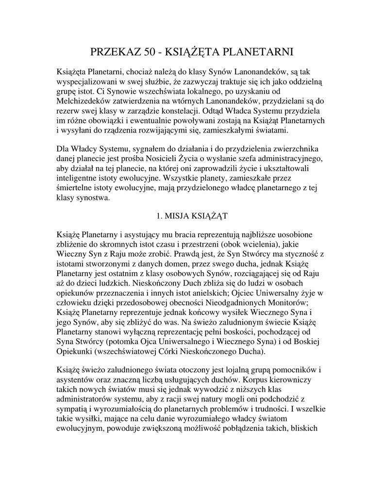 PRZEKAZ 50 - KSIĄŻĘTA PLANETARNI Książęta Planetarni, chociaż należą do klasy Synów Lanonandeków, są tak wyspecjalizowani w swej służbie, że zazwyczaj traktuje się ich jako oddzielną grupę istot. Ci Synowie wszechświata lokalnego, po uzyskaniu od Melchizedeków zatwierdzenia na wtórnych Lanonandeków, przydzielani są do rezerw swej klasy w zarządzie konstelacji. Odtąd Władca Systemu przydziela im różne obowiązki i ewentualnie powoływani zostają na Książąt Planetarnych i wysyłani do rządzenia rozwijającymi się, zamieszkałymi światami. Dla Władcy Systemu, sygnałem do działania i do przydzielenia zwierzchnika danej planecie jest prośba Nosicieli Życia o wysłanie szefa administracyjnego, aby działał na tej planecie, na której oni zaprowadzili życie i ukształtowali inteligentne istoty ewolucyjne. Wszystkie planety, zamieszkałe przez śmiertelne istoty ewolucyjne, mają przydzielonego władcę planetarnego z tej klasy synostwa. 1. MISJA KSIĄŻĄT Książę Planetarny i asystujący mu bracia reprezentują najbliższe uosobione zbliżenie do skromnych istot czasu i przestrzeni (obok wcielenia), jakie Wieczny Syn z Raju może zrobić. Prawdą jest, że Syn Stwórcy ma styczność z istotami stworzonymi z danych domen, przez swego ducha, jednak Książę Planetarny jest ostatnim z klasy osobowych Synów, rozciągającej się od Raju aż do dzieci ludzkich. Nieskończony Duch zbliża się do ludzi w osobach opiekunów przeznaczenia i innych istot anielskich; Ojciec Uniwersalny żyje w człowieku dzięki przedosobowej obecności Nieodgadnionych Monitorów; Książę Planetarny reprezentuje jednak końcowy wysiłek Wiecznego Syna i jego Synów, aby się zbliżyć do was. Na świeżo zaludnionym świecie Książę Planetarny stanowi wyłączną reprezentację pełni boskości, pochodzącej od Syna Stwórcy (potomka Ojca Uniwersalnego i Wiecznego Syna) i od Boskiej Opiekunki (wszechświatowej Córki Nieskończonego Ducha). Książę świeżo zaludnionego świata otoczony jest lojalną grupą pomocników i asystentów oraz znaczną liczbą usługujących duchów. Korpus kierowniczy takich nowych światów musi się jednak wywodzić z niższych klas administratorów systemu, aby z racji swej natury mogli oni podchodzić z sympatią i wyrozumiałością do planetarnych problemów i trudności. I wszelkie takie wysiłki, mające na celu danie wyrozumiałego władcy światom ewolucyjnym, powoduje zwiększoną możliwość pobłądzenia takich, bliskich człowiekowi osobowości, kiedy wyniosą swój własny sposób myślenia ponad i powyżej woli Najwyższych Władców. Pozostając zupełnie sami, jako reprezentanci boskości na poszczególnych planetach, Synowie ci poddawani są surowej próbie i Nebadon miał to nieszczęście, że doświadczył kilku buntów. W momencie stwarzania Władców Systemów i Książąt Planetarnych następuje uosobienie idei, która coraz bardziej oddala się od Ojca Uniwersalnego i Wiecznego Syna, i pojawia się coraz większe niebezpieczeństwo zagubienia poczucia proporcji odnośnie własnej ważności, jak również większe prawdopodobieństwo zatracenia prawidłowego pojmowania wartości i związków wzajemnych licznych klas niebiańskich istot oraz stopniowania ich kompetencji. To, że Ojciec nie jest osobiście obecny we wszechświecie lokalnym, wystawia na próbę wiarę i lojalność wszystkich tych Synów. Jednak niezbyt często się zdarza, że książęta zaniedbają swą misję organizacji i administracji sfer zamieszkałych, a ich sukces znacznie ułatwia późniejsze misje Synów Materialnych, którzy przybywają, aby zaszczepić prymitywnym ludziom, żyjącym na planetach, wyższe formy życia stworzonego. Rządy książąt przyczyniają się również znacznie do przygotowania planet na przybycie Rajskich Synów Boga, którzy później przychodzą osądzać światy i zaprowadzać kolejne systemy sprawiedliwości. 2. ADMINISTRACJA PLANETARNA Wszyscy Książęta Planetarni podlegają wszechświatowej jurysdykcji administracyjnej Gabriela, głównego administratora, działającego na rzecz Michała, podczas gdy w swych bezpośrednich rządach podlegają rozporządzeniom wykonawczym Władców Systemu. Książęta Planetarni, kiedykolwiek zechcą, mogą zasięgać porady Melchizedeków, swych byłych nauczycieli i sponsorów, ale nie wymaga się od nich arbitralnie, żeby prosili o taką pomoc i jeśli nie zażyczą sobie jej dobrowolnie, Melchizedecy nie ingerują w administrację planetarną. Światowi władcy mogą także korzystać z rady dwudziestu czterech radców, zebranych z obdarzonych światów systemu. Obecnie, w Satanii, wszyscy ci radcy pochodzą z Urantii. Analogiczna rada istnieje również w zarządzie konstelacji i składa się z siedemdziesięciu istot tak samo wybranych ze światów ewolucyjnych. Na planetach ewolucyjnych, w ich wczesnych i niepewnych początkach, rządy są zazwyczaj autokratyczne. Książęta Planetarni organizują swe specjalistyczne grupy asystentów z korpusu planetarnych pomocników. Otaczają się zazwyczaj najwyższą radą, złożoną z dwunastu istot, ale jest to różnie ustanawiane i rozmaicie egzekwowane na różnych światach. Książę Planetarny może mieć również asystentów, jednego albo i więcej, z trzeciej klasy swojej własnej grupy synostwa a czasami, na pewnych światach, asystenta z własnej klasy, wtórnego Lanonandeka. Cały personel władcy świata składa się z osobowości Nieskończonego Ducha oraz z pewnych typów wyższych, rozwiniętych istot, jak również ze wznoszących się śmiertelników z innych światów. Personel taki liczy około tysiąca istot a w miarę rozwoju planety korpus pomocników może być powiększony do stu tysięcy albo i więcej. Kiedy tylko odczuwa się potrzebę zwiększenia ilości pomocników, Książęta Planetarni mogą poprosić o nich swoich braci, Władców Systemu, a prośba ich zostanie natychmiast spełnion