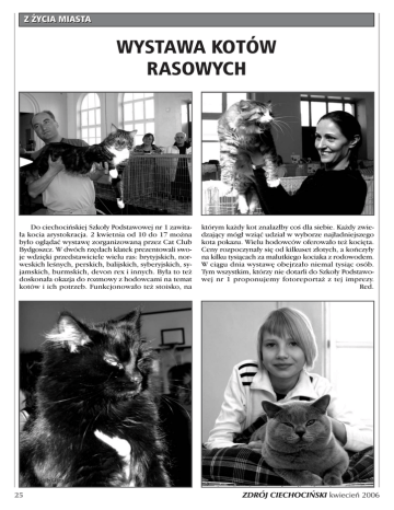 Z ˚YCIA MIASTA WYSTAWA KOTÓW RASOWYCH Do ciechociƒskiej Szko∏y Podstawowej nr 1 zawita∏a kocia arystokracja. 2 kwietnia od 10 do 17 mo˝na by∏o oglàdaç wystaw´ zorganizowanà przez Cat Club Bydgoszcz. W dwóch rz´dach klatek prezentowali swoje wdzi´ki przedstawiciele wielu ras: brytyjskich, norweskich leÊnych, perskich, balijskich, syberyjskich, syjamskich, burmskich, devon rex i innych. By∏a to te˝ doskona∏a okazja do rozmowy z hodowcami na temat kotów i ich potrzeb. Funkcjonowa∏o te˝ stoisko, na którym ka˝dy kot znalaz∏by coÊ dla siebie. Ka˝dy zwiedzajàcy móg∏ wziàç udzia∏ w wyborze naj∏adniejszego kota pokazu. Wielu hodowców oferowa∏o te˝ koci´ta. Ceny rozpoczyna∏y si´ od kilkuset z∏otych, a koƒczy∏y na kilku tysiàcach za malutkiego kociaka z rodowodem. W ciàgu dnia wystaw´ obejrza∏o niemal tysiàc osób. Tym wszystkim, którzy nie dotarli do Szko∏y Podstawowej nr 1 proponujemy fotoreporta˝ z tej imprezy. Red. fot. Jakub Giza 25 ZDRÓJ CIECHOCI¡SKI kwiecieƒ 2006