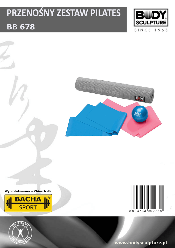 PRZENOŚNY ZESTAW PILATES BB 678 Wyprodukowano w Chinach dla: www.bodysculpture.pl PRZECIWSKAZANIA LEKARSKIE Aby zapobiegać obrażeniom i nieszczęśliwym wypadkom, każdy rodzaj wysiłku fizycznego wykonywany bez kontroli profesjonalnego trenera lub instruktora fitness powinny być przedyskutowane z lekarzem lub osobistym doradcą zdrowia. Nie przemęczaj się. W przypadku wystąpienia jakichkolwiek dolegliwości należy natychmiast przerwać ćwiczenia i w razie potrzeby skorzystać z pomocy lekarskiej. Dziękujemy za zakup PRZENOŚNEGO ZESTAWU PILATES. Ten zestaw dostarcza narzędzia umożliwiające rozwój elastyczności organizmu, uzyskanie równowagi psychofizycznej, a w efekcie - uwolnienie się od stresu i uzupełnienie energii. Zestaw zawiera: 1. Dwie gumy pilates. 2. Piłka do Pilates. 3. Mata do jogi. WPROWADZENIE DO PILATES „Muszę mieć rację. Nigdy nie zażyłem aspiryny. W życiu nie odniosłem obrażeń. Cały kraj, cały świat, powinien wykonywać moje ćwiczenia. Byliby szczęśliwsi.” Joseph Hubertus Pilates, in 1965, age 86 Może nie cały świat, ale na pewno wiele osób w tym kraju, w Kanadzie, Europie, czy Azji. Występuje prawdziwy bum na Pilates, metodę ćwiczeń i fizycznego ruchu skupioną na rozciąganiu, wzmacnianiu i utrzymywaniu równowagi ciała. A to wszystko dzięki systematyce wykonywania specyficznych ćwiczeń w połączeniu z odpowiednio modulowanym oddechem. Pilates okazał się nieoceniony nie tylko jako wsparcie dla fitness, ale również jako ważne uzupełnienie treningu w zawodowym sporcie i w rehabilitacji fizycznej wszelkiego rodzaju. Wiernie praktykowany, przynosi wiele korzyści. Zwiększa się pojemność płuc i poprawia krążenie poprzez skupienie uwagi na głębokim, zdrowym oddychaniu. Siła i elastyczność, szczególnie mięśni brzucha i pleców, koordynacja psychofizyczna, są kluczowymi elementami skutecznego programu pilates. Postawa, równowaga i wytrzymałość serca wyraźnie się poprawiają. Gęstość kości i stawów poprawa zdrowia i wiele pozytywnych efektów dla Twojego organizmu, o czym przekonasz się już po pierwszym razie. Pilaste uczy równowagi i kontroli nad ciałem, a jego oddziaływanie obejmuje swym zasięgiem również inne obszary naszego życia. W zasadzie wyposażenie Pilates obecnie nie wiele różni się od tego w przeszłości. Sprężyny do rozciągania, paski do przytrzymywania nóg i rąk, podpory dla pleców, szyi i barków są tak samo ważne dziś jak to było wówczas. Ponieważ niezwykły charakter wyposażenia stanowi zarówno wyzwanie i wsparcie dla organizmu, dlatego uczy ruchów skutecznych, niepowtarzalnie zaprojektowane elementy naprawdę działają jako uzupełnienie trudnych ćwiczeń „matwork”. ROZGRZEWKA Przed rozpoczęciem programu ćwiczeń zasięgnij porady lekarskiej. Zawsze rozpoczynaj sesję treningową od przeprowadzenia rozgrzewki. Umożliwia to zachowanie odpowiedniej pracy serca i swobodny oddech wraz ze wzrostem wysiłku. Przyczynia się również do rozluźnienia mięśni. Spacer lub marsz w miejscu przez kilka minut jest dobrym sposobem na rozgrzewkę. Możesz zwiększać stopniowo tempo, pamiętaj jednak, że to tylko rozgrzewka. Zalecane jest również ostrożne kołysanie ramionami lub kroczenie lekko na boki. Maksymalnie przez około 5 minut przed przejściem do ćwiczeń rozciągających. ROZCIĄGANIE Po zakończeniu rozgrzewki jesteś gotowy, aby przejść do sesji rozciągania. Korzyścią rozciągania jest zwiększenie elastyczności i zmniejszenie ryzyka uszkodzenia mięśni i ścięgien. Nigdy nie podskakuj lub nie przeciążaj kończyn w pozycji rozciągniętej. Delikatnie rozluźnij się po przybraniu pozycji ćwiczenia i przytrzymaj ją. Przygotowane rozciągnięcie powinno być przetrzymane przez 6 - l0 sekund, szczególnie rozciągnięcia na zwiększenie elastyczności powinny być przetrzymywane przez 30 sekund. Wykonuj tylko rozciągania, które są anatomicznie możliwe. Jeśli pojawi się ból oznacza to, że robimy coś złego! IDEA ROZCIĄGANIA 1. Zwolnienie: Leż płasko na plecach, następnie przemieść kolana do góry do klatki piersiowej dociskając je ściśle z luźno założonymi rękami. Swobodnie oddychaj przez cały czas, czujesz napięcie w dolnej części pleców i pośladkach. 2. Leż w pełni wyprostowany twarzą do podłogi. Połóż dłonie po obu stronach głowy i użyj przedramion do podparcia. Stopniowo podnieś klatkę piersiową z podłogi, zachowując jednocześnie biodra mocno dociśnięte do podłoża. Swobodnie oddychaj przez cały czas, czujesz napięcie wzdłuż przednie części tułowia. ODDYCHANIE To może wydawać się dość oczywiste, ale w trakcie treningu bardzo ważne jest, aby kontrolować oddech. Wstając bierz oddech i zginając rób wydech. Wstrzymywanie oddechu może powodować ciśnienie wewnątrz jamy brzusznej, które może wywołać zawroty głowy. PRACA UMYSŁU Podczas sesji treningowej próbuj i koncentruj umysł na obszarze, w którym ćwiczysz, a także myśl o oddechu. Prawidłowe podejście mentalne maksymalizuje korzyści i przyspiesza osiągnięcie sukcesu. Poniżej przedstawiono kombinację ruchów. Pracuje kręgosłup i całe ciało. Świadomie synchronizuj ruchy z oddechem. Spróbuj wykonać kilka sekwencji przed każdą sesją PILATES. WYKORZYSTANIE MATY DO JOGI Jest to tak zwana pozycja „Wielbłąda”. Uklęknij na macie siedząc na piętach. Przechyl się do tyłu i połóż dłonie na macie za stopami. Opuść głowę do tyłu i unieś biodra tworząc w ten sposób z ciała łuk. Trzymaj ręce wyprostowane. Jeśli jest to zbyt trudne skorzystaj z bloków piankowych. Jest to tak zwana pozycja „Kobry”. Połóż się twarzą do maty. Zegnij ramiona z dłońmi opartymi na macie pod klatką piersiową lub na poziomie pasa. Teraz dźwignij do góry przednią część ciała i napręż w łuk plecy. Trzymaj przez chwilę i powtórz. WYKORZYSTANIE TAŚMY PILATES 1. ROZCIĄGANIE T