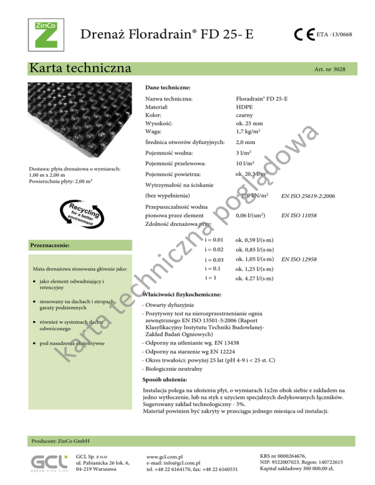 Drenaż Floradrain® FD 25- E ETA -13/0668 Karta techniczna Art. nr 3028 Dane techniczne: Średnica otworów dyfuzyjnych: 2,0 mm Pojemność wodna: 3 l/m2 Pojemność przelewowa: 10 l/m2 Pojemność powietrza: ok. 20,3 l/m2 do w a Floradrain® FD 25-E HDPE czarny ok. 25 mm 1,7 kg/m2 gl ą Dostawa: płyta drenażowa o wymiarach: 1,00 m x 2,00 m Powierzchnia płyty: 2,00 m² Nazwa techniczna: Materiał: Kolor: Wysokość: Waga: Wytrzymałość na ściskanie > 270 kN/m2 po (bez wypełnienia) EN ISO 25619-2:2006 Przepuszczalność wodna Przeznaczenie: • jako element odwadniający i retencyjny ch n Mata drenażowa stosowana głównie jako: te • stosowany na dachach i stropach garaży podziemnych icz na pionowa przez element Zdolność drenażowa przy: rta • również w systemach dachu odwróconego ka • pod nasadzenia ekstensywne 0,06 l/(sm2) i = 0.01 ok. 0,59 l/(s·m) i = 0.02 ok. 0,85 l/(s·m) i = 0.03 i = 0.1 ok. 1,05 l/(s·m) ok. 1,25 l/(s·m) i=1 ok. 4.27 l/(s·m) EN ISO 11058 EN ISO 12958 Właściwości fizykochemiczne: - Otwarty dyfuzyjnie - Pozytywny test na nierozprzestrzenianie ognia zewnętrznego EN ISO 13501-5:2006 (Raport Klasyfikacyjny Instytutu Techniki BudowlanejZakład Badań Ogniowych) - Odporny na utlenianie wg. EN 13438 - Odporny na starzenie wg EN 12224 - Okres trwałości: powyżej 25 lat (pH 4-9 i < 25 st. C) - Biologicznie neutralny Sposób ułożenia: Instalacja polega na ułożeniu płyt, o wymiarach 1x2m obok siebie z zakładem na jedno wytłoczenie, lub na styk z użyciem specjalnych dedykowanych łączników. Sugerowany zakład technologiczny - 5%. Materiał powinien być zakryty w przeciągu jednego miesiąca od instalacji. Producent: ZinCo GmbH GCL Sp. z o.o ul. Pabianicka 26 lok. 6, 04-219 Warszawa www.gcl.com.pl e-mail: [email protected] tel. +48 22 6164170, fax: +48 22 6160531 KRS nr 0000264676, NIP: 9522007023, Regon: 140722615 Kapitał zakładowy 300 000,00 zł,