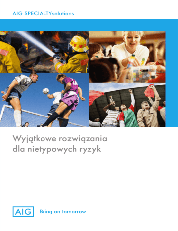 AIG SPECIALTYsolutions Wyjątkowe rozwiązania dla nietypowych ryzyk Bring on tomorrow SPECIALTYsolutions to program przeznaczony dla klientów z nietypowych lub złożonych grup ryzyka. W AIG zapewniamy zindywidualizowane ubezpieczenie wypadkowe dla uczestników, członków i klientów organizacji zaangażowanych w działania związane na co dzień z nietypowym lub wysokim ryzykiem. Dlaczego warto wybrać SPECIALTYsolutions Korzyści dla ubezpieczających: chroni klientów, uczestników i członków za pomocą elastycznego produktu zapewniającego dostosowane do indywidualnych wymagań rozwiązania w celu zaspokojenia określonych potrzeb w zakresie ochrony ubezpieczeniowej osób pozwala na wykazanie się dbałością o klientów i członków poprzez zapewnienie solidnego, zindywidualizowanego pakietu świadczeń kompensata zobowiązań ochrona marki poprzez zapewnienie klientom, uczestnikom i członkom najwyższego poziomu obsługi możliwość korzystania z naszej międzynarodowej sieci w trakcie współpracy z oddziałem lokalnym wyróżnienie się na rynku zapewnienie wysokiego poziomu obsługi dostosowanego do Państwa szczególnych potrzeb Korzyści dla klientów, członków i uczestników: łatwy dostęp do wiodącego rozwiązania ubezpieczeniowego dostosowanego do potrzeb możliwość skorzystania ze zindywidualizowanego planu ubezpieczeniowego stworzonego z myślą o potrzebach klienta spokój - jedna z najbardziej zaufanych firm ubezpieczeniowych chroni klientów w trakcie podejmowanych przez nich czynności pomaga uzupełnić luki w dotychczas posiadanym ubezpieczeniu zapewnienie wysokiego poziomu zindywidualizowanej obsługi, kiedy jest ona najbardziej potrzebna Najważniejsze informacje o SPECIALTYsolutions Kogo ubezpieczamy: uczestników widzów klientów wolontariuszy członków gości Co obejmuje oferowane przez nas ubezpieczenie: wydatki na pomoc medyczną w nagłych wypadkach ubezpieczenie w razie śmierci i uszkodzenia ciała wskutek nieszczęśliwego wypadku ubezpieczenie podróży ubezpieczenie na wypadek tymczasowego inwalidztwa świadczenie z tytułu ciężkiego wypadku świadczenie z tytułu hospitalizacji świadczenie z tytułu rekonwalescencji ubezpieczenie na wypadek złamania ubezpieczenie na wypadek poparzenia świadczenie rehabilitacyjne świadczenie na pomoc psychologiczną świadczenie na przebudowę domu/ pojazdu ubezpieczenie na wypadek utraty funkcji życiowych świadczenie dla partnera / dzieci na utrzymaniu ubezpieczenie transportu zwłok ubezpieczenie na wypadek wojny świadczenie w związku z kradzieżą ubezpieczenie na wypadek zniekształcenia twarzy inne zindywidualizowane świadczenia Kiedy obejmujemy ich ochroną podczas wykonywania określonej czynności w drodze do określonego miejsca i w drodze powrotnej 24 godziny na dobę Kto może skorzystać ze SPECIALTYsolutions? Stowarzyszenia Edukacja produkt dostępny dla stowarzyszeń zachęca do członkostwa, ponieważ sportowych, stowarzyszeń hobbistycznych, stowarzyszeń zawodowych i organizacji pozarządowych oferuje ubezpieczenie wypadkowe lub ubezpieczenie podróży dla członków, pracowników i wolontariuszy produkt dostępny dla żłobków, szkół, poza granicami kraju pomaga uzupełnić luki w szkolnym ubezpieczeniu od odpowiedzialności cywilnej daje pewność rodzicom, że ich dzieci będą objęte ochroną w razie wypadku pomaga wolontariuszom i organizacjom pokrewnym zachęcić innych do udziału w programach zagranicznych produkt dostępny dla organizatorów przez organizatora lub operatora kompensata zobowiązań zmniejsza obawy o możliwość wypadku w trakcie imprezy, umożliwiając wszystkim dobrą zabawę uniwersytetów oraz podróżujących/ pracujących studentów zapewnia ochronę ubezpieczeniową w szkole i w trakcie zajęć finansowanych lub nadzorowanych przez szkołę, w tym w trakcie imprez sportowych zapewnia grupom studentów ochronę przed nieprzewidzianym ryzykiem, na które narażeni są podróżujący Imprezy daje komfort posiadania dopasowanej do potrzeb ochrony ubezpieczeniowej, zapewniając większy spokój wzmacnia lojalność członków dzięki lepszym warunkom członkostwa imprez takich jak festiwale, targi, działalność producentów filmowych, maratony i imprezy na stadionach obejmuje ochroną ubezpieczeniową osoby podczas imprez finansowanych lub nadzorowanych Kto może skorzystać ze SPECIALTYsolutions? Sprzedawcy detaliczni produkt dostępny dla sprzedawców każdej sponsorowanej imprezy detalicznych, takich jak hotele, centra handlowe, supermarkety, parki rozrywki i ogrody zoologiczne zapewnia ochronę ubezpieczeniową dla zwiedzających/gości znajdujących się na terenie obiektu sprzedawcy detalicznego i w trakcie zapewnia ochronę marki poprzez Organizacje wysokiego ryzyka produkt dostępny dla organizacji, organizacji uzupełnia luki w istniejącej ochronie ubezpieczeniowej jej członków obejmuje ochroną członków organizacji w trakcie podejmowanych przez nich czynności lub w ciągu 24 godzin Gminy produkt dostępny dla organizacji policji, wojska, straży pożarnej i firm ochroniarskich daje pewność, że w razie wypadku zostaną zaspokojone potrzeby finansowe i medyczne w związku z niebezpiecznym charakterem pracy w takiej rządowych, imprez lokalnych sponsorowanych przez gminy, lokalnych basenów, środków zindywidualizowany program ubezpieczeniowy i pomaga sprzedawcom detalicznym w zdobywaniu klientów kompensata zobowiązań transportu publicznego kompensata zobowiązań wsparcie w uregulowaniu prawnych zobowiązań ubezpieczeniowych American International Group, Inc. (AIG) jest jednym z liderów na światowym rynku ubezpieczeniowym. Obsługuje klientów w ponad 130 krajach. Spółki z grupy AIG świadczą usługi dla klientów korporacyjnych, instytucjonalnych i indywidualnych poprzez jedną z największych na świecie sieci działających w obszarze ubezpieczeń majątkowych i osobowych. Ponadto spółki z grupy AIG są jednymi z