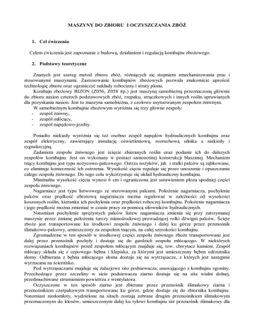 MASZYNY DO ZBIORU I OCZYSZCZANIA ZBÓŻ 1. Cel ćwiczenia Celem ćwiczenia jest zapoznanie z budową, działaniem i regulacją kombajnu zbożowego. 2. Podstawy teoretyczne Znanych jest szereg metod zbioru zbóż, różniących się stopniem zmechanizowania prac i stosowanymi maszynami. Zastosowanie kombajnów zbożowych pozwala znakomicie uprościć technologię zbioru oraz ograniczyć nakłady robocizny i straty plonu. Kombajn zbożowy BIZON (Z056, Z058 itp.) jest maszyną samobieżną przeznaczoną głównie do zbioru nasion czterech podstawowych zbóż, rzepaku, strączkowych i innych roślin uprawianych dla pozyskania nasion. Jest to maszyna samobieżna, z czołowo usytuowanym zespołem żniwnym. W samobieżnym kombajnie zbożowym wyróżnia się trzy główne zespoły: - zespół żniwny, - zespół młócący, - zespół napędowo-jezdny. Ponadto niekiedy wyróżnia się też osobno zespół napędów hydraulicznych kombajnu oraz zespół elektryczny, zawierający instalację oświetleniową, rozruchową silnika a niekiedy i sygnalizcyjną. Zadaniem zespołu żniwnego jest ścięcie zbieranych roślin oraz podanie ich do dalszych zespołów kombajnu. Jest on wykonany w postaci samonośnej konstrukcji blaszanej. Mechanizm tnący kombajnu jest typu nożycowo-palcowego. Ostrza nożyków, jak i stalki palców są ząbkowane, co eliminuje konieczność ich ostrzenia. Wysokość cięcia reguluje się przez unoszenie i opuszczanie całego zespołu żniwnego. Do tego celu wykorzystuje się układ hydrauliczny kombajnu. Minimalna wysokość cięcia wynosi 6 cm i ograniczona jest ustawieniem płoza spodniej części zespołu żniwnego. Nagarniacz jest typu listwowego ze sterowanymi palcami. Położenie nagarniacza, pochylenie palców oraz prędkość obrotową nagarniacza można regulować w zależności od wysokości koszonych roślin, kierunku ich pochylenia oraz prędkości roboczej kombajnu. Położenie nagarniacza i jego prędkość można zmieniać w czasie pracy za pomocą siłowników hydraulicznych. Natomiast pochylenie sprężystych palców listew nagarniacza zmienia się przy zatrzymanej maszynie przez zmianę położenia tarczy mimośrodowej prowadzącej rolki dźwigni palców. Ścięte zboże jest transportowane ku środkowi zespołu żniwnego i dalej ku górze przez przenośnik ślimakowo-palcowy, umieszczony za zespołem tnącym, na całej szerokości kombajnu. Zgromadzone w ten sposób w środkowej części zespołu żniwnego zboże transportowane jest dalej przez przenośnik pochyły i dostaje się do gardzieli zespołu młócącego. W niektórych rozwiązaniach kombajnów przed zespołem młócącym znajduje się, tzw. chwytacz kamieni. Zespół młócący składa się z cepowego bębna i klepiska, za którymi jest umieszczony bęben odrzutnika słomy. Odbierana z bębna młócącego słoma dostaje się na wytrząsacze, z których jest następnie wyrzucana na ściernisko. Pod wytrząsaczami znajduje się żaluzjowe sito podsiewacza, usuwającego z kombajnu zgoniny. Przechodzące przez szczeliny w sicie podsiewacza ziarno dostaje się na sita wialni dolnej, przedmuchiwane strumieniem powietrza z wentylatora. Oczyszczone w ten sposób ziarno jest zbierane przez przenośnik ślimakowy ziarna i przenośnikiem czerpakowym transportowane ku górze, gdzie dostaje się do zbiornika kombajnu. Natomiast niedomłoty, wydzielone na sitach zostają zebrane drugim przenośnikiem ślimakowym przeznaczonym do kłosów, umieszczonym dalej ku tyłowi kombajnu niż przenośnik ślimakowy dla ziarna. Niedomłócone kłosy są następnie transportowane drugim przenośnikiem czerpakowym ku górze, gdzie trafiają do ponownego omłotu w zespole młócącym lub też są podawane tylko na wytrząsacze. Ziarno zbierane w zbiorniku kombajnu jest okresowo wyładowywane przez ślimak rozładowczy, na pod-jeżdżające przyczepy lub samochody. Rys. 1. Schemat kombajnu zbożowego „Bizon”: 1 - nagarniacz, 2 - zespół tnący, 3 - podajnik ślimakowo-palcowy, 4 - przenośnik pochyły, 5 - bęben młócący, 6 - klepisko, 7 podsiewacz, 8 - odrzutnik słomy, 9 - wytrząsacz, 10 - wał napędu podsiewacza, 11 górne sito, 12 - dolne sito, 13 - wentylator, 14 - sito kłosowe, 15 - ślimak kłosowy, 16 ślimak ziarnowy, 17 - przenośnik czerpakowy ziarna, 18 - zbiornik ziarna, 19 - ślimak wyładowczy zbiornika ziarna, 20 - przenośnik czerpakowy kłosów, 21 - siłownik wydźwigu zespołu żniwnego, 22 - siłownik wydźwigu nagarniacza, 23 - silnik napędowy kombajnu, 24 - skrzynia przekładniowa z mechanizmem różnicowym, 25 - przedni most jezdny, 26 - tylne koła sterowane, 27 - pomost kierowcy 3. Schemat i opis stanowiska laboratoryjnego Stanowisko laboratoryjne stanowi kombajn zbożowy „Bizon - Z056”. 4. Przebieg ćwiczenia W trakcie realizacji ćwiczenia laboratoryjnego należy: 1) Zapoznać się z budową i obsługą poszczególnych zespołów kombajnu zbożowego, 2) Zapoznać się z rozmieszczeniem i przeznaczeniem dźwigni sterowania i regulacji pracy kombajnu, 3) Zapoznać się z budową i działaniem układu napędowego kombajnu, 4) Zapoznać się z budową i działaniem układu hydraulicznego kombajnu. 5. Literatura [1] Gach S., Kuczewski J., Waszkiewicz Cz.: Maszyny rolnicze. Elementy teorii i obliczeń. Wyd. SGGW. Warszawa 1991 [2] Kuczewski J.: Budowa i regulacja maszyn rolniczych. PWN. Warszawa – Poznań 1978