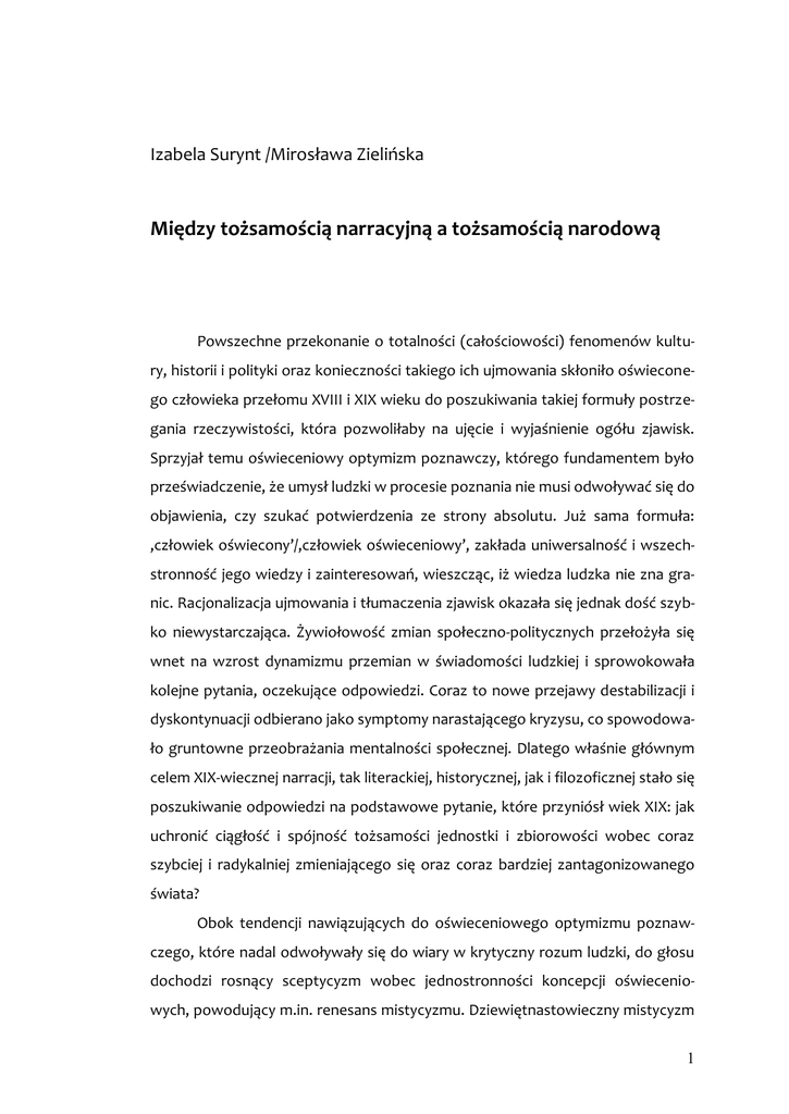 Izabela Surynt /Mirosława Zielińska Między tożsamością narracyjną a tożsamością narodową Powszechne przekonanie o totalności (całościowości) fenomenów kultury, historii i polityki oraz konieczności takiego ich ujmowania skłoniło oświeconego człowieka przełomu XVIII i XIX wieku do poszukiwania takiej formuły postrzegania rzeczywistości, która pozwoliłaby na ujęcie i wyjaśnienie ogółu zjawisk. Sprzyjał temu oświeceniowy optymizm poznawczy, którego fundamentem było przeświadczenie, że umysł ludzki w procesie poznania nie musi odwoływać się do objawienia, czy szukać potwierdzenia ze strony absolutu. Już sama formuła: ‚człowiek oświecony’/‚człowiek oświeceniowy’, zakłada uniwersalność i wszechstronność jego wiedzy i zainteresowań, wieszcząc, iż wiedza ludzka nie zna granic. Racjonalizacja ujmowania i tłumaczenia zjawisk okazała się jednak dość szybko niewystarczająca. Żywiołowość zmian społeczno-politycznych przełożyła się wnet na wzrost dynamizmu przemian w świadomości ludzkiej i sprowokowała kolejne pytania, oczekujące odpowiedzi. Coraz to nowe przejawy destabilizacji i dyskontynuacji odbierano jako symptomy narastającego kryzysu, co spowodowało gruntowne przeobrażania mentalności społecznej. Dlatego właśnie głównym celem XIX-wiecznej narracji, tak literackiej, historycznej, jak i filozoficznej stało się poszukiwanie odpowiedzi na podstawowe pytanie, które przyniósł wiek XIX: jak uchronić ciągłość i spójność tożsamości jednostki i zbiorowości wobec coraz szybciej i radykalniej zmieniającego się oraz coraz bardziej zantagonizowanego świata? Obok tendencji nawiązujących do oświeceniowego optymizmu poznawczego, które nadal odwoływały się do wiary w krytyczny rozum ludzki, do głosu dochodzi rosnący sceptycyzm wobec jednostronności koncepcji oświeceniowych, powodujący m.in. renesans mistycyzmu. Dziewiętnastowieczny mistycyzm 1 można odczytać jako potwierdzenie indywidualizmu, zakładającego dostępność jednostkowego poznania, oraz negację wszelkich instancji uzurpujących sobie prawo do pośrednictwa w kontaktach między człowiekiem a absolutem. Natomiast coraz bardziej powszechny brak wiary w możliwości poznawcze, który na przełomie wieku XIX i XX przyjął bardzo radykalną postać, stał się jednoznaczny z akceptacją przekonania, iż zarówno dotychczasowe wartości, jak i sposób rozumienia świata oraz człowieka utraciły swoje znaczenie, a także moc obowiązującą. „Długi wiek XIX” zakończył się ich radykalnym przewartościowaniem1. Stopniowe pojawianie się nowych dyscyplin naukowych, ich rozwój i rosnąca emancypacja, jak również postępująca profesjonalizacja pozwoliły na wypracowywanie coraz bardziej wyspecjalizowanego instrumentarium badawczego, stworzenie nowej siatki pojęć oraz teorii, aspirujących do przyznania im prymatu poznawczego nad innymi dyscyplinami, scalając całą wcześniej dostępną wiedzę w nową całość, czy też odwołując się do jej wybranych aspektów. Efektem tego procesu ‚unaukowienia’ dyskursów było ukonstytuowanie się dyscyplin silnie od siebie oddalonych – skoncentrowanych na dyskursie wewnętrznym –, gdyż odgraniczonych metodologicznie i merytorycznie. Ta konkurencja poszczególnych dziedzin wiedzy, przekonanych o swoim monopolu poznawczym, a odnoszących się faktycznie jedynie do poszczególnych problemów i wycinków rzeczywistości, postawiły literaturę, a szerzej - kulturę, w zupełnie nowej sytuacji. Literatura intensywnie poszukiwała nowych środków wyrazu i miejsca dla siebie wśród innych, zyskujących coraz bardziej na znaczeniu i odwołujących się do naukowości, modeli myślenia o człowieku i świecie. Starała się ona określić specyficzną relację wobec świata i ludzi, mających stać się jej świadomymi odbiorcami. Literatura rozwinęła zatem własny język kodyfikowania zjawisk i nie zrezygnowała ze współuczestniczenia i współtworzenia dyskursu dotyczącego tożsamości człowieka XIX wieku – tożsamości indywidualnej i grupowej. 1 Por. Jürgen Kocka: Das lange 19. Jahrhundert. Arbeit, Nation und bürgerliche Gesellschaft. (Gebhardt. Handbuch der deutschen Geschichte , t.13). Stuttgart 2001. 2 I. Nowoczesne projekty narodowe w Europie – procesy modernizacyjne a nacjonalizm Publiczny dyskurs o ‚narodzie’, prowadzony z rosnącym natężeniem od końca XVIII w., po wkroczeniu w wiek XIX uległ gwałtownemu przyspieszeniu. Po pierwsze monarchie absolutne dążyły coraz wyraźniej ku modelowi monarchii narodowych, poddając transformacji punkty odniesienia, nieodzowne dla procesów kształtowania się tożsamości. Wzorzec oparty na relacji ‚poddany’ – ‚panujący (z boskiego nadania)’ przekształcił się stopniowo we wzorzec ‚członek narodu’ – ‚stojący na jego czele przywódca narodu’. Po drugie zespolił się on z jakościowymi i ilościowymi zmianami sposobu społecznej komunikacji, gdyż wymiana informacji zaczęła obejmować coraz szersze spektrum społeczeństw. I to właśnie literatura jako medium komunikacji – w szerokim tego słowa znaczeniu – okazała się wręcz predysponowana do funkcjonowania jako przestrzeń pozwalająca na eksperymentowanie z różnorodnymi koncepcjami ‚narodu’, kreowaniem nowych i w swym zamierzeniu lepszych światów, starając się jednocześnie możliwie przekonywająco wyjaśniać otaczającą rzeczywistość. To literatura najbardziej efektywnie wykorzystała swe możliwości do komunikowania się przy pomocy symboli, do kreowania, przekazywania, utrwalania i przenoszenia myśli, obrazów oraz wyobrażeń w całej skali emocji2. Powoli przenikały one wraz z wrastającą rangą kultury dla procesów narodowotwórczych (nation building3) do innych sfer 2 Etienne François / Hagen Schulze: Das emotionale Fundament der Nationen. [W:] Mythen der Nationen. Ein europäisches Panorama, 