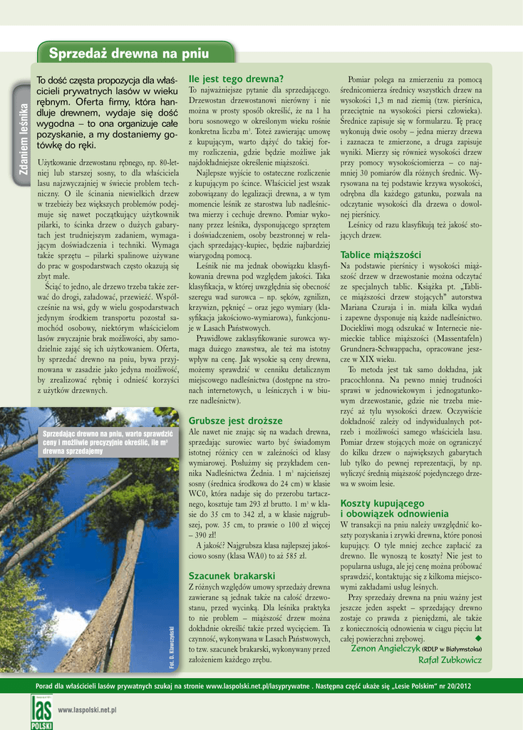 To doÊç cz´sta propozycja dla w∏aÊcicieli prywatnych lasów w wieku r´bnym. Oferta firmy, która handluje drewnem, wydaje si´ doÊç wygodna – to ona organizuje ca∏e pozyskanie, a my dostaniemy gotówk´ do r´ki. U˝ytkowanie drzewostanu r´bnego, np. 80-letniej lub starszej sosny, to dla w∏aÊciciela lasu najzwyczajniej w Êwiecie problem techniczny. O ile Êcinania niewielkich drzew w trzebie˝y bez wi´kszych problemów podejmuje si´ nawet poczàtkujàcy u˝ytkownik pilarki, to Êcinka drzew o du˝ych gabarytach jest trudniejszym zadaniem, wymagajàcym doÊwiadczenia i techniki. Wymaga tak˝e sprz´tu – pilarki spalinowe u˝ywane do prac w gospodarstwach cz´sto okazujà si´ zbyt ma∏e. Âciàç to jedno, ale drzewo trzeba tak˝e zerwaç do drogi, za∏adowaç, przewieêç. Wspó∏czeÊnie na wsi, gdy w wielu gospodarstwach jedynym Êrodkiem transportu pozosta∏ samochód osobowy, niektórym w∏aÊcicielom lasów zwyczajnie brak mo˝liwoÊci, aby samodzielnie zajàç si´ ich u˝ytkowaniem. Oferta, by sprzedaç drewno na pniu, bywa przyjmowana w zasadzie jako jedyna mo˝liwoÊç, by zrealizowaç r´bni´ i odnieÊç korzyÊci z u˝ytków drzewnych. Ile jest tego drewna? To najwa˝niejsze pytanie dla sprzedajàcego. Drzewostan drzewostanowi nierówny i nie mo˝na w prosty sposób okreÊliç, ˝e na 1 ha boru sosnowego w okreÊlonym wieku roÊnie konkretna liczba m3. Tote˝ zawierajàc umow´ z kupujàcym, warto dà˝yç do takiej formy rozliczenia, gdzie b´dzie mo˝liwe jak najdok∏adniejsze okreÊlenie mià˝szoÊci. Najlepsze wyjÊcie to ostateczne rozliczenie z kupujàcym po Êcince. W∏aÊciciel jest wszak zobowiàzany do legalizacji drewna, a w tym momencie leÊnik ze starostwa lub nadleÊnictwa mierzy i cechuje drewno. Pomiar wykonany przez leÊnika, dysponujàcego sprz´tem i doÊwiadczeniem, osoby bezstronnej w relacjach sprzedajàcy-kupiec, b´dzie najbardziej wiarygodnà pomocà. LeÊnik nie ma jednak obowiàzku klasyfikowania drewna pod wzgl´dem jakoÊci. Taka klasyfikacja, w której uwzgl´dnia si´ obecnoÊç szeregu wad surowca – np. s´ków, zgnilizn, krzywizn, p´kni´ç – oraz jego wymiary (klasyfikacja jakoÊciowo-wymiarowa), funkcjonuje w Lasach Paƒstwowych. Prawid∏owe zaklasyfikowanie surowca wymaga du˝ego znawstwa, ale te˝ ma istotny wp∏yw na cen´. Jak wysokie sà ceny drewna, mo˝emy sprawdziç w cenniku detalicznym miejscowego nadleÊnictwa (dost´pne na stronach internetowych, u leÊniczych i w biurze nadleÊnictw). Grubsze jest dro˝sze Sprzedajàc drewno na pniu, warto sprawdziç ceny i mo˝liwie precyzyjnie okreÊliç, ile m3 drewna sprzedajemy Ale nawet nie znajàc si´ na wadach drewna, sprzedajàc surowiec warto byç Êwiadomym istotnej ró˝nicy cen w zale˝noÊci od klasy wymiarowej. Pos∏u˝my si´ przyk∏adem cennika NadleÊnictwa ˚ednia. 1 m3 najcieƒszej sosny (Êrednica Êrodkowa do 24 cm) w klasie WC0, która nadaje si´ do przerobu tartacznego, kosztuje tam 293 z∏ brutto. 1 m3 w klasie do 35 cm to 342 z∏, a w klasie najgrubszej, pow. 35 cm, to prawie o 100 z∏ wi´cej – 390 z∏! A jakoÊç? Najgrubsza klasa najlepszej jakoÊciowo sosny (klasa WA0) to a˝ 585 z∏. Szacunek brakarski Fot. D. Klawczyƒski Zdaniem leÊnika Sprzeda˝ drewna na pniu Z ró˝nych wzgl´dów umowy sprzeda˝y drewna zawierane sà jednak tak˝e na ca∏oÊç drzewostanu, przed wycinkà. Dla leÊnika praktyka to nie problem – mià˝szoÊç drzew mo˝na dok∏adnie okreÊliç tak˝e przed wyci´ciem. Ta czynnoÊç, wykonywana w Lasach Paƒstwowych, to tzw. szacunek brakarski, wykonywany przed za∏o˝eniem ka˝dego zr´bu. Pomiar polega na zmierzeniu za pomocà Êrednicomierza Êrednicy wszystkich drzew na wysokoÊci 1,3 m nad ziemià (tzw. pierÊnica, przeci´tnie na wysokoÊci piersi cz∏owieka). Ârednice zapisuje si´ w formularzu. T´ prac´ wykonujà dwie osoby – jedna mierzy drzewa i zaznacza te zmierzone, a druga zapisuje wyniki. Mierzy si´ równie˝ wysokoÊci drzew przy pomocy wysokoÊciomierza – co najmniej 30 pomiarów dla ró˝nych Êrednic. Wyrysowana na tej podstawie krzywa wysokoÊci, odr´bna dla ka˝dego gatunku, pozwala na odczytanie wysokoÊci dla drzewa o dowolnej pierÊnicy. LeÊnicy od razu klasyfikujà te˝ jakoÊç stojàcych drzew. Tablice mià˝szoÊci Na podstawie pierÊnicy i wysokoÊci mià˝szoÊç drzew w drzewostanie mo˝na odczytaç ze specjalnych tablic. Ksià˝ka pt. „Tablice mià˝szoÊci drzew stojàcych” autorstwa Mariana Czuraja i in. mia∏a kilka wydaƒ i zapewne dysponuje nià ka˝de nadleÊnictwo. Dociekliwi mogà odszukaç w Internecie niemieckie tablice mià˝szoÊci (Massentafeln) Grundnera-Schwappacha, opracowane jeszcze w XIX wieku. To metoda jest tak samo dok∏adna, jak pracoch∏onna. Na pewno mniej trudnoÊci sprawi w jednowiekowym i jednogatunkowym drzewostanie, gdzie nie trzeba mierzyç a˝ tylu wysokoÊci drzew. OczywiÊcie dok∏adnoÊç zale˝y od indywidualnych potrzeb i mo˝liwoÊci samego w∏aÊciciela lasu. Pomiar drzew stojàcych mo˝e on ograniczyç do kilku drzew o najwi´kszych gabarytach lub tylko do pewnej reprezentacji, by np. wyliczyç Êrednià mià˝szoÊç pojedynczego drzewa w swoim lesie. Koszty kupujàcego i obowiàzek odnowienia W transakcji na pniu nale˝y uwzgl´dniç koszty pozyskania i zrywki drewna, które ponosi kupujàcy. O tyle mniej zechce zap∏aciç za drewno. Ile wynoszà te koszty? Nie jest to popularna us∏uga, ale jej cen´ mo˝na próbowaç sprawdziç, kontaktujàc si´ z kilkoma miejscowymi zak∏adami us∏ug leÊnych. Przy sprzeda˝y drewna na pniu wa˝ny jest jeszcze jeden aspekt – sprzedajàcy drewno zostaje co prawda z pieni´dzmi, ale tak˝e z koniecznoÊcià odnowienia w ciàgu pi´ciu lat ca∏ej powierzchni zr´bowej. u Zenon Angielczyk (RDLP w Bia∏ymstoku) Rafa∏ Zubkowicz Porad dla w∏aÊcicieli lasów prywatnych szukaj na stronie www.laspolski.net.pl/lasyprywatne . Nast´pna cz´Êç uka˝e si´ „Lesi