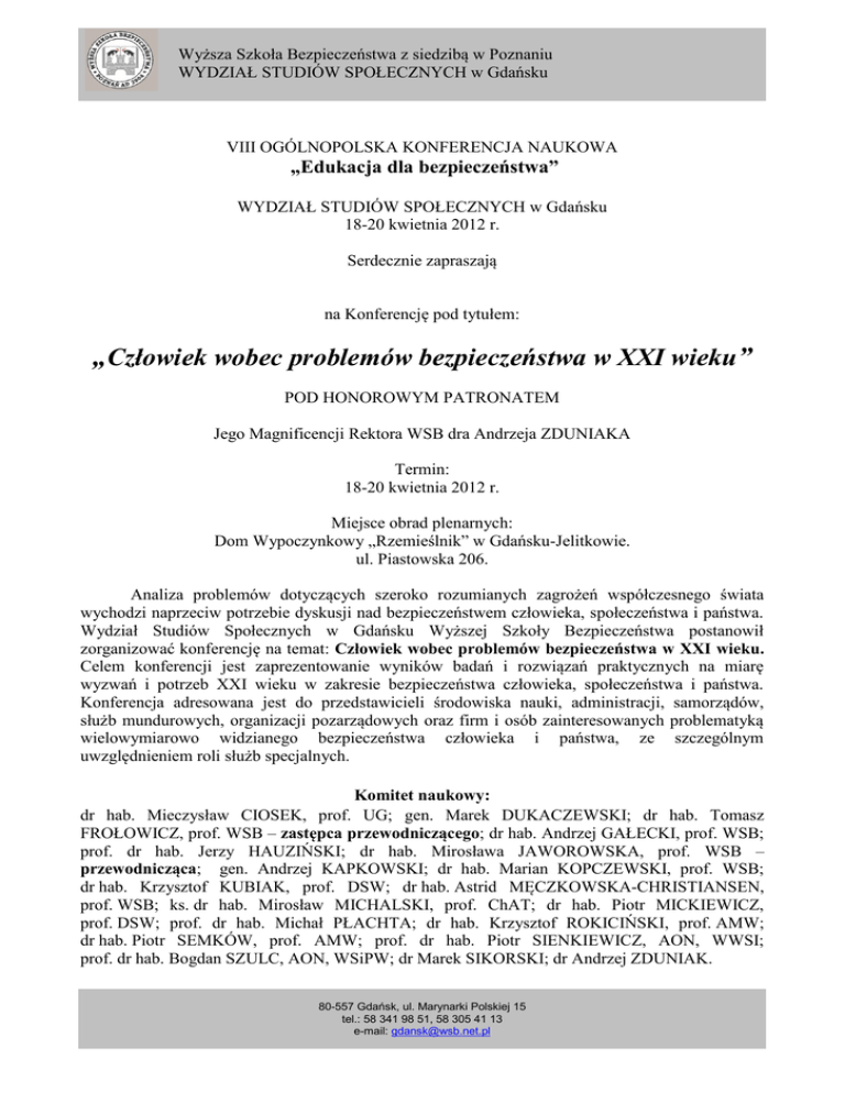 Wyższa Szkoła Bezpieczeństwa z siedzibą w Poznaniu WYDZIAŁ STUDIÓW SPOŁECZNYCH w Gdańsku VIII OGÓLNOPOLSKA KONFERENCJA NAUKOWA „Edukacja dla bezpieczeństwa” WYDZIAŁ STUDIÓW SPOŁECZNYCH w Gdańsku 18-20 kwietnia 2012 r. Serdecznie zapraszają na Konferencję pod tytułem: „Człowiek wobec problemów bezpieczeństwa w XXI wieku” POD HONOROWYM PATRONATEM Jego Magnificencji Rektora WSB dra Andrzeja ZDUNIAKA Termin: 18-20 kwietnia 2012 r. Miejsce obrad plenarnych: Dom Wypoczynkowy „Rzemieślnik” w Gdańsku-Jelitkowie. ul. Piastowska 206. Analiza problemów dotyczących szeroko rozumianych zagrożeń współczesnego świata wychodzi naprzeciw potrzebie dyskusji nad bezpieczeństwem człowieka, społeczeństwa i państwa. Wydział Studiów Społecznych w Gdańsku Wyższej Szkoły Bezpieczeństwa postanowił zorganizować konferencję na temat: Człowiek wobec problemów bezpieczeństwa w XXI wieku. Celem konferencji jest zaprezentowanie wyników badań i rozwiązań praktycznych na miarę wyzwań i potrzeb XXI wieku w zakresie bezpieczeństwa człowieka, społeczeństwa i państwa. Konferencja adresowana jest do przedstawicieli środowiska nauki, administracji, samorządów, służb mundurowych, organizacji pozarządowych oraz firm i osób zainteresowanych problematyką wielowymiarowo widzianego bezpieczeństwa człowieka i państwa, ze szczególnym uwzględnieniem roli służb specjalnych. Komitet naukowy: dr hab. Mieczysław CIOSEK, prof. UG; gen. Marek DUKACZEWSKI; dr hab. Tomasz FROŁOWICZ, prof. WSB – zastępca przewodniczącego; dr hab. Andrzej GAŁECKI, prof. WSB; prof. dr hab. Jerzy HAUZIŃSKI; dr hab. Mirosława JAWOROWSKA, prof. WSB – przewodnicząca; gen. Andrzej KAPKOWSKI; dr hab. Marian KOPCZEWSKI, prof. WSB; dr hab. Krzysztof KUBIAK, prof. DSW; dr hab. Astrid MĘCZKOWSKA-CHRISTIANSEN, prof. WSB; ks. dr hab. Mirosław MICHALSKI, prof. ChAT; dr hab. Piotr MICKIEWICZ, prof. DSW; prof. dr hab. Michał PŁACHTA; dr hab. Krzysztof ROKICIŃSKI, prof. AMW; dr hab. Piotr SEMKÓW, prof. AMW; prof. dr hab. Piotr SIENKIEWICZ, AON, WWSI; prof. dr hab. Bogdan SZULC, AON, WSiPW; dr Marek SIKORSKI; dr Andrzej ZDUNIAK. 80-557 Gdańsk, ul. Marynarki Polskiej 15 tel.: 58 341 98 51, 58 305 41 13 e-mail: [email protected] Wyższa Szkoła Bezpieczeństwa z siedzibą w Poznaniu WYDZIAŁ STUDIÓW SPOŁECZNYCH w Gdańsku Komitet organizacyjny: mgr Magdalena BŁAJET; mgr Marta DZIEDZIC – sekretarz konferencji; dr Magdalena GIERS; dr Marek ILNICKI – zastępca przewodniczącego; dr Andrzej PIOTROWSKI – przewodniczący; dr Marek SIKORSKI; mgr Małgorzata SUCHTA; mgr Ilona ZIEMKIEWICZ-GAWLIK Szczegółowa problematyka konferencji: Problematyka panelu: Wyzwania dla nauk społecznych wynikające z zagrożeń współczesnego świata 1. Perspektywa antropologiczna w edukacji dla bezpieczeństwa. 2. Zadania oświaty w realizacji przedmiotu edukacja dla bezpieczeństwa. 3. Globalizacja jako proces generujący zagrożenia dla bezpieczeństwa człowieka. 4. Bezpieczeństwo człowieka w procesie wykorzystania energii atomowej. 5. Nauki o bezpieczeństwie wobec zagrożeń w komunikacji. 6. Strategia bezpieczeństwa państwa na tle współczesnych zagrożeń. 7. Bezpieczeństwo socjalne w kontekście przyrostu liczby ludności na świecie. 8. Aksjologiczne aspekty zachowania bezpieczeństwa społecznego. 9. Zarządzanie bezpieczeństwem w szkole i zakładzie pracy. 10. Funkcjonowanie i współdziałanie służb porządkowych i ratowniczych w zapewnieniu bezpieczeństwa wewnętrznego państwa. 11. Ochrona praw człowieka nieodłącznym wyzwaniem nauk o bezpieczeństwie. 12. Politologiczna prognoza dla ekonomiczno-gospodarczego bezpieczeństwa Europy. 13. Edukacja antyterrorystyczna społeczeństwa. 14. Zarządzanie kryzysowe w aspekcie imprez masowych (Euro 2012). 15. Przeciwdziałania zagrożeniom teleinformatycznym. Problematyka panelu: Służby specjalne w systemie bezpieczeństwa państwa 1. Służby specjalne w ochronie porządku konstytucyjnego państwa. 2. Rekrutacja, przygotowanie i doskonalenie kompetencji pracowników służb specjalnych. 3. Udział służb specjalnych w systemie bezpieczeństwa wewnętrznego i zewnętrznego państwa. 4. Służby specjalne w walce z terroryzmem. 5. Współpraca służb specjalnych ze służbami ochrony porządku publicznego. 6. Regulacje prawne dotyczące czynności operacyjno-rozpoznawczych. 7. System ochrony informacji niejawnych w Polsce. 8. Odmienności zainteresowań operacyjnych służb specjalnych na tle przemian historycznych w Polsce. 9. Udział Polski w międzynarodowej koalicji antyterrorystycznej. Serdecznie zapraszamy Dziekan Wydziału Studiów Społecznych w Gdańsku oraz Komitet Organizacyjny Zwracamy się z prośbą o zachęcenie Współpracowników do wzięcia udziału w Konferencji. 80-557 Gdańsk, ul. Marynarki Polskiej 15 tel.: 58 341 98 51, 58 305 41 13 e-mail: [email protected]
