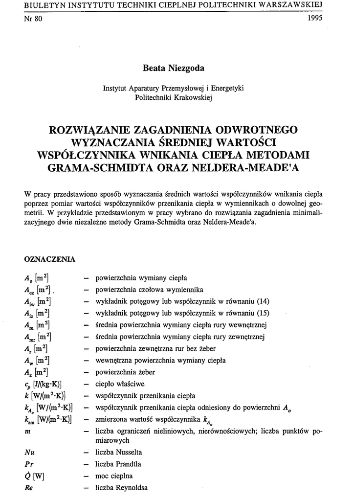 poprzez pomiar wartości współczynników przenikania ciepła w wymiennikach o dowolnej geometrii. W przykładzie przedstawionym w pracy wybrano do rozwiązania zagadnienia minimalizacyjnego dwie niezależne metody Grama-Schmidta oraz Neldera-Meade'a.
