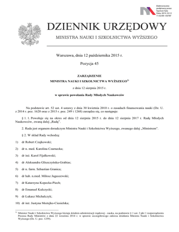 Elektronicznie podpisany przez Szymon Sala Data: 2015.10.12 11:52:00 +02'00' Warszawa, dnia 12 października 2015 r. Pozycja 45 ZARZĄDZENIE MINISTRA NAUKI I SZKOLNICTWA WYŻSZEGO1) z dnia 12 sierpnia 2015 r. w sprawie powołania Rady Młodych Naukowców Na podstawie art. 52 ust. 4 ustawy z dnia 30 kwietnia 2010 r. o zasadach finansowania nauki (Dz. U. z 2014 r. poz. 1620 oraz z 2015 r. poz. 249 i 1268) zarządza się, co następuje: § 1. 1. Powołuje się na okres od dnia 12 sierpnia 2015 r. do dnia 12 sierpnia 2017 r. Radę Młodych Naukowców, zwaną dalej „Radą”. 2. Rada jest organem doradczym Ministra Nauki i Szkolnictwa Wyższego, zwanego dalej „Ministrem”. § 2. W skład Rady wchodzą: 1) dr Robert Czajkowski; 2) dr n. med. Karolina Czarnecka; 3) dr inż. Karol Fijałkowski; 4) dr Aleksandra Gliszczyńska-Grabias; 5) dr n. farm. Sebastian Granica; 6) dr hab. n.med. Miłosz Jaguszewski; 7) dr Katarzyna Kopecka-Piech; 8) dr Emanuel Kulczycki; 9) dr Łukasz Michalczyk; 10) dr inż. Justyna Możejko-Ciesielska; 1) Minister Nauki i Szkolnictwa Wyższego kieruje działem administracji rządowej – nauka, na podstawie § 1 ust. 2 pkt 1 rozporządzenia Prezesa Rady Ministrów z dnia 22 września 2014 r. w sprawie szczegółowego zakresu działania Ministra Nauki i Szkolnictwa Wyższego (Dz. U. poz. 1259). Dziennik Urzędowy Ministra Nauki i Szkolnictwa Wyższego –2– Poz. 45 11) dr inż. Michał Niezabitowski; 12) dr inż. Mariusz Pawlak; 13) dr Adam Płoszaj; 14) mgr Przemysław Rumianek; 15) dr Daniel Strub; 16) dr Adam Szot; 17) dr inż. Bożena Tyliszczak; 18) dr inż. Paweł Wójcik. § 3. 1. Zadaniem Rady jest wspieranie Ministra w działaniach służących rozwojowi kariery młodych naukowców i osób rozpoczynających karierę naukową, w szczególności przez: 1) identyfikowanie istniejących i potencjalnych barier rozwoju kariery młodych naukowców i osób rozpoczynających karierę naukową; 2) przygotowywanie rekomendacji dotyczących instrumentów wspomagania kariery młodych naukowców i osób rozpoczynających karierę naukową; 3) zapoznawanie młodych naukowców i osób rozpoczynających karierę naukową z mechanizmami finansowania nauki; 4) wspieranie kontaktów młodych naukowców i osób rozpoczynających karierę naukową z przedstawicielami środowisk gospodarczych oraz instytucji wdrażających innowacyjne rozwiązania w nauce; 5) upowszechnianie w środowisku młodych naukowców i osób rozpoczynających karierę naukową postanowień Europejskiej Karty Naukowca oraz Kodeksu postępowania przy rekrutacji pracowników naukowych w jednostkach naukowych. 2. Rada podejmuje działania, o których mowa w ust. 1, na polecenie Ministra lub z własnej inicjatywy. 3. Rada może występować do innych organów lub instytucji o zajęcie stanowiska w sprawach należących do zakresu jej działania. § 4. 1. Rada działa na posiedzeniach zwoływanych nie rzadziej niż raz na dwa miesiące. 2. Rada może podejmować rozstrzygnięcia także w drodze korespondencyjnego uzgodnienia stanowisk. § 5. 1. Na pierwszym posiedzeniu członkowie Rady wybierają ze swojego grona Przewodniczącego oraz dwóch Wiceprzewodniczących Rady, w głosowaniu jawnym, bezwzględną większością głosów. 2. Przewodniczący Rady: 1) zwołuje posiedzenia Rady oraz przewodniczy tym posiedzeniom; 2) może zapraszać osoby niebędące członkami Rady do udziału w jej posiedzeniach z głosem doradczym; 3) wyznacza Wiceprzewodniczącego Rady upoważnionego do zastępowania go w przypadku jego nieobecności na posiedzeniu Rady; 4) decyduje o rozpatrzeniu sprawy w trybie korespondencyjnego uzgodnienia stanowisk; Dziennik Urzędowy Ministra Nauki i Szkolnictwa Wyższego –3– Poz. 45 5) może wyznaczać zadania dla poszczególnych członków Rady oraz powoływać spośród członków Rady zespoły robocze do realizacji wyznaczonych zadań; 6) przedstawia Ministrowi na koniec kadencji sprawozdanie z działalności Rady; 7) wnioskuje do Ministra o zlecenie opracowania analiz, opinii lub ekspertyz na potrzeby Rady. § 6. Rada podejmuje rozstrzygnięcia zwykłą większością głosów oddanych przez co najmniej połowę członków Rady. W przypadku równej liczby głosów rozstrzyga głos Przewodniczącego Rady lub Wiceprzewodniczącego Rady wyznaczonego zgodnie z § 5 ust. 2 pkt 3. § 7. 1. Z posiedzenia Rady oraz z rozpatrzenia sprawy w trybie korespondencyjnego uzgodnienia stanowisk sporządza się protokół, który zatwierdza Przewodniczący Rady albo Wiceprzewodniczący Rady wyznaczony zgodnie z § 5 ust. 2 pkt 3. 2. Opinie, oceny i rekomendacje Rady stanowią załączniki do protokołów, które są zamieszczane na stronie internetowej Ministerstwa Nauki i Szkolnictwa Wyższego. § 8. Obsługę prac Rady zapewnia Biuro Ministra. § 9. Zarządzenie wchodzi w życie z dniem podpisania. Minister Nauki i Szkolnictwa Wyższego: wz. M.K Ratajczak