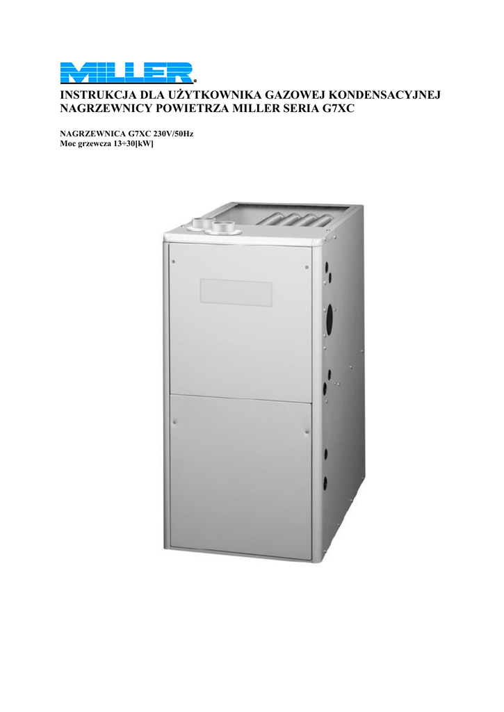 INSTRUKCJA DLA UŻYTKOWNIKA GAZOWEJ KONDENSACYJNEJ NAGRZEWNICY POWIETRZA MILLER SERIA G7XC NAGRZEWNICA G7XC 230V/50Hz Moc grzewcza 13÷30[kW] POSIADANE FUNKCJE I ICH ZALETY • W 100% sprawdzony i przetestowany — wszystkie zestawy i poszczególne podzespoły poddawane są próbom na linii produkcyjnej w USA. • Najlepsze opakowania w całej branży — wyjątkowa konstrukcja z wykorzystaniem słupka narożnego umożliwia dostarczenie klientowi produktu bez wgnieceń. • “Maluch” wzrostem — łatwy w montażu w pomieszczeniach nisko sufitowych, dobrze współdziała z wysokowydajnymi spiralami, większa prostota obsługi i instalacji. • Rurkowy główny wymiennik ciepła — aluminizowana stal o zwiększonej grubości zapewnia większą trwałość wymiennika. • 30-sekundowe opóźnienie nadmuchu przy starcie — zapewnia nagrzanie przewodu podczas rozruchu pieca. Regulacja ustawień bez-nadmuchowych (60, 90, 120 i 180 sekund). • 30-sekundowy impuls czyszczący — przedłuża trwałość wymiennika ciepła. • Zapłonnik (świeca żarowa) — nowatorskie zastosowanie zapłonnika kuchenkowego, o 20-letniej udokumentowanej niezawodności. Wykorzystuje sprawdzoną technologię Smartlite®. • Zestaw przewodów kodowany kolorami —dostosowane do podzespołów, wyposażone w końcówki, sprzyjają łatwości serwisowania. • Dmuchawy WCS — wszystkie modele wyposażono w wysokociśnieniowe dmuchawy WCS. • 90-sekundowa przerwa (TDR) bez nadmuchowa przy schładzaniu — zapewnia doskonałe wyniki chłodzenia przy zastosowaniu wraz z parownikiem Miller. • Wielobiegowy wentylator z napędem bezpośrednim — Większy zakres doboru jednostek klimatyzacyjnych do urządzeń. • Możliwość konwersji LP(Propan Butan) — Prostota wymiany otworów palnika i sprężyny regulatora umożliwia łatwą konwersję. • Lampki diagnostyczne umożliwiają łatwe ustalanie usterek, bez liczenia “mrugnięć” — Dedykowana lampka siły płomienia oraz połączenie sygnałów 2 pozostałych lampek wskazuje cały zakres kodów błędu, z łatwym rozpoznawaniem stanów, niewymagającym liczenia mrugnięć. • Zintegrowana konsola — Przewidziano końcówki dla elektronicznego filtra powietrza, nawilżacza oraz bliźniaczenia obwodów. • Dwudrzwiowa konstrukcja obudowy — Poprawia wygląd pieca, a wkręty drzwiowe zabezpieczono w sposób uniemożliwiający ich zgubienie. DLA TWOJEGO BEZPIECZENSTWA : UWAGA : Nie dostosowanie się do informacji oraz wskazań zawartych w niniejszej instrukcji może zakończyć się pożarem, zniszczeniem dóbr osobistych, uszkodzeniami ciała lub utratą życia . Nie przechowuj i nie używaj benzyny lub innych łatwopalnych substancji w pobliżu urządzenia . GDY POCZUJESZ GAZ : Nie włączaj żadnych urządzeń Nie dotykaj przełączników elektrycznych, nie używaj telefonu w zagrożonym miejscu Zadzwoń po pogotowie gazowe z telefonu sąsiada i wykonaj wszystkie usłyszane polecenia Nie dopuść do zaprószenia ognia Montaż nagrzewnicy musi być wykonany przez wykwalifikowanych instalatorów, a podłączenie do gazu, uruchomienie oraz konserwacje wykonuje tylko Autoryzowany Serwis MILLER. WAŻNA WSKAZÓWKA : Zanim zaczniesz używać powyższego urządzenia przeczytaj dokładnie niniejszą instrukcję, aby zapoznać się z możliwościami oraz użytkowaniem nagrzewnicy. Przechowuj dokumenty nagrzewnicy tak abyś mógł w każdej chwili z nich skorzystać. Jeśli nastąpi awaria sprawdź zalecenia producenta opisane w niniejszej instrukcji. Jeśli zalecenia te nie zlikwidują awarii zadzwoń do firmy, która instalowała nagrzewnicę. Wszystkie zmiany, konserwacje i regulacje muszą być wykonywane przez wykwalifikowanego instalatora lub autoryzowany serwis . CZĘŚCI SKŁADOWE PRZEPŁYWOWEJ NAGRZEWNICY POWIETRZA MILLER SERIA G7XC Rys. 1 . Nagrzewnica G7XC nadmuch górny lub poziomy Model G7XC 230 V / 50 Hz NAGRZEWNICA POWIETRZA KONDENSACYJNA MILLER SERIA G7XC Zapalacz Wentylator spalin Czujnik temperatury Płytka Sterownicza Rurka głowicy gazu Presostat 71,12 XC 62,30 INFORMACJE OGLÓNE Nagrzewnica powietrza G7XC została zaprojektowana i zbudowana tak aby zapewnić wieloletnią, bezawaryjną oraz bezpieczną pracę równocześnie zapewniając odpowiedni komfort użytkownikom. Jednak warunkiem jest prawidłowa jej instalacja, a także konserwacja prowadzona przez wykwalifikowanych instalatorów. Jeśli zostanie spełniony powyższy warunek nagrzewnica będzie pracowała bezawaryjnie. Niewłaściwa konserwacja, serwis, a także uszkodzenia mechaniczne mogą spowodować skrócenie bezawaryjnej pracy nagrzewnicy jak również mogą stworzyć zagrożenie zdrowia użytkowników. Bardzo prosimy przeczytać niniejszą instrukcję, aby uniknąć możliwych problemów. Zalecane czynności przeglądowe są opisane w punkcie 5 . Obowiązuje całkowity zakaz odprowadzania spalin z nagrzewnicy powietrza do przewodu kominowego, do którego podłączone są jakiekolwiek inne urządzenia. Nagrzewnica MILLER wymaga osobnego przewodu kominowego tylko i wyłącznie dla własnego odprowadzania spalin Zanim włączysz nagrzewnicę upewnij się czy termostat nie jest narażony na niepożądane źródła ciepła i zimna (lampy cieplne , kominki , przeciągi ) które mogłyby zakłócić jej pracę . ZASADY BEZPIECZEŃSTWA Instalacja gazowa musi odpowiadać wymaganiom zawartym w Rozporządzeniu Ministra Gospodarki Przestrzennej i Budownictwa z dnia 14 grudnia1994 r. ( Dz. U. Z 1995 r. Nr 10 ) wraz z późniejszymi zmianami . Poniżej podano wymagania powyższego Rozporządzenia dotyczącego gazu płynnego : - zabrania się instalowania wyrobu oraz butli z gazem płynnym poniżej poziomu terenu, - butlę umieścić w odległości co najmniej 1,5 m od urządzeń promieniujących ciepło, - butli nie umieszczać w sąsiedztwie innych urządzeń powodujących iskrzenie, - butle instalować w pozycji pionowej oraz zabezpieczyć przed przewróceniem lub przypadkowym przemiesz
