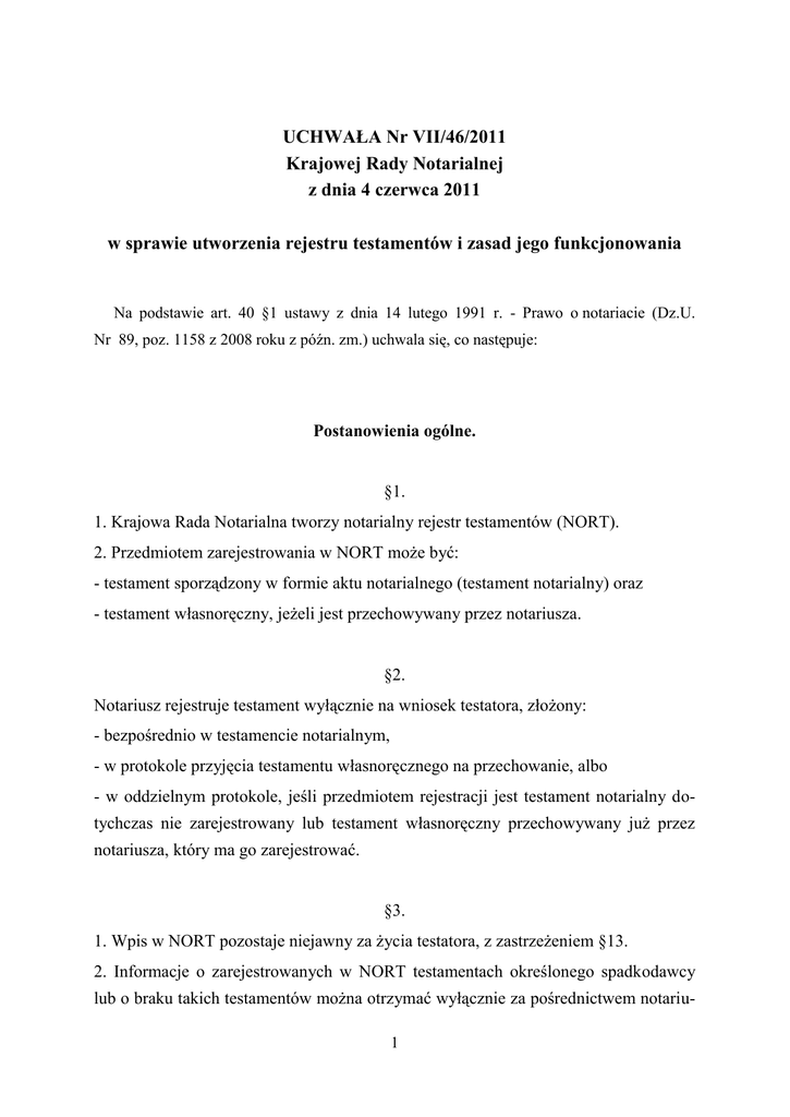 UCHWAŁA Nr VII/46/2011 Krajowej Rady Notarialnej z dnia 4 czerwca 2011 w sprawie utworzenia rejestru testamentów i zasad jego funkcjonowania Na podstawie art. 40 §1 ustawy z dnia 14 lutego 1991 r. - Prawo o notariacie (Dz.U. Nr 89, poz. 1158 z 2008 roku z późn. zm.) uchwala się, co następuje: Postanowienia ogólne. §1. 1. Krajowa Rada Notarialna tworzy notarialny rejestr testamentów (NORT). 2. Przedmiotem zarejestrowania w NORT może być: - testament sporządzony w formie aktu notarialnego (testament notarialny) oraz - testament własnoręczny, jeżeli jest przechowywany przez notariusza. §2. Notariusz rejestruje testament wyłącznie na wniosek testatora, złożony: - bezpośrednio w testamencie notarialnym, - w protokole przyjęcia testamentu własnoręcznego na przechowanie, albo - w oddzielnym protokole, jeśli przedmiotem rejestracji jest testament notarialny dotychczas nie zarejestrowany lub testament własnoręczny przechowywany już przez notariusza, który ma go zarejestrować. §3. 1. Wpis w NORT pozostaje niejawny za życia testatora, z zastrzeżeniem §13. 2. Informacje o zarejestrowanych w NORT testamentach określonego spadkodawcy lub o braku takich testamentów można otrzymać wyłącznie za pośrednictwem notariu1 sza. O udzielenie tych informacji może wystąpić każdy, kto przedstawi notariuszowi odpis aktu zgonu lub inny dokument, z którego wynika, że spadkodawca nie żyje. §4. Z przebiegu czynności dokonanych w związku z poszukiwaniem w NORT informacji, o których mowa w §3, notariusz sporządza protokół, o którym mowa w art. 104 §3 Prawa o notariacie. Funkcjonowanie rejestru. §5. 1. NORT prowadzony jest w systemie informatycznym. 2. Krajowa Rada Notarialna może powierzyć prowadzenie NORT podmiotowi, który powoła w celu prowadzenia lub obsługi rejestrów notarialnych. §6. Dostęp do NORT mają jedynie notariusze, którzy przy dokonywaniu wpisów w tym rejestrze i uzyskiwaniu zamieszczonych w nim informacji posługują się bezpiecznym podpisem elektronicznym weryfikowanym przy pomocy ważnego kwalifikowanego certyfikatu. §7. NORT obejmuje: 1) numer wynikający z kolejności wpisu w rejestrze, 2) datę dokonania wpisu, 3) datę oraz miejsce sporządzenia testamentu notarialnego lub protokołu, o którym mowa w §2, 4) imiona, nazwisko i siedzibę kancelarii notariusza, a jeżeli testament notarialny lub protokół, o którym mowa w §2 sporządził zastępca notariusza, także imiona i nazwisko zastępcy, 2 5) imiona, nazwisko, imiona rodziców oraz datę i miejsce urodzenia testatora, 6) numer PESEL testatora, jeżeli podlega on ewidencji ludności w Polsce, a w braku tego numeru inny podobny numer ewidencyjny, jeżeli został mu nadany za granicą. §8. We wniosku o zarejestrowanie testamentu powinny znajdować się wszystkie dane wymienione w §7 w punktach 3), 4) i 5), a także numer ewidencyjny testatora, jeżeli został mu nadany. §9. Notariusz zamieszcza w testamencie notarialnym lub w protokole, o którym mowa w §2 informację o możliwości zarejestrowania testamentu w NORT. Jeżeli testator sporządza lub oddaje na przechowanie testament, który według jego woli nie ma być zarejestrowany, notariusz zamieszcza w testamencie notarialnym lub w protokole, o którym mowa w §2 oświadczenie testatora o rezygnacji z możliwości zarejestrowania testamentu. §10. Po sporządzeniu testamentu notarialnego lub protokołu, o którym mowa w §2, jeżeli testator złożył wniosek o zarejestrowanie sporządzonego lub zdeponowanego testamentu, notariusz niezwłocznie rejestruje testament w NORT za pośrednictwem systemu teleinformatycznego. §11. Wniosek o udzielenie informacji z NORT powinien być sporządzony na piśmie i zawierać dane wystarczające do identyfikacji testatora. Jeżeli okaże się, że zawarte we wniosku dane dotyczyć mogą kilku osób, notariusz powinien zażądać takiego uzupełnienia danych, by udzielona odpowiedź była jednoznaczna. §12. 1. Informację o zarejestrowanych w NORT testamentach określonego spadkodawcy, 3 a także informację o braku takich testamentów, notariusz otrzymuje z NORT przy wykorzystaniu dostępu, o którym mowa w §6. 2. System do prowadzenia NORT uzależnia udzielenie odpowiedzi notariuszowi od powołania się na dokument, z którego wynika, że testator nie żyje. 3. Informacja udzielana przez NORT o każdym zarejestrowanym testamencie zawiera: 1) numer wynikający z kolejności wpisu w rejestrze, 2) datę dokonania wpisu, 3) datę oraz miejsce sporządzenia testamentu notarialnego lub protokołu, o którym mowa w §2, 4) imiona, nazwisko i siedzibę kancelarii notariusza, a jeżeli testament notarialny lub protokół, o którym mowa w §2 sporządził zastępca notariusza, także imiona i nazwisko zastępcy. 4. Informacje o wyniku przeprowadzonego poszukiwania notariusz zamieszcza w protokole, o którym mowa w §4. §13. Informacje dotyczące własnych testamentów może otrzymać, na zasadach określonych w paragrafach poprzedzających, także testator. W takim przypadku §12 ust. 2 nie stosuje się. §14. 1. Wpis testamentu w NORT wykreśla się na każdy wniosek testatora, a także z urzędu, w przypadku zwrócenia przechowywanego testamentu testatorowi. 2. Wpis testamentu w NORT może także być wykreślony po upływie 100 lat od daty jego zarejestrowania. Postanowienia końcowe. §15. 1. Przed dokonaniem pierwszego wpisu w rejestrze notariusz zobowiązany jest zaakceptować postanowienia niniejszej uchwały oraz regulaminu ustalonego przez Prezesa 4 Krajowej Rady Notarialnej. 2. Regulamin może w szczególności określać zasady wymiany informacji NORT z innymi podobnymi rejestrami, także prowadzonymi za granicą, a ponadto sposób składania i ewidencjonowania wniosków o udzielenie informacji z NORT oraz załączniki, jakie do tego wniosku muszą być dołączone. §16. System informatyczny do prowadzenia NORT stanowić będzie autorskie rozszerzenie funkcjonującego obecn