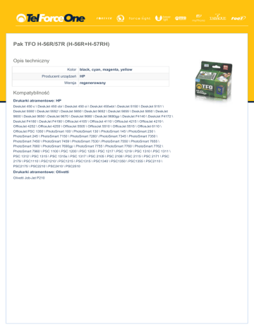 Pak TFO H-56R/57R (H-56R+H-57RH) Opis techniczny Kolor black, cyan, magenta, yellow Producent urządzeń HP Wersja regenerowany Kompatybilność Drukarki atramentowe: HP DeskJet 450 c \ DeskJet 450 cbi \ DeskJet 450 ci \ DeskJet 450wbt \ DeskJet 5150 \ DeskJet 5151 \ DeskJet 5550 \ DeskJet 5552 \ DeskJet 5650 \ DeskJet 5652 \ DeskJet 5655 \ DeskJet 5850 \ DeskJet 9600 \ DeskJet 9650 \ DeskJet 9670 \ DeskJet 9680 \ DeskJet 9680gp \ DeskJet F4140 \ DeskJet F4172 \ DeskJet F4180 \ DeskJet F4190 \ OfficeJet 4105 \ OfficeJet 4110 \ OfficeJet 4215 \ OfficeJet 4219 \ OfficeJet 4252 \ OfficeJet 4255 \ OfficeJet 5505 \ OfficeJet 5510 \ OfficeJet 5515 \ OfficeJet 6110 \ OfficeJet PSC 1350 \ PhotoSmart 100 \ PhotoSmart 130 \ PhotoSmart 145 \ PhotoSmart 230 \ PhotoSmart 245 \ PhotoSmart 7150 \ PhotoSmart 7260 \ PhotoSmart 7345 \ PhotoSmart 7350 \ PhotoSmart 7450 \ PhotoSmart 7459 \ PhotoSmart 7530 \ PhotoSmart 7550 \ PhotoSmart 7655 \ PhotoSmart 7660 \ PhotoSmart 7690gp \ PhotoSmart 7755 \ PhotoSmart 7760 \ PhotoSmart 7762 \ PhotoSmart 7960 \ PSC 1100 \ PSC 1200 \ PSC 1205 \ PSC 1217 \ PSC 1219 \ PSC 1310 \ PSC 1311 \ PSC 1312 \ PSC 1315 \ PSC 1315s \ PSC 1317 \ PSC 2105 \ PSC 2108 \ PSC 2115 \ PSC 2171 \ PSC 2179 \ PSC1110 \ PSC1210 \ PSC1215 \ PSC1315 \ PSC1340 \ PSC1350 \ PSC1355 \ PSC2110 \ PSC2175 \ PSC2210 \ PSC2410 \ PSC2510 Drukarki atramentowe: Olivetti Olivetti Job-Jet P210