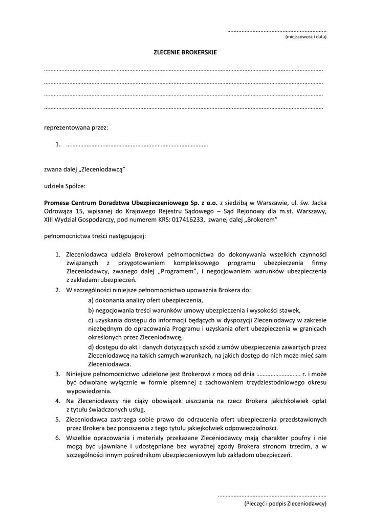 ……………………………………………………… (miejscowość i data) ZLECENIE BROKERSKIE …………………………………………………………………………………………………………………………………………………………… …………………………………………………………………………………………………………………………………………………………… …………………………………………………………………………………………………………………………………………………………… …………………………………………………………………………………………………………………………………………………………… reprezentowana przez: 1. ……………………………………………………………………………… zwana dalej „Zleceniodawcą” udziela Spółce: Promesa Centrum Doradztwa Ubezpieczeniowego Sp. z o.o. z siedzibą w Warszawie, ul. św. Jacka Odrowąża 15, wpisanej do Krajowego Rejestru Sądowego – Sąd Rejonowy dla m.st. Warszawy, XIII Wydział Gospodarczy, pod numerem KRS: 017416233, zwanej dalej „Brokerem” pełnomocnictwa treści następującej: 1. Zleceniodawca udziela Brokerowi pełnomocnictwa do dokonywania wszelkich czynności związanych z przygotowaniem kompleksowego programu ubezpieczenia firmy Zleceniodawcy, zwanego dalej „Programem”, i negocjowaniem warunków ubezpieczenia z zakładami ubezpieczeń. 2. W szczególności niniejsze pełnomocnictwo upoważnia Brokera do: a) dokonania analizy ofert ubezpieczenia, b) negocjowania treści warunków umowy ubezpieczenia i wysokości stawek, c) uzyskania dostępu do informacji będących w dyspozycji Zleceniodawcy w zakresie niezbędnym do opracowania Programu i uzyskania ofert ubezpieczenia w granicach określonych przez Zleceniodawcę, d) dostępu do akt i danych dotyczących szkód z umów ubezpieczenia zawartych przez Zleceniodawcę na takich samych warunkach, na jakich dostęp do nich może mieć sam Zleceniodawca. 3. Niniejsze pełnomocnictwo udzielone jest Brokerowi z mocą od dnia ………………………. r. i może być odwołane wyłącznie w formie pisemnej z zachowaniem trzydziestodniowego okresu wypowiedzenia. 4. Na Zleceniodawcy nie ciąży obowiązek uiszczania na rzecz Brokera jakichkolwiek opłat z tytułu świadczonych usług. 5. Zleceniodawca zastrzega sobie prawo do odrzucenia ofert ubezpieczenia przedstawionych przez Brokera bez ponoszenia z tego tytułu jakiejkolwiek odpowiedzialności. 6. Wszelkie opracowania i materiały przekazane Zleceniodawcy mają charakter poufny i nie mogą być ujawniane i udostępniane bez wyraźnej zgody Brokera stronom trzecim, a w szczególności innym pośrednikom ubezpieczeniowym lub zakładom ubezpieczeń. …………………………………………………………… (Pieczęć i podpis Zleceniodawcy)