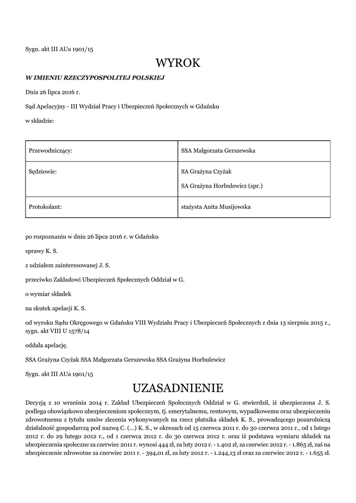 Sygn. akt III AUa 1901/15 WYROK W IMIENIU RZECZYPOSPOLITEJ POLSKIEJ Dnia 26 lipca 2016 r. Sąd Apelacyjny - III Wydział Pracy i Ubezpieczeń Społecznych w Gdańsku w składzie: Przewodniczący: SSA Małgorzata Gerszewska Sędziowie: SA Grażyna Czyżak SA Grażyna Horbulewicz (spr.) Protokolant: stażysta Anita Musijowska po rozpoznaniu w dniu 26 lipca 2016 r. w Gdańsku sprawy K. S. z udziałem zainteresowanej J. S. przeciwko Zakładowi Ubezpieczeń Społecznych Oddział w G. o wymiar składek na skutek apelacji K. S. od wyroku Sądu Okręgowego w Gdańsku VIII Wydziału Pracy i Ubezpieczeń Społecznych z dnia 13 sierpnia 2015 r., sygn. akt VIII U 1578/14 oddala apelację. SSA Grażyna Czyżak SSA Małgorzata Gerszewska SSA Grażyna Horbulewicz Sygn. akt III AUa 1901/15 UZASADNIENIE Decyzją z 10 września 2014 r. Zakład Ubezpieczeń Społecznych Oddział w G. stwierdził, iż ubezpieczona J. S. podlega obowiązkowo ubezpieczeniom społecznym, tj. emerytalnemu, rentowym, wypadkowemu oraz ubezpieczeniu zdrowotnemu z tytułu umów zlecenia wykonywanych na rzecz płatnika składek K. S., prowadzącego pozarolniczą działalność gospodarczą pod nazwą C. (...) K. S., w okresach od 15 czerwca 2011 r. do 30 czerwca 2011 r., od 1 lutego 2012 r. do 29 lutego 2012 r., od 1 czerwca 2012 r. do 30 czerwca 2012 r. oraz iż podstawa wymiaru składek na ubezpieczenia społeczne za czerwiec 2011 r. wynosi 444 zł, za luty 2012 r. - 1.402 zł, za czerwiec 2012 r. - 1.865 zł, zaś na ubezpieczenie zdrowotne za czerwiec 2011 r. - 394,01 zł, za luty 2012 r. - 1.244,13 zł oraz za czerwiec 2012 r. - 1.655 zł. W odwołaniu od powyższej decyzji ubezpieczony K. S. domagał się jej zmiany poprzez ustalenie, iż zainteresowana J. S. nie podlegała obowiązkowi ubezpieczeń społecznych z tytułu umów zawieranych z płatnikiem składek. W odpowiedzi na odwołanie pozwany wniósł o jego oddalenie. Postanowieniem z 5 marca 2015 r. Sąd wezwał do udziału w sprawie w charakterze zainteresowanej J. S.. Wyrokiem z dnia 13 sierpnia 2015 r. Sąd Okręgowy w Gdańsku VIII Wydział Pracy i Ubezpieczeń Społecznych oddalił odwołanie i zasądził od C. (...) K. S. w G. na rzecz pozwanego kwotę 1200 zł tytułem zwrotu kosztów zastępstwa procesowego. Uzasadniając swoje stanowisko Sąd wskazał, że K. S. prowadzi pozarolniczą działalność gospodarczą pod nazwą Centrum (...). W ramach prowadzonej działalności realizuje programy badawcze służące celom marketingowym. Ubezpieczony, w ramach prowadzonej działalności gospodarczej, zawarł w dniach 15 czerwca 2011 r., 1 lutego 2012 r. oraz 1 czerwca 2012 r. z zainteresowaną J. S. umowy zatytułowane „umowa o dzieło”. W umowach tych zainteresowana zobowiązała się „wykonać dzieło polegające na realizacji i koordynacji badań”. Terminy wykonania pracy strony określiły w § 2 tych umów, tj. od 15 czerwca 2011 r. do 30 czerwca 2011 r., od 1 lutego 2012 r. do 29 lutego 2012 r. oraz od 1 czerwca 2012 r. do 30 czerwca 2012 r. W § 3 strony i § 4 strony dokonały ustaleń dotyczących wynagrodzenia, tj. jego wysokości, płatności przelewem, po wykonaniu dzieła, w terminie 14 dni od złożenia rachunku przez zainteresowaną. § 5 dotyczył zmian w umowie – „tylko za pisemną zgodą stron”. § 6 stanowił o zastosowaniu przepisów kodeksu cywilnego, § 7 o sporządzeniu umów w dwóch jednobrzmiących egzemplarzach. Przedmiotem umów z 15 czerwca 2011 r. i z 1 czerwca 2012 r. było opracowanie przez zainteresowaną raportu z badania marketingowego dotyczącego jakości obsługi w sieci salonów samochodowych w Polsce. Tzw. tajemniczy klient dokonywał obserwacji w tych salonach samochodowych. Po dokonanej obserwacji wypełniał ankietę oceniającą obsługę w salonie. Zainteresowana opracowywała raport podsumowujący te obserwacje, spisywała wnioski oraz dokonywała analizy statystycznej. Następnie raport został przekazany klientowi firmy ubezpieczonego, dla którego dane badanie zostało wykonane. Przedmiotem umowy z 1 lutego 2012 r. było opracowanie przez zainteresowaną wniosków z badania satysfakcji pracowników jednego z przedsiębiorstw oraz przetłumaczenie raportu na język angielski. W lutym 2012 r. zainteresowana nie opracowywała raportu. Pracę na rzecz ubezpieczonego zainteresowana wykonała w domu z wykorzystaniem własnych narzędzi pracy. Ubezpieczony nie zgłosił zainteresowanej do ubezpieczeń społecznych oraz ubezpieczenia zdrowotnego. Od umów zawartych z zainteresowaną K. S. nie odprowadził składek na ubezpieczenia społeczne oraz na ubezpieczenie zdrowotne. Przedmiotem postępowania była odmienność w dokonaniu przez strony niniejszego procesu subsumpcji okoliczności faktycznych sprawy pod przepisy ustawy z dnia 13 października 1998 r. o systemie ubezpieczeń społecznych (t.j. Dz. U. z 2015 r., poz. 121 ze zm.), regulujące zagadnienie podlegania obowiązkowym ubezpieczeniom społecznym. Dla rozstrzygnięcia niniejszej sprawy konieczne było ustalenie, jakie umowy cywilnoprawne łączyły zainteresowaną J. S. z ubezpieczonym K. S. w ramach prowadzonej przez niego pozarolniczej działalności gospodarczej Centrum (...). Oceny powyższej dokonać należało w oparciu o przepisy kodeksu cywilnego, zawierającego regulacje obydwu typu umów, zarówno umowy o dzieło (art. 627 – 646 k.c.), jak i umowy zlecenia (art. 734 – 751 k.c.). Mając na uwadze treść powołanych przepisów, Sąd doszedł do przekonania, że okoliczności zawarcia umów między J. S. a K. S. przemawiają za tym, iż umowy te miały w zamiarze stron charakter umów starannego działania, nie zaś umów rezultatu. J. S., w ramach zawartych umów cywilnoprawnych, zobowiązała się do wykonywania prac dotyczących realizacji i koordynacji badań marketingowych – opracowywała raport z badania marketingowego podsumowujący obserwacje tzw. tajemniczego klienta, spisywała wnioski, dokonywała analizy statystycznej, opraco
