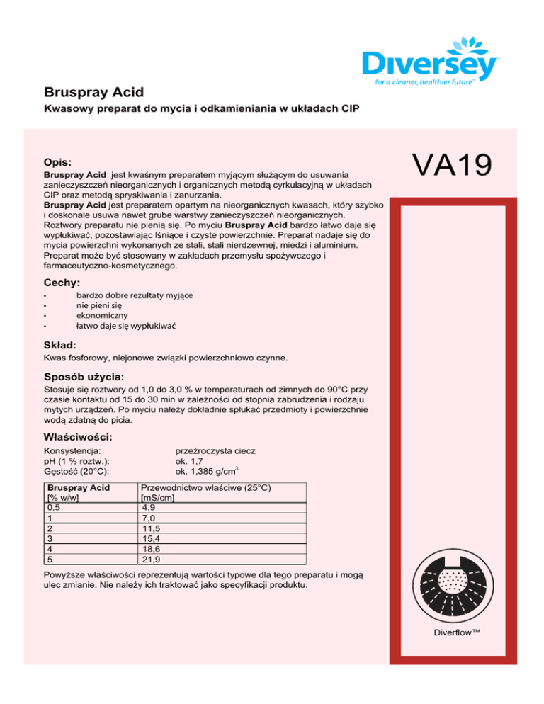 Bruspray Acid Kwasowy preparat do mycia i odkamieniania w układach CIP Opis: Bruspray Acid jest kwaśnym preparatem myjącym służącym do usuwania zanieczyszczeń nieorganicznych i organicznych metodą cyrkulacyjną w układach CIP oraz metodą spryskiwania i zanurzania. Bruspray Acid jest preparatem opartym na nieorganicznych kwasach, który szybko i doskonale usuwa nawet grube warstwy zanieczyszczeń nieorganicznych. Roztwory preparatu nie pienią się. Po myciu Bruspray Acid bardzo łatwo daje się wypłukiwać, pozostawiając lśniące i czyste powierzchnie. Preparat nadaje się do mycia powierzchni wykonanych ze stali, stali nierdzewnej, miedzi i aluminium. Preparat może być stosowany w zakładach przemysłu spożywczego i farmaceutyczno-kosmetycznego. VA19 Cechy: • • • • bardzo dobre rezultaty myjące nie pieni się ekonomiczny łatwo daje się wypłukiwać Skład: Kwas fosforowy, niejonowe związki powierzchniowo czynne. Sposób użycia: Stosuje się roztwory od 1,0 do 3,0 % w temperaturach od zimnych do 90°C przy czasie kontaktu od 15 do 30 min w zależności od stopnia zabrudzenia i rodzaju mytych urządzeń. Po myciu należy dokładnie spłukać przedmioty i powierzchnie wodą zdatną do picia. Właściwości: Konsystencja: pH (1 % roztw.): Gęstość (20°C): Bruspray Acid [% w/w] 0,5 1 2 3 4 5 przeźroczysta ciecz ok. 1,7 ok. 1,385 g/cm3 Przewodnictwo właściwe (25°C) [mS/cm] 4,9 7,0 11,5 15,4 18,6 21,9 Powyższe właściwości reprezentują wartości typowe dla tego preparatu i mogą ulec zmianie. Nie należy ich traktować jako specyfikacji produktu. Diverflow™ Bruspray Acid Środki ostrożności: Kompletne informacje odnośnie środków ostrożności wymaganych przy pracy z preparatem Bruspray Acid znajdują się w karcie charakterystyki preparatu. UWAGA: Preparat przeznaczony do profesjonalnego stosowania. Dokładny sposób użycia preparatu, dostosowany do Państwa potrzeb określi nasz przedstawiciel. Postępowanie z odpadami Zapobiegać przedostawaniu się nierozcieńczonego produktu do ścieków, wód powierzchniowych i wód gruntowych. Produkt zużyć w całości. Niewielkie ilości niewykorzystanego produktu rozcieńczyć wodą do stężenia najwyżej 1%, odprowadzić do kanalizacji. Większe ilości przekazywać do utylizacji specjalistycznej firmie. Opróżnione opakowania przepłukać dwukrotnie wodą i przeznaczyć do recyklingu. Warunki przechowywania Produkt przechowywać wyłącznie w oryginalnych, szczelnie zamkniętych i właściwie oznakowanych opakowaniach, w suchych i odpowiednio wentylowanych pomieszczeniach. Nie przechowywać poniżej 5ºC i w wysokich temperaturach. Przechowywać z dala od źródeł ciepła, nie wystawiać na bezpośrednie działanie promieni słonecznych. Okres trwałości 24 miesiące od daty produkcji (na opakowaniu). Instrukcja miareczkowania Sprzęt biureta pipeta 10 ml gruszka ssawna Kolba stożkowa (Elrlenmeyera) Roztwory wskaźnik fenoloftaleina roztwór 0,1N ługu sodowego (NaOH) Wykonanie 10 ml badanego roztworu (odmierzyć pipetą) umieścić w kolbie erlenmeyerce. Dodać 3 krople roztworu fenoloftaleiny (roztwór Nr 5) - roztwór badany pozostaje bezbarwny. Następnie należy dodawać po kropli roztwór 0.1N NaOH cały czas mieszając zawartością kolby, aż do zmiany zabarwienia roztworu na kolor malinowy. Zanotować ilość mililitrów roztworu 0.1N NaOH zużytego na zmiareczkowanie analizowanego roztworu preparatu. Obliczenia współczynnik miareczkowania - 0,093 ilość ml 0,1N NaOH x 0,093 = stężenie preparatu Bruspray Acid w %wag. Diversey Polska Sp. z o.o. ul. Fabryczna 5 00-446 Warszawa Tel.: 22 328 10 00 Fax: 22 328 10 01 www.diversey.com P00166XFEN-03 © Copyright 2011 Diversey 2
