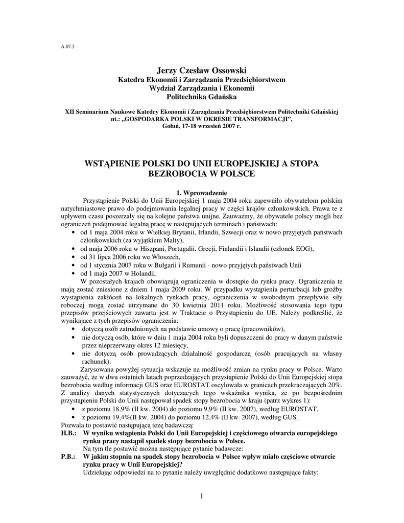 A.07.3 Jerzy Czesław Ossowski Katedra Ekonomii i Zarz dzania Przedsi biorstwem Wydział Zarz dzania i Ekonomii Politechnika Gda ska XII Seminarium Naukowe Katedry Ekonomii i Zarz dzania Przedsi biorstwem Politechniki Gda skiej nt.: „GOSPODARKA POLSKI W OKRESIE TRANSFORMACJI”, Gołu , 17-18 wrzesie 2007 r. WST PIENIE POLSKI DO UNII EUROPEJSKIEJ A STOPA BEZROBOCIA W POLSCE 1. Wprowadzenie Przyst pienie Polski do Unii Europejskiej 1 maja 2004 roku zapewniło obywatelom polskim natychmiastowe prawo do podejmowania legalnej pracy w cz ci krajów członkowskich. Prawa te z upływem czasu poszerzały si na kolejne pa stwa unijne. Zauwa my, e obywatele polscy mogli bez ogranicze podejmowa legaln prac w nast puj cych terminach i pa stwach: • od 1 maja 2004 roku w Wielkiej Brytanii, Irlandii, Szwecji oraz w nowo przyj tych pa stwach członkowskich (za wyj tkiem Malty), • od maja 2006 roku w Hiszpani, Portugalii, Grecji, Finlandii i Islandii (członek EOG), • od 31 lipca 2006 roku we Włoszech, • od 1 stycznia 2007 roku w Bułgarii i Rumunii - nowo przyj tych pa stwach Unii • od 1 maja 2007 w Holandii. W pozostałych krajach obowi zuj ograniczenia w dost pie do rynku pracy. Ograniczenia te maj zosta zniesione z dniem 1 maja 2009 roku. W przypadku wyst pienia perturbacji lub gro by wyst pienia zakłóce na lokalnych rynkach pracy, ograniczenia w swobodnym przepływie siły roboczej mog zosta utrzymane do 30 kwietnia 2011 roku. Mo liwo stosowania tego typu przepisów przej ciowych zawarta jest w Traktacie o Przyst pieniu do UE. Nale y podkre li , e wynikajace z tych przepisów ograniczenia: • dotycz osób zatrudnionych na podstawie umowy o prac (pracowników), • nie dotycz osób, które w dniu 1 maja 2004 roku byli dopuszczeni do pracy w danym pa stwie przez nieprzerwany okres 12 miesi cy, • nie dotycz osób prowadz cych działalno gospodarcz (osób pracuj cych na własny rachunek). Zarysowana powy ej sytuacja wskazuje na mo liwo zmian na rynku pracy w Polsce. Warto zauwa y , e w dwu ostatnich latach poprzedzaj cych przyst pienie Polski do Unii Europejskiej stopa bezrobocia według informacji GUS oraz EUROSTAT oscylowała w granicach przekraczaj cych 20%. Z analizy danych statystycznych dotycz cych tego wska nika wynika, e po bezpo rednim przyst pieniu Polski do Unii nast pował spadek stopy bezrobocia w kraju (patrz wykres 1): • z poziomu 18,9% (II kw. 2004) do poziomu 9,9% (II kw. 2007), według EUROSTAT, • z poziomu 19,4%(II kw. 2004) do poziomu 12,4% (II kw. 2007), według GUS. Pozwala to postawi nast puj c tez badawcz : H.B.: W wyniku wst pienia Polski do Unii Europejskiej i cz ciowego otwarcia europejskiego rynku pracy nast pił spadek stopy bezrobocia w Polsce. Na tym tle postawi mo na nast puj ce pytanie badawcze: P.B.: W jakim stopniu na spadek stopy bezrobocia w Polsce wpływ miało cz ciowe otwarcie rynku pracy w Unii Europejskiej? Udzielaj c odpowiedzi na to pytanie nale y uwzgl dni dodatkowo nast puj ce fakty: 1 • • • przeci tna roczna stopa wzrostu PKB zmieniła si z poziomu 3,0 % w latach 2000-2004 do poziomu 5,0% w latach 2005-2007 (II kwartał), przeci tna roczna stopa wzrostu zatrudnienia w Polsce zmieniła si z poziomu ujemnego wynosz cego -1,93% w latach 2000-2004 do poziomu dodatniego wynosz cego 3,07% w latach 2005-2007 (II kwartał), według danych EUROSTAT, przeci tna roczna stopa wzrostu zatrudnienia w Polsce zmieniła si z poziomu ujemnego wynosz cego -1,96% w latach 2000-2004 do poziomu dodatniego wynosz cego 1,55% w latach 2005-2007 (II kwartał), według danych GUS. Wykres 1 Stopy bezrobocia SU (wg. EUROSTAT) i SB (wg. GUS) oraz wzrostu PKB (SPKB) w Polsce 25 20 SU SB SPKB 15 10 5 0 4 1 2 1 3 2 2 3 4 3 1 4 1 4 7Q 97Q 98Q 99Q 00Q 00Q 01Q 02Q 03Q 03Q 04Q 05Q 06Q 06Q 9 19 19 20 20 20 20 20 19 19 20 20 20 20 20 2. Koncepcja przyczynowo-skutkowego modelu bezrobocia – przypadek zamkni tego rynku pracy Punktem wyj cia przy formułowaniu koncepcji przyczynowo-skutkowego modelu bezrobocia w warunkach zamkni tego rynku pracy jest nast puj ca definicja stopy bezrobocia (ut): ut = LFt − N t N = 1 − t = u N t , LFt LFt LFt (−) (+) (1) gdzie: LFt - wielko zasobów siły roboczej na koniec okresu t, Nt - wielko zasobu osób zatrudnionych na koniec okresu t. Z przedstawionej formuły zdefiniowania stopy bezrobocia wynika, e stopa ta jest: • ujemn funkcj liczby osób zatrudnionych w gospodarce narodowej (Nt), • dodatni funkcj zasobów siły roboczej (LFt – aktywnych zawodowo) Zauwa my, e wielko zasobów siły roboczej (LF) na koniec okresu t zale y od: • wielko ci zasobów siły roboczej z ko ca okresu t-1, • strumienia przypływu siły roboczej w okresie t (SpLF) (absolwenci szkół wkraczaj cy na rynek pracy, osoby w wieku produkcyjnym uaktywniaj ce si zawodowo, obcokrajowcy oficjalnie zatrudniani,...) • strumienia odpływu siły roboczej w okresie t (SoLF)(osoby przechodz ce na emerytur , osoby okresowo opuszczaj ce rynek pracy, emigracja zarobkowa,...). Z powy szego wynika, e: 2 LFt = LFt −1 + SpLFt − SoLFt (2) Oznacza to, ze przyrost zasobów siły roboczej jest ró nic pomi dzy strumieniem przypływu siły roboczej a strumieniem odpływu z rynku pracy, co mo emy zapisa w nast puj cy sposób: ∆LFt = LFt − LFt −1 = SpLFt − SoLFt (3) Uznajmy, e czynnikami decyduj cymi o zmianie zasobów siły roboczej s czynniki demograficzne. Je li w rozpatrywanym horyzoncie czasu obserwujemy ustabilizowany poziom liczby ludno ci kraju, to mo emy przyj zało enie upraszczaj ce w my l którego, zasoby siły roboczej z dokładno ci do czynnika losowego s wielko ci stał 1. W tej sytuacji wyra enie (3) zapisa mo emy nast puj co: ∆LFt = 0 ⇔ LFt = F = const . (4) Przy przyj tym powy ej zało eniu, zdefiniowan w (1), stop bezrobocia dla kolejnych okresów zapiszemy nast puj co: ut = u t −1 F − Nt 1 = 1 − Nt F F F − N −1t 1 = = 1 − N t −1 F F N t = F (1 − u t ) N t −1 = F (1 − u t −1 ) (5.1) (5.2) Odejmuj c stronami od w