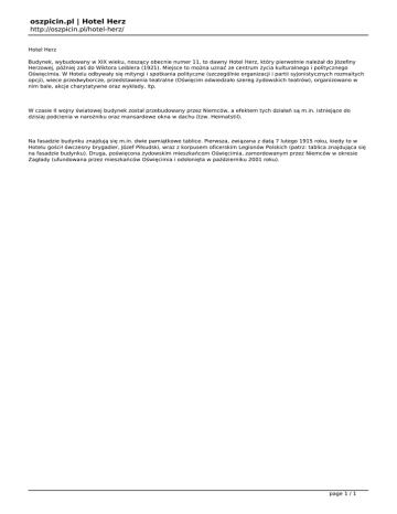 oszpicin.pl | Hotel Herz http://oszpicin.pl/hotel-herz/ Hotel Herz Budynek, wybudowany w XIX wieku, noszący obecnie numer 11, to dawny Hotel Herz, który pierwotnie należał do Józefiny Herzowej, później zaś do Wiktora Leiblera (1921). Miejsce to można uznać ze centrum życia kulturalnego i politycznego Oświęcimia. W Hotelu odbywały się mityngi i spotkania polityczne (szczególnie organizacji i partii syjonistycznych rozmaitych opcji), wiece przedwyborcze, przedstawienia teatralne (Oświęcim odwiedzało szereg żydowskich teatrów), organizowano w nim bale, akcje charytatywne oraz wykłady, itp. W czasie II wojny światowej budynek został przebudowany przez Niemców, a efektem tych działań są m.in. istniejące do dzisiaj podcienia w narożniku oraz mansardowe okna w dachu (tzw. Heimatstil). Na fasadzie budynku znajdują się m.in. dwie pamiątkowe tablice. Pierwsza, związana z datą 7 lutego 1915 roku, kiedy to w Hotelu gościł ówczesny brygadier, Józef Piłsudski, wraz z korpusem oficerskim Legionów Polskich (patrz: tablica znajdująca się na fasadzie budynku). Druga, poświęcona żydowskim mieszkańcom Oświęcimia, zamordowanym przez Niemców w okresie Zagłady (ufundowana przez mieszkańców Oświęcimia i odsłonięta w październiku 2001 roku). page 1 / 1