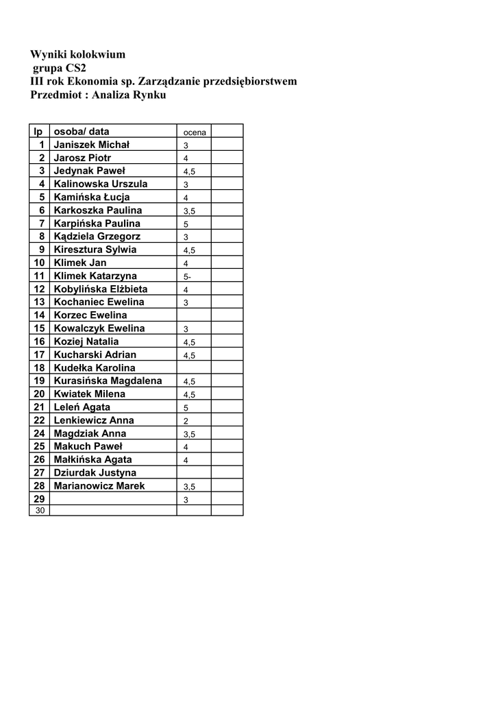 Wyniki kolokwium grupa CS2 III rok Ekonomia sp. Zarządzanie przedsiębiorstwem Przedmiot : Analiza Rynku lp 1 2 3 4 5 6 7 8 9 10 11 12 13 14 15 16 17 18 19 20 21 22 24 25 26 27 28 29 30 osoba/ data Janiszek Michał Jarosz Piotr Jedynak Paweł Kalinowska Urszula Kamińska Łucja Karkoszka Paulina Karpińska Paulina Kądziela Grzegorz Kiresztura Sylwia Klimek Jan Klimek Katarzyna Kobylińska ElŜbieta Kochaniec Ewelina Korzec Ewelina Kowalczyk Ewelina Koziej Natalia Kucharski Adrian Kudełka Karolina Kurasińska Magdalena Kwiatek Milena Leleń Agata Lenkiewicz Anna Magdziak Anna Makuch Paweł Małkińska Agata Dziurdak Justyna Marianowicz Marek ocena 3 4 4,5 3 4 3,5 5 3 4,5 4 54 3 3 4,5 4,5 4,5 4,5 5 2 3,5 4 4 3,5 3
